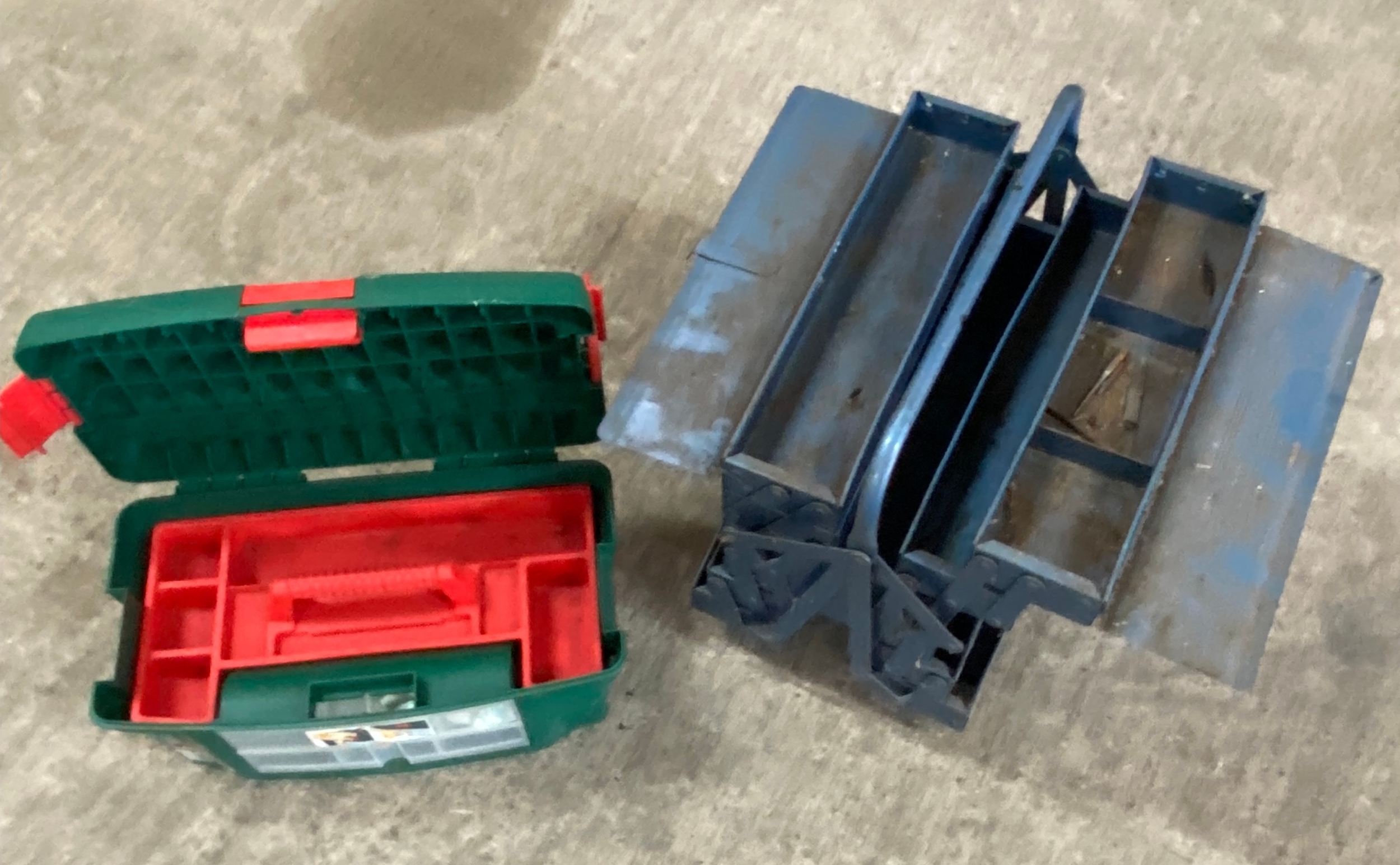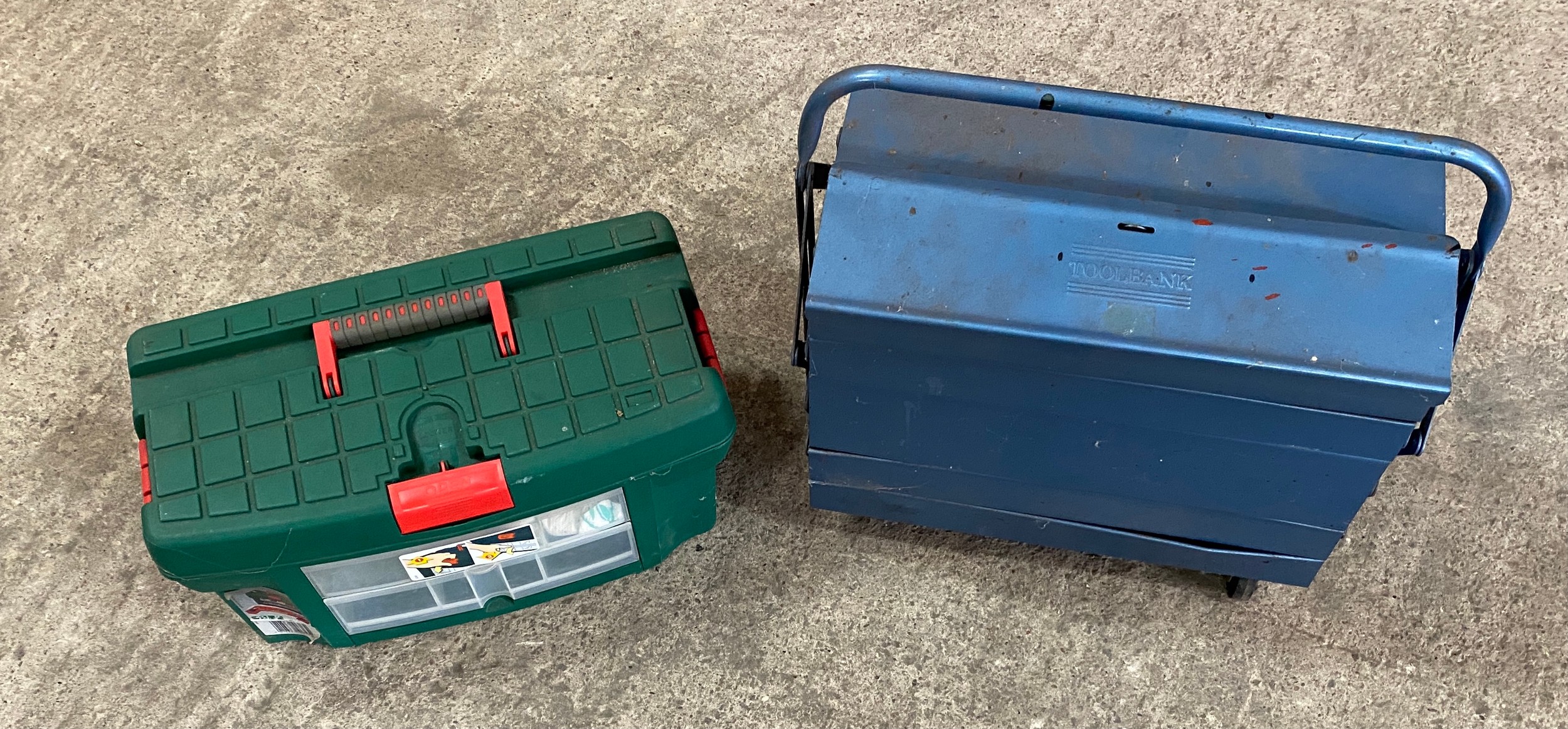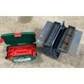 Metal toolbox on wheels, plastic toolbox, no contents
