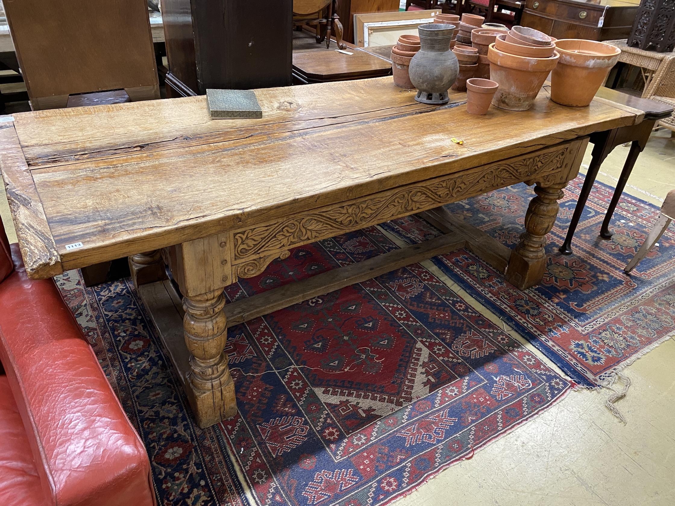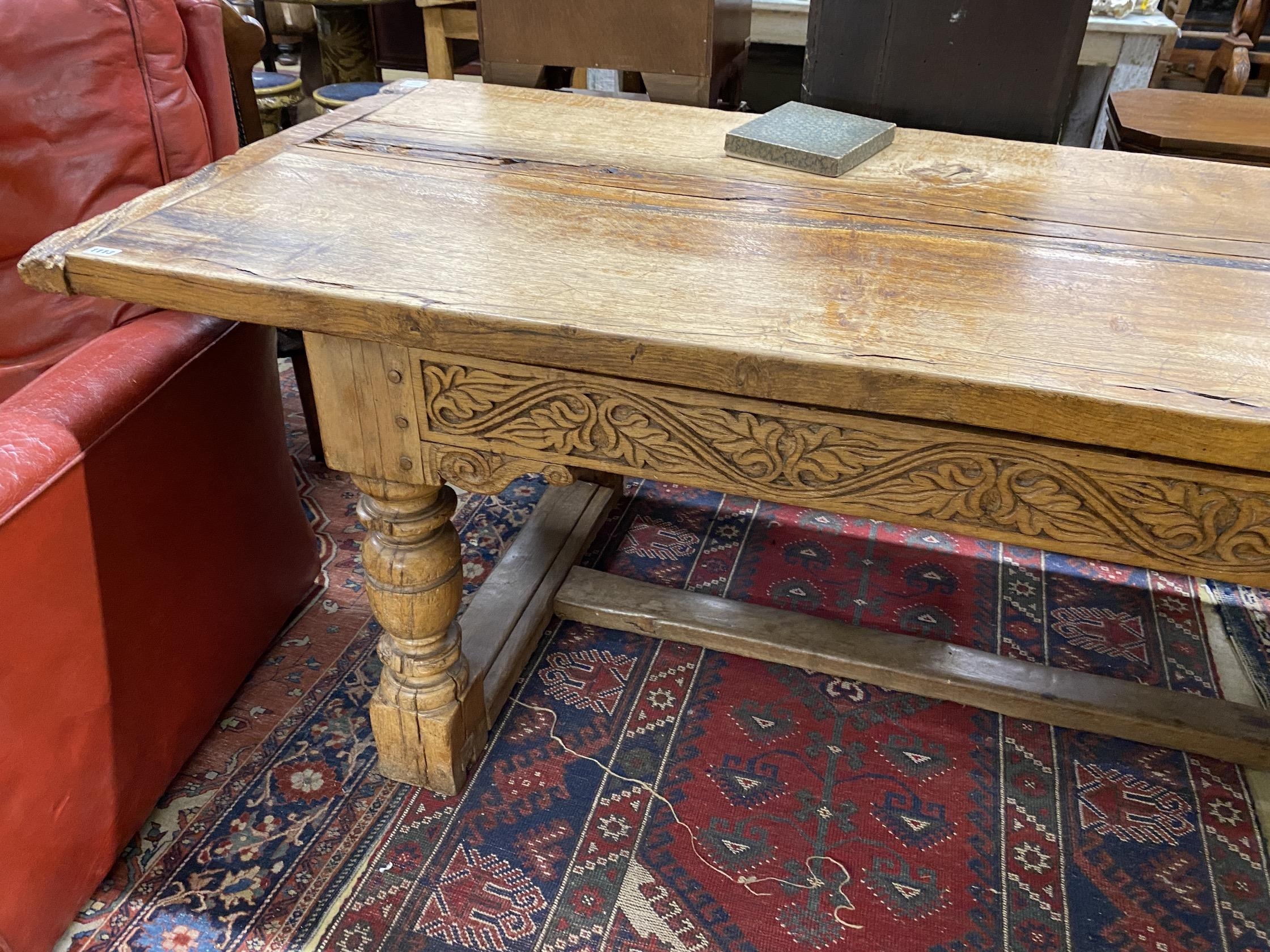 A 17th century and later oak refectory dining table, length 222cm, depth 85cm, height 77cm