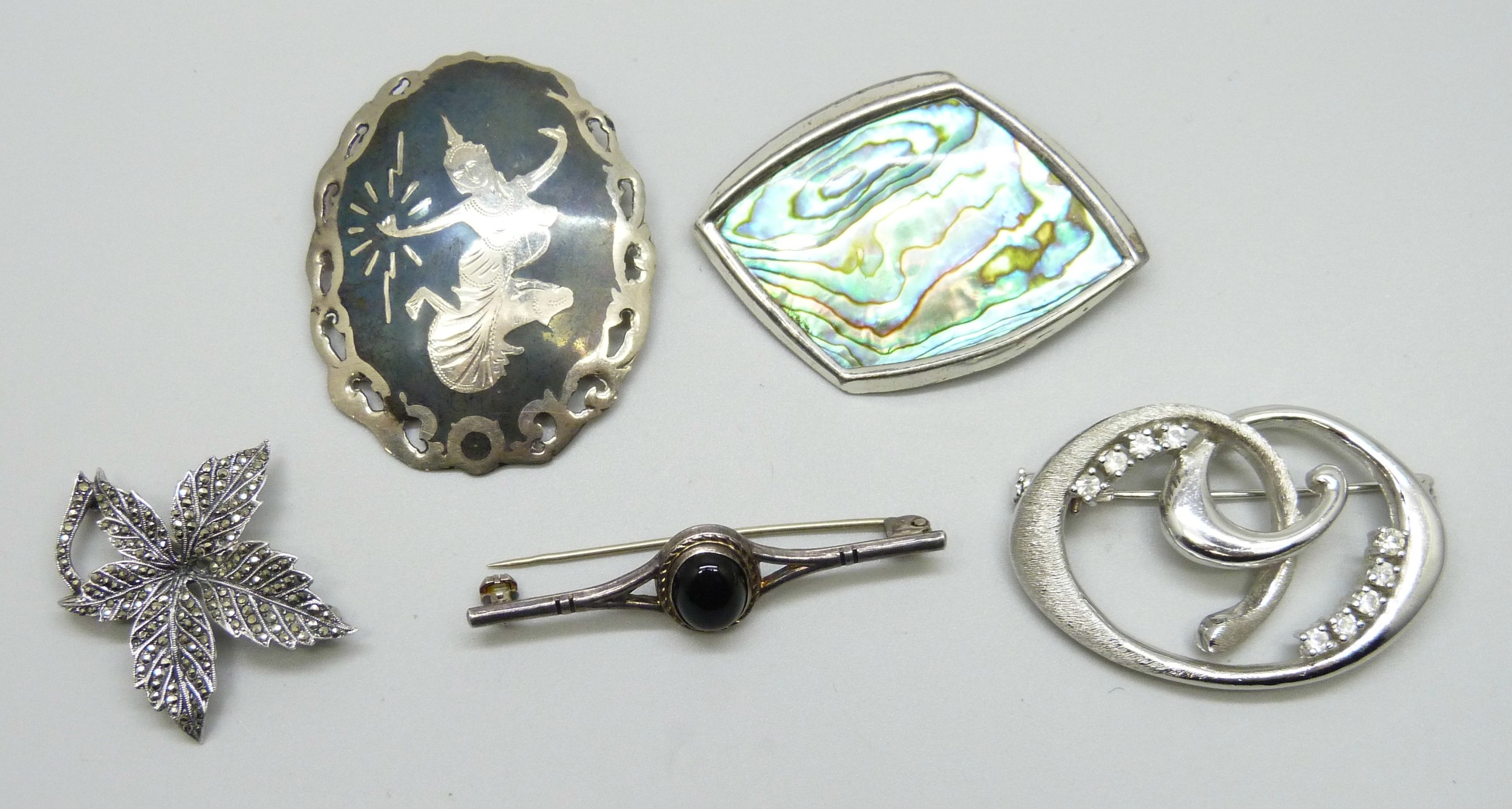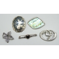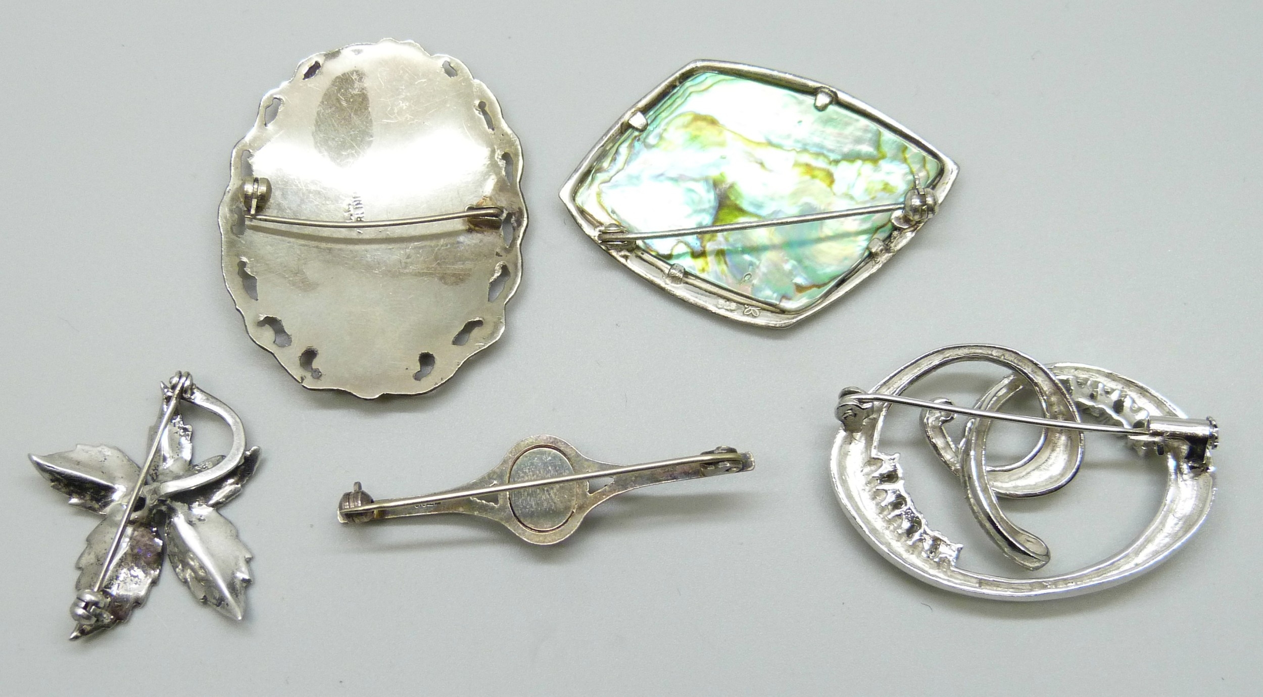 A collection of five silver brooches including abalone, 40g total