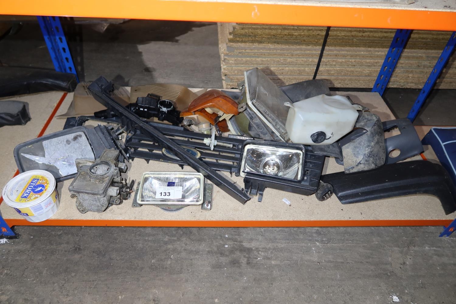 A quantity of various Ford parts including a carburettor, a head light etc. Contents of 1 shelf