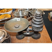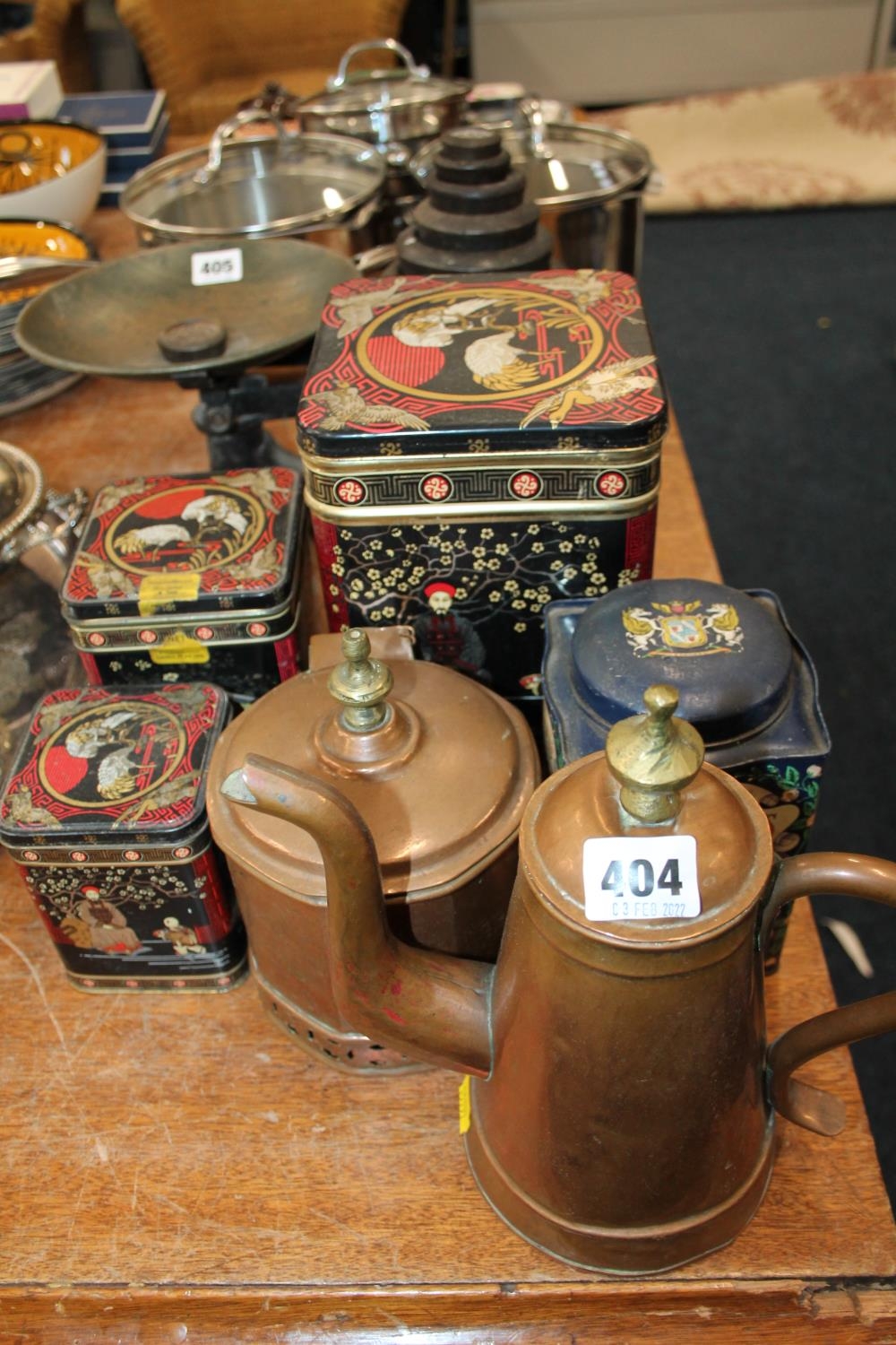 Copper jug, a copper biscuit barrel and four vintage tins.
