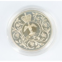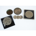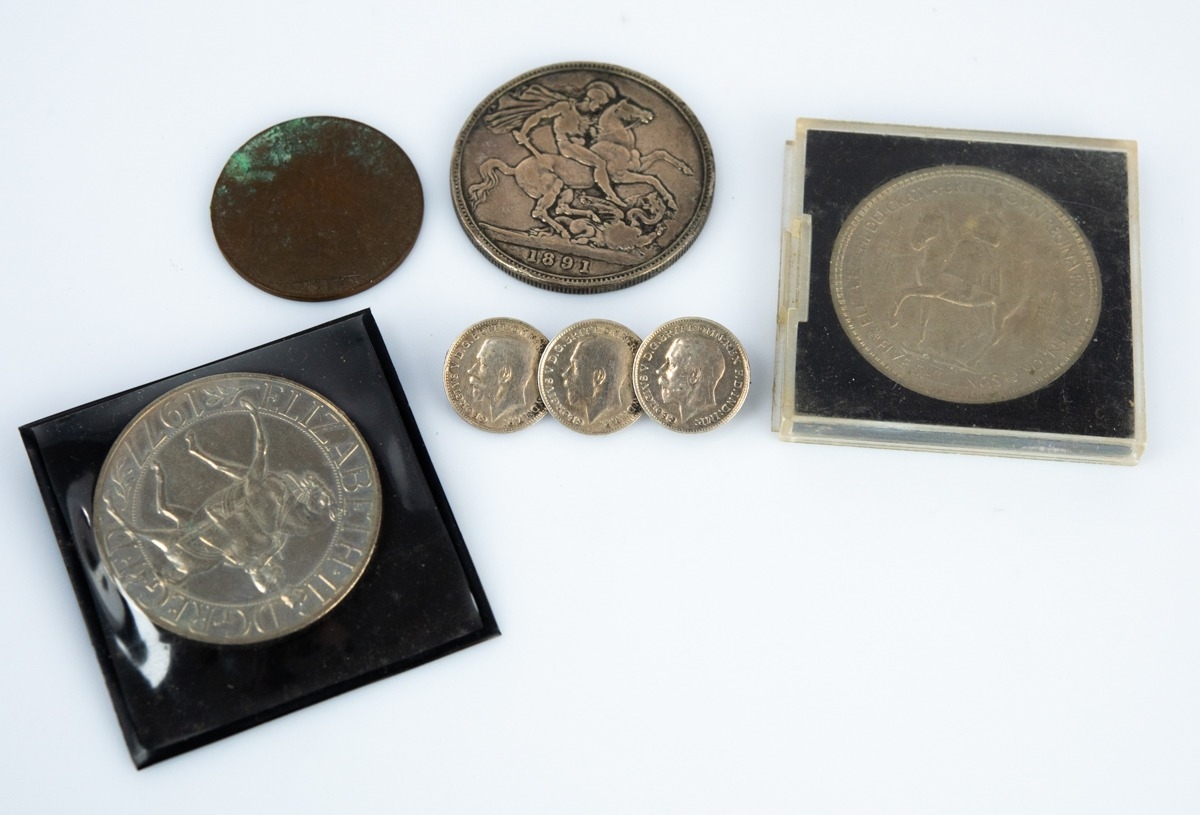 VICTORIAN SILVER 1891 CROWN (FIVE SHILLING) COIN; ELIZABETH II 1953 CORONATION CROWN; 1977 SILVER JUBILEE CROWN; GEORGE V PENNY 1916; and a BROOCH FORMED FROM THE GEORGE V SILVER THREE PENNY COIN circa 1916 (5)