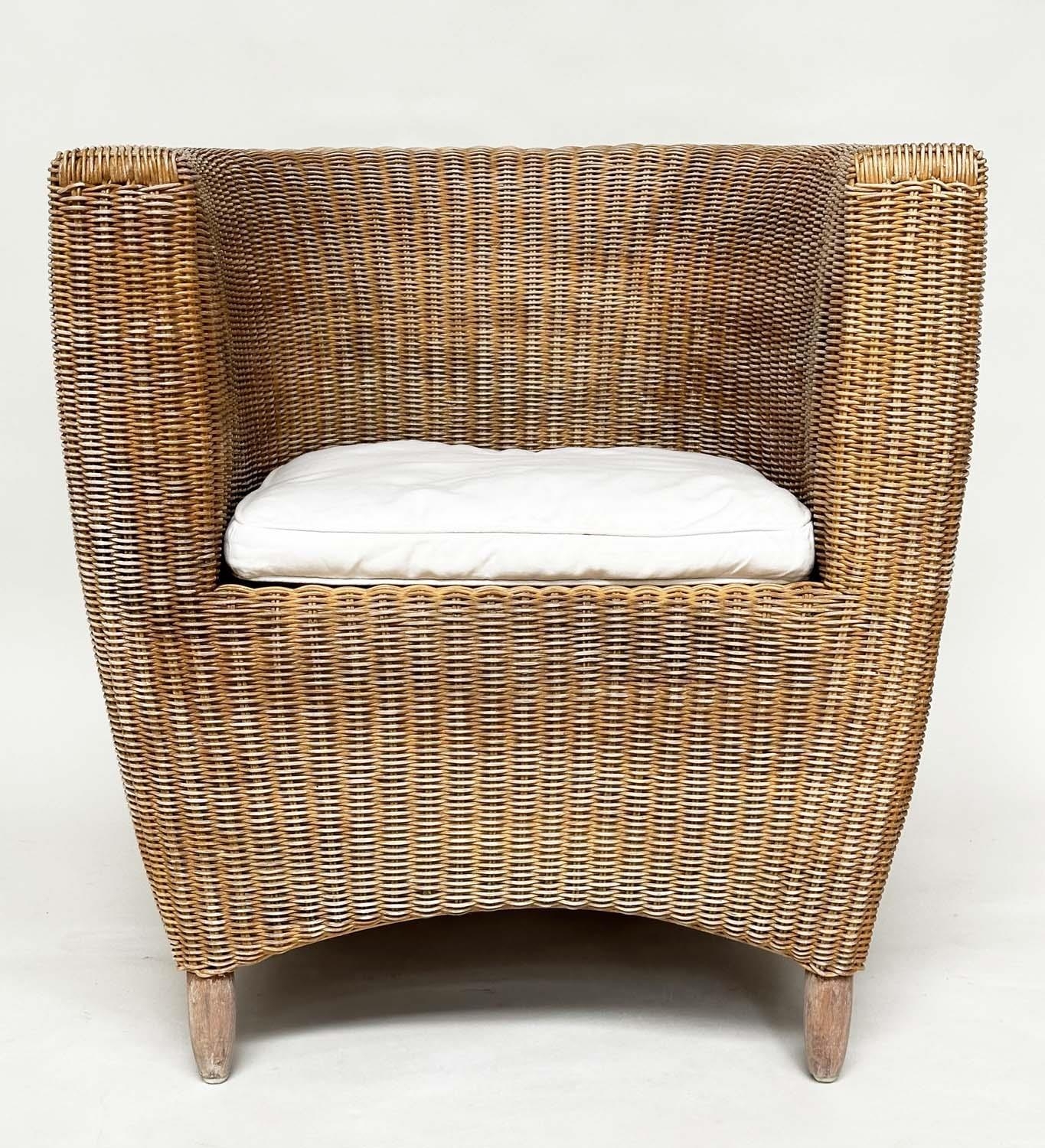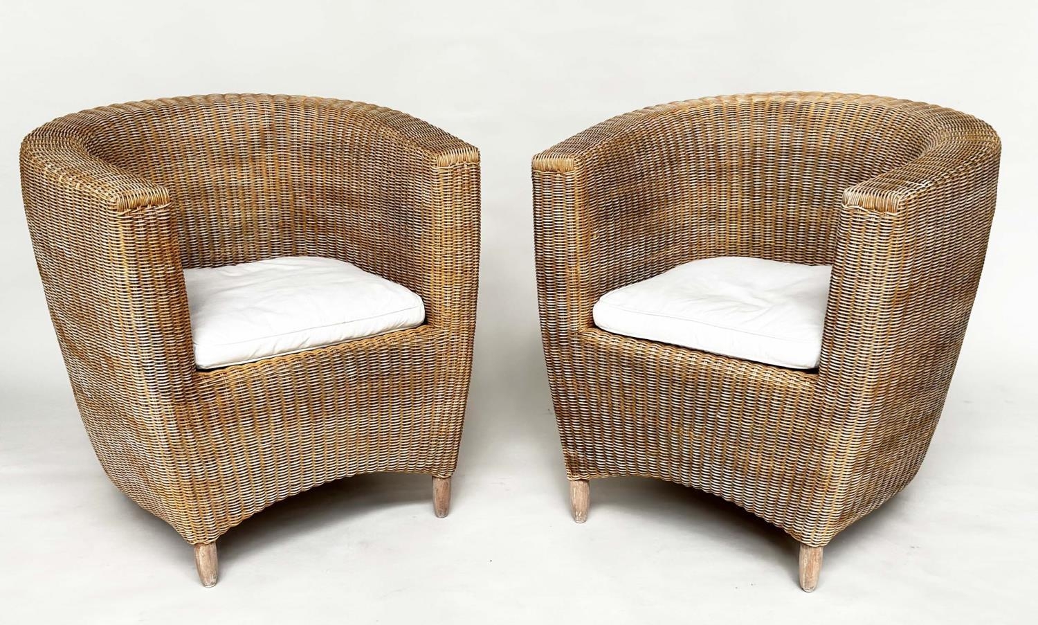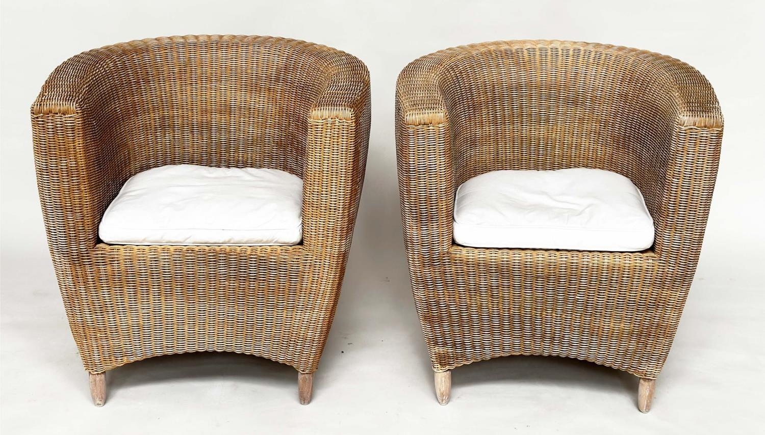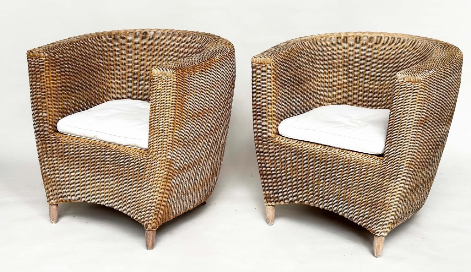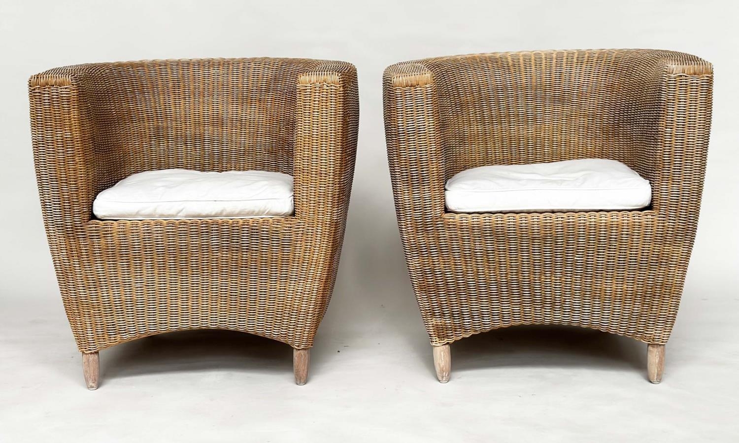 HEALS CONSERVATORY ARMCHAIRS, a pair, rattan framed and cane woven panelled with rounded backs and cushions by 'Heals of London', 72cm W. (2)