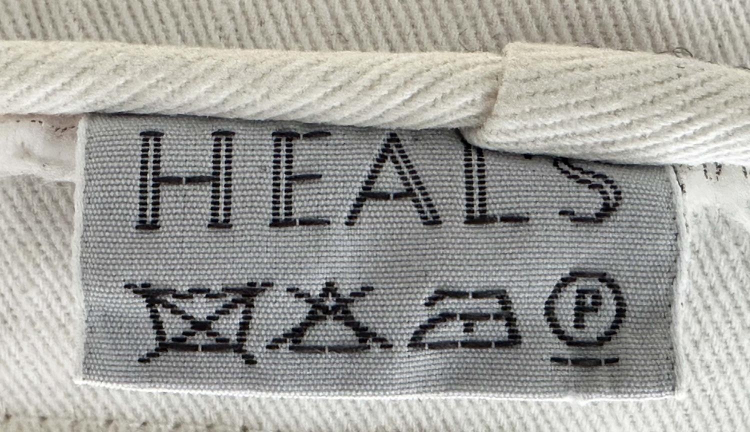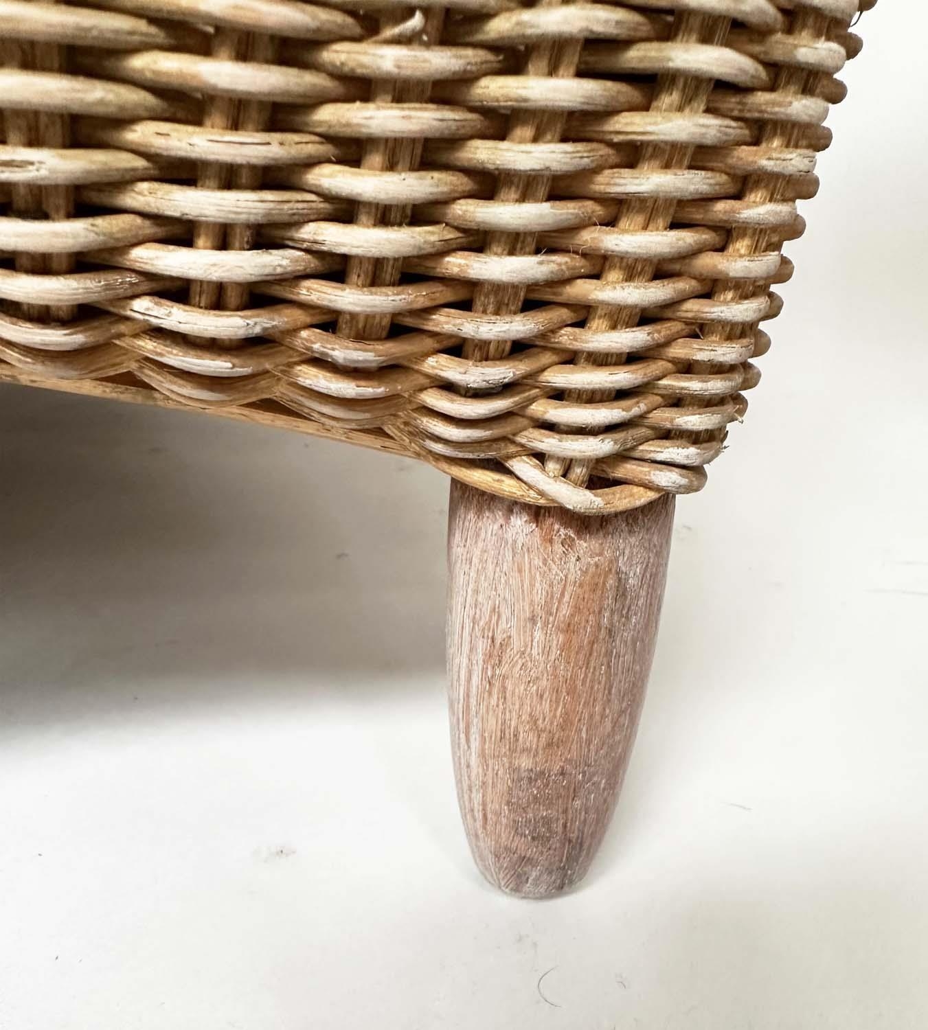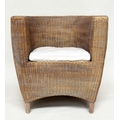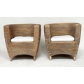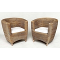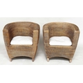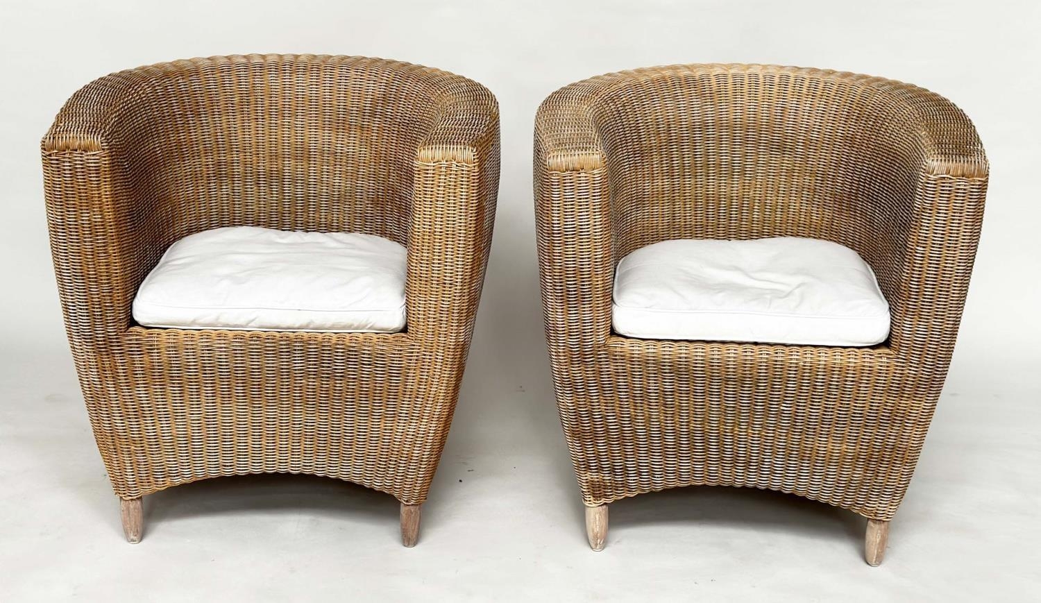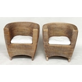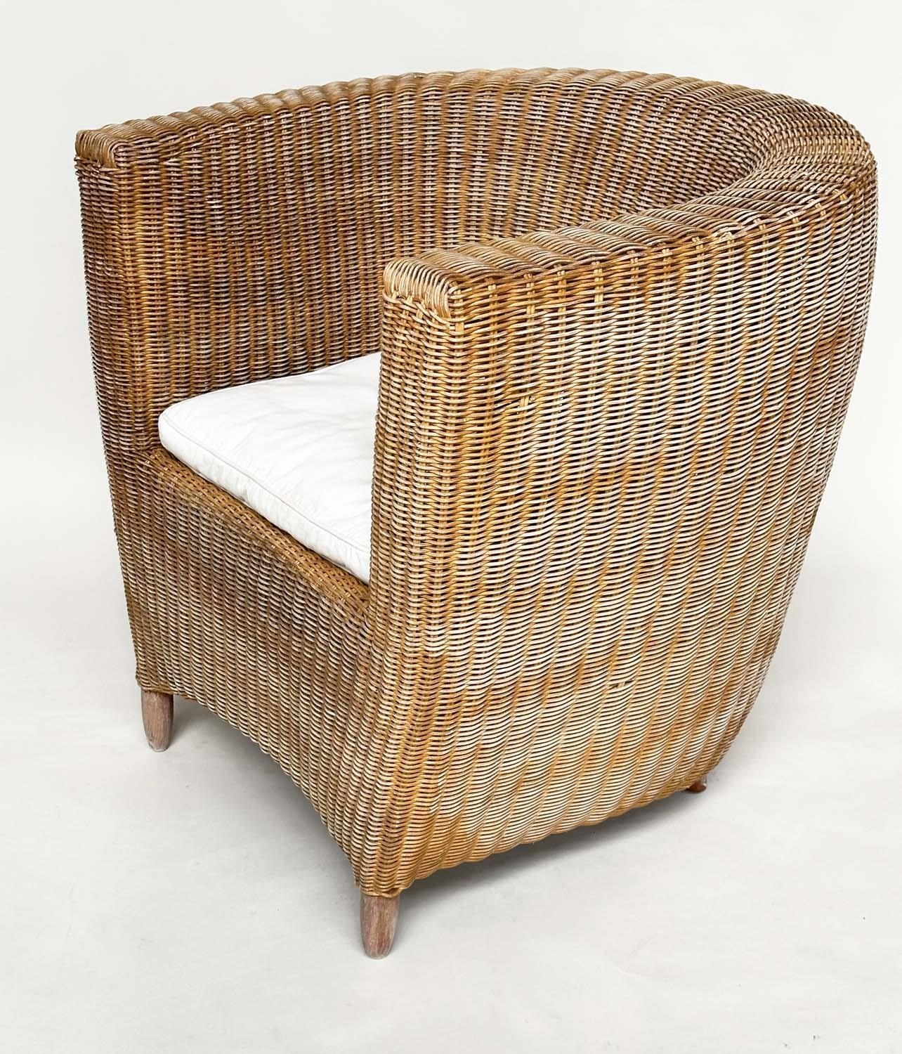 HEALS CONSERVATORY ARMCHAIRS, a pair, rattan framed and cane woven panelled with rounded backs and cushions by 'Heals of London', 72cm W. (2)