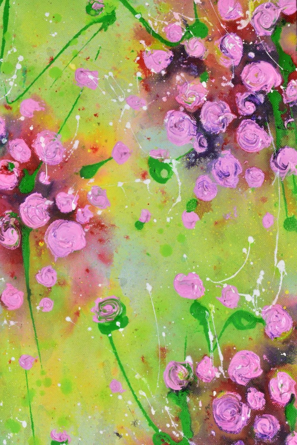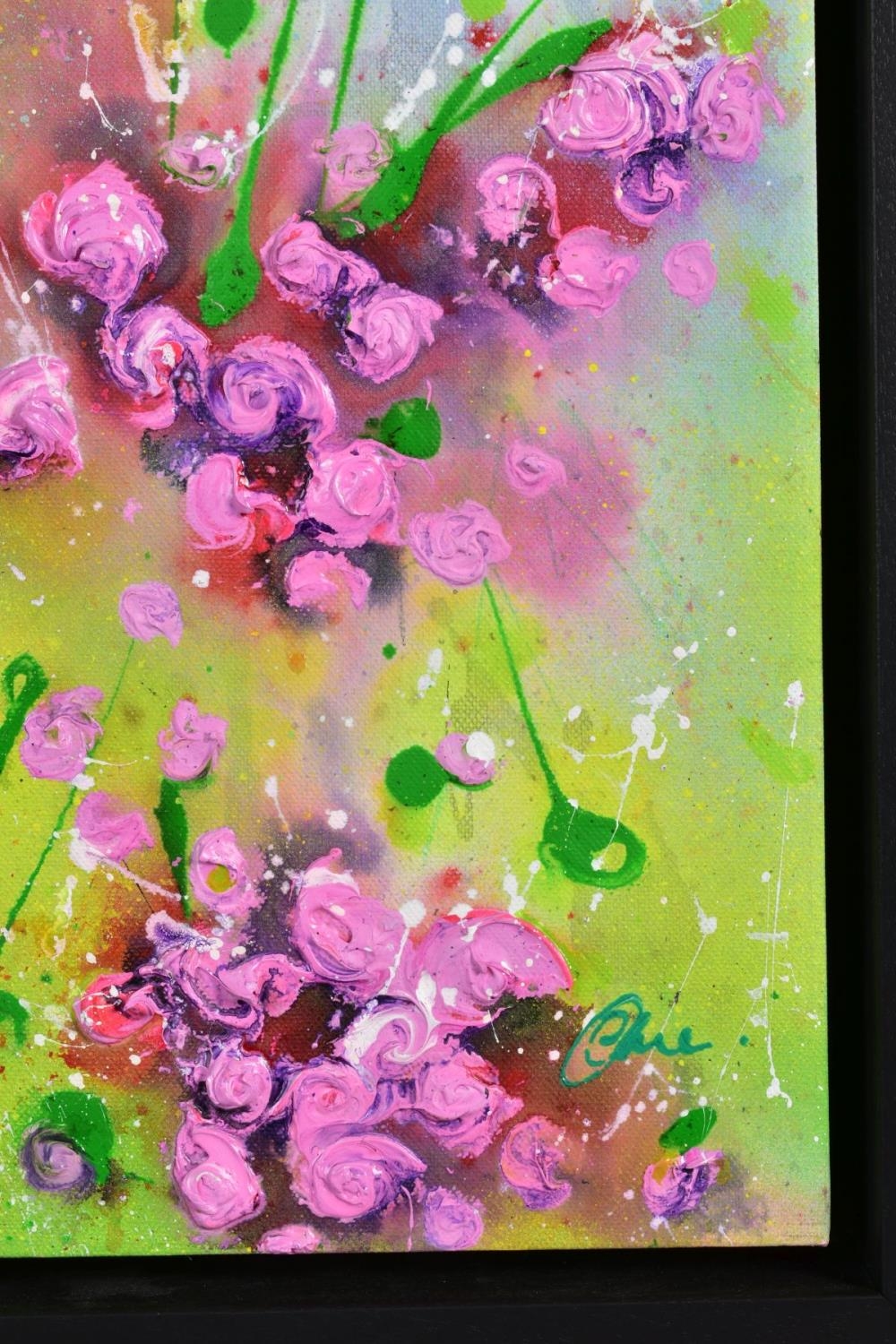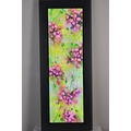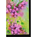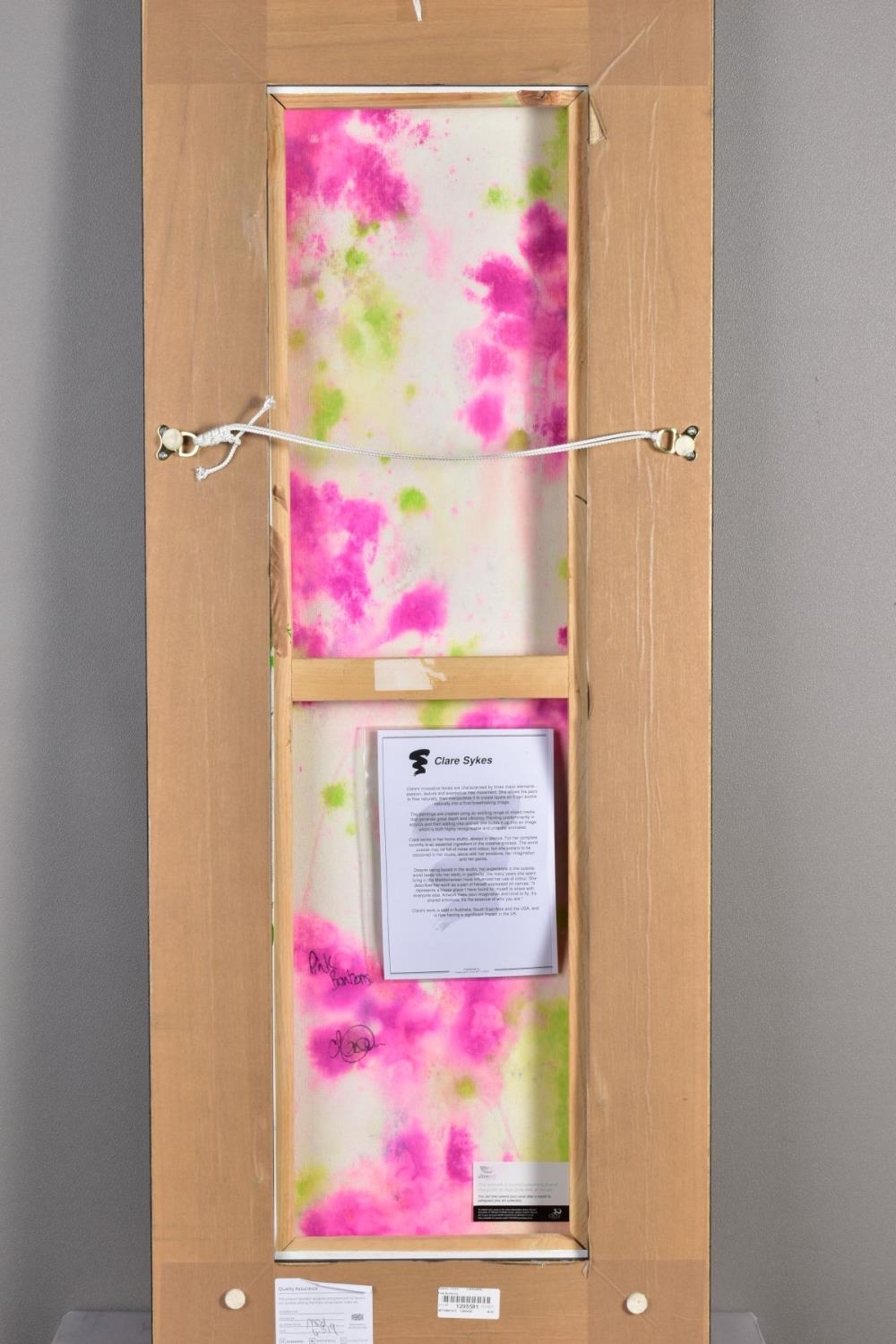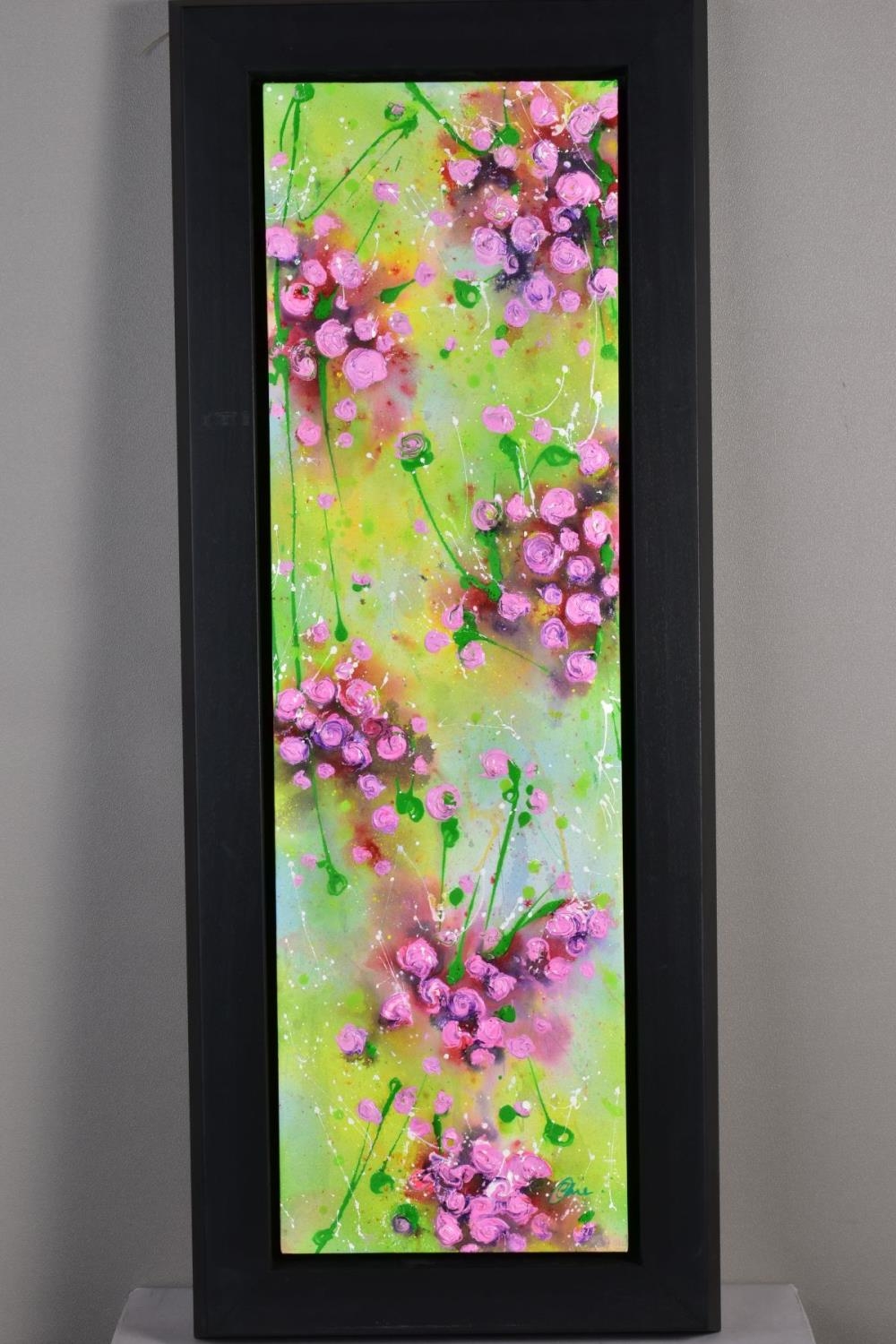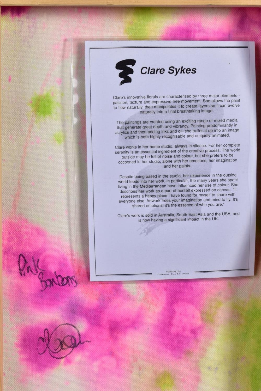 CLARE SYKES (BRITISH 1972) 'PINK BONBONS' bunches of pink flowers, signed bottom right, signed and titled verso, acrylic on canvas, framed, approximate size 100cm x 30cm (condition:- condition good) (A)