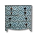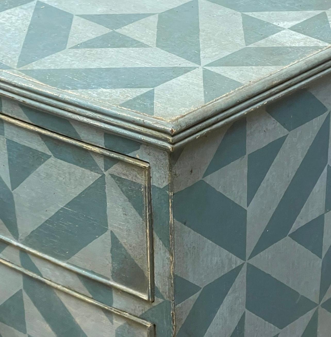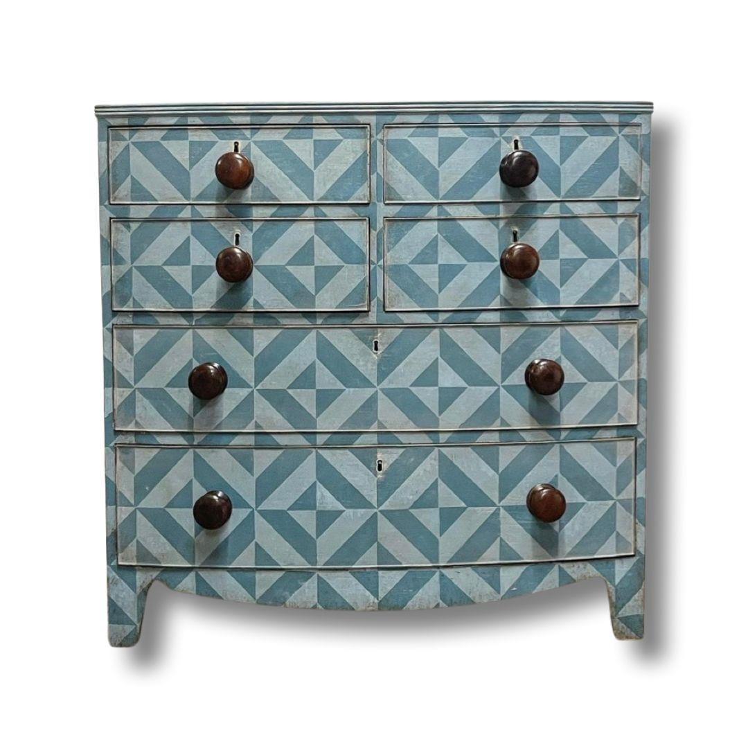 Good Antique English mahogany bow fronted chest of drawers with geometric design, later paint, 92cm wide x 92 high x 47 deep