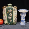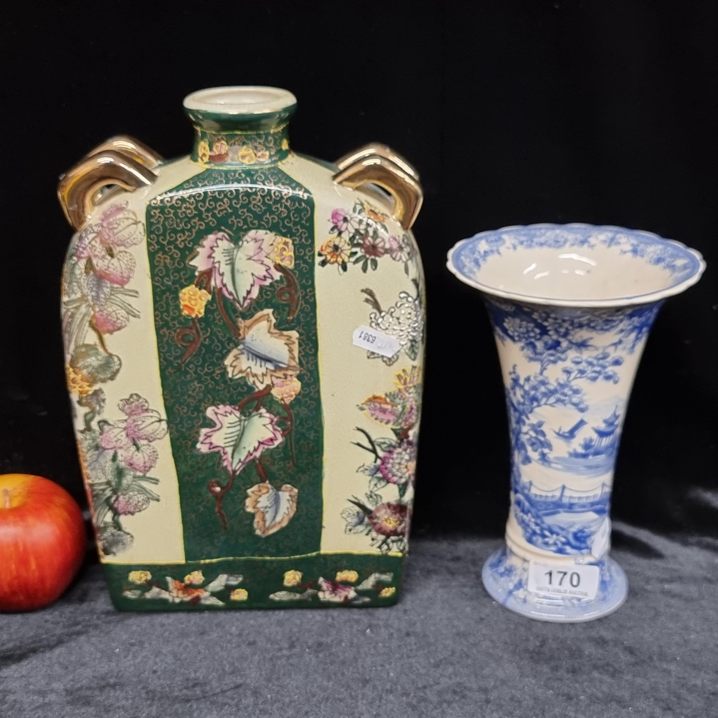 Two pretty ceramic vases in a vintage aesthetic. Including a blue and white glaze trumpet example and a crazed example of a Chinese flask with gilt handles.