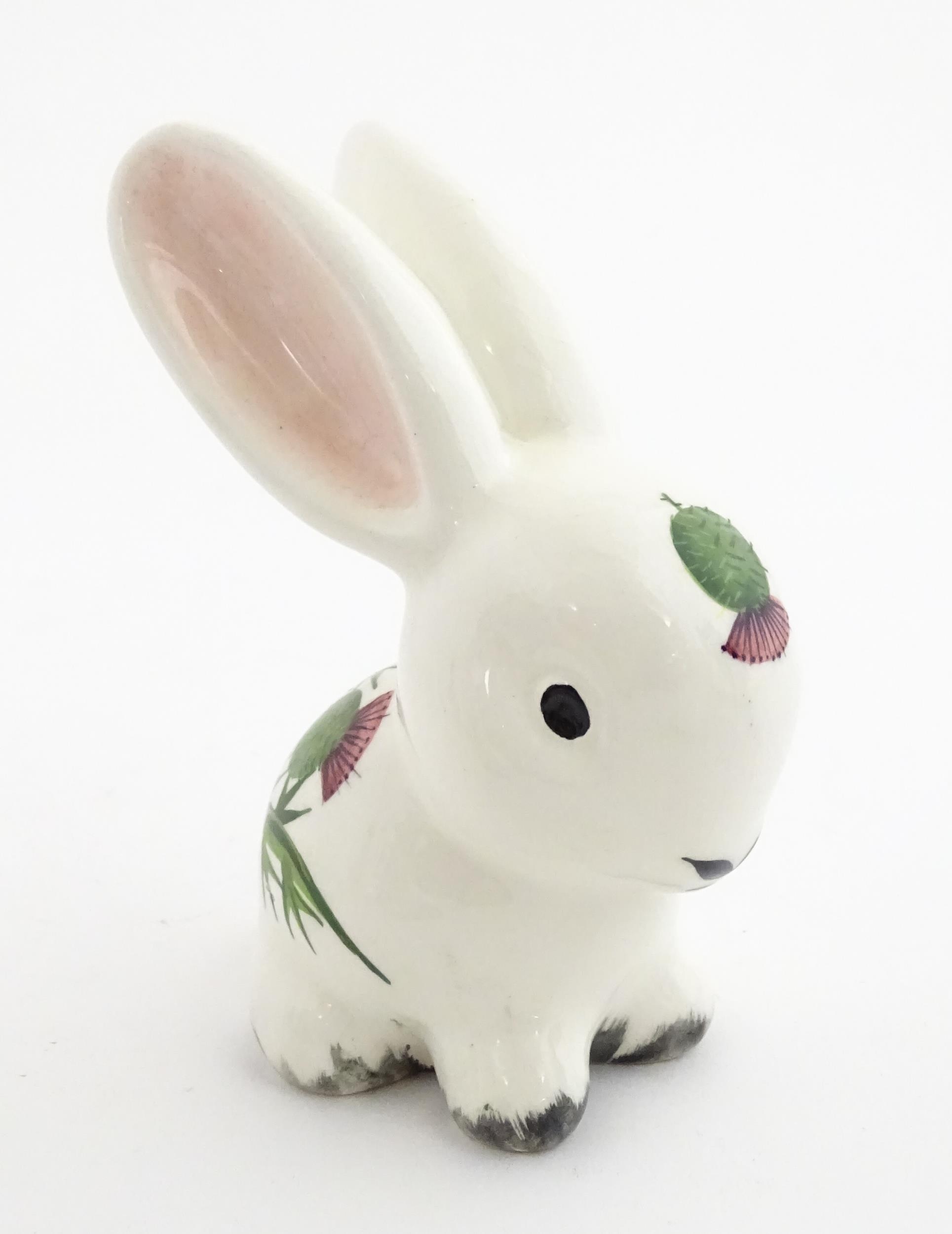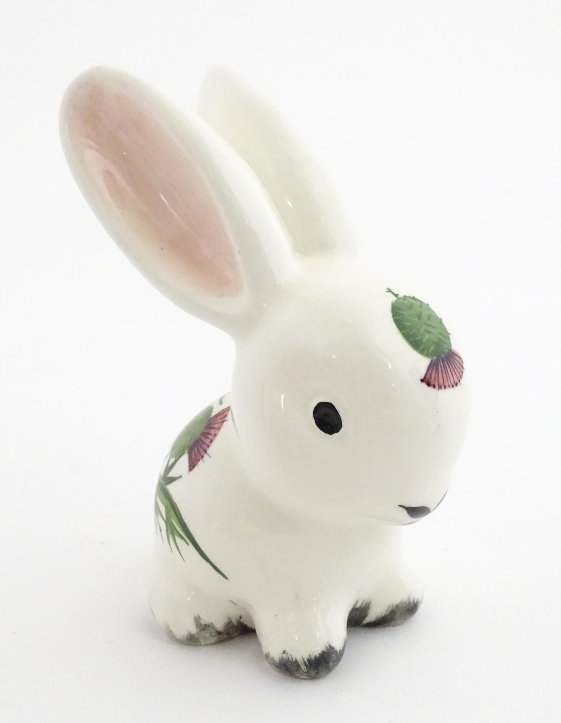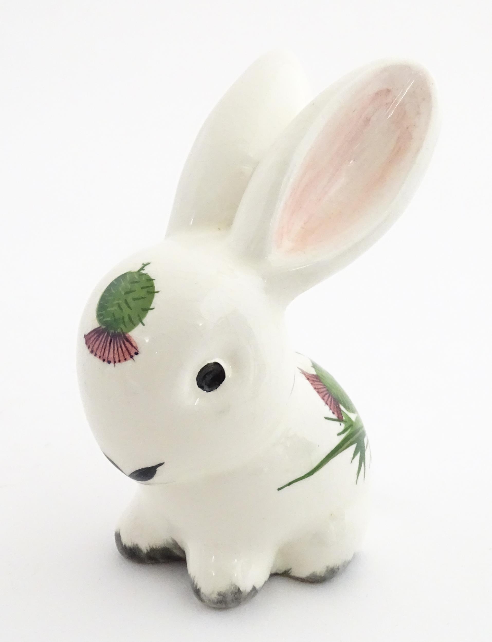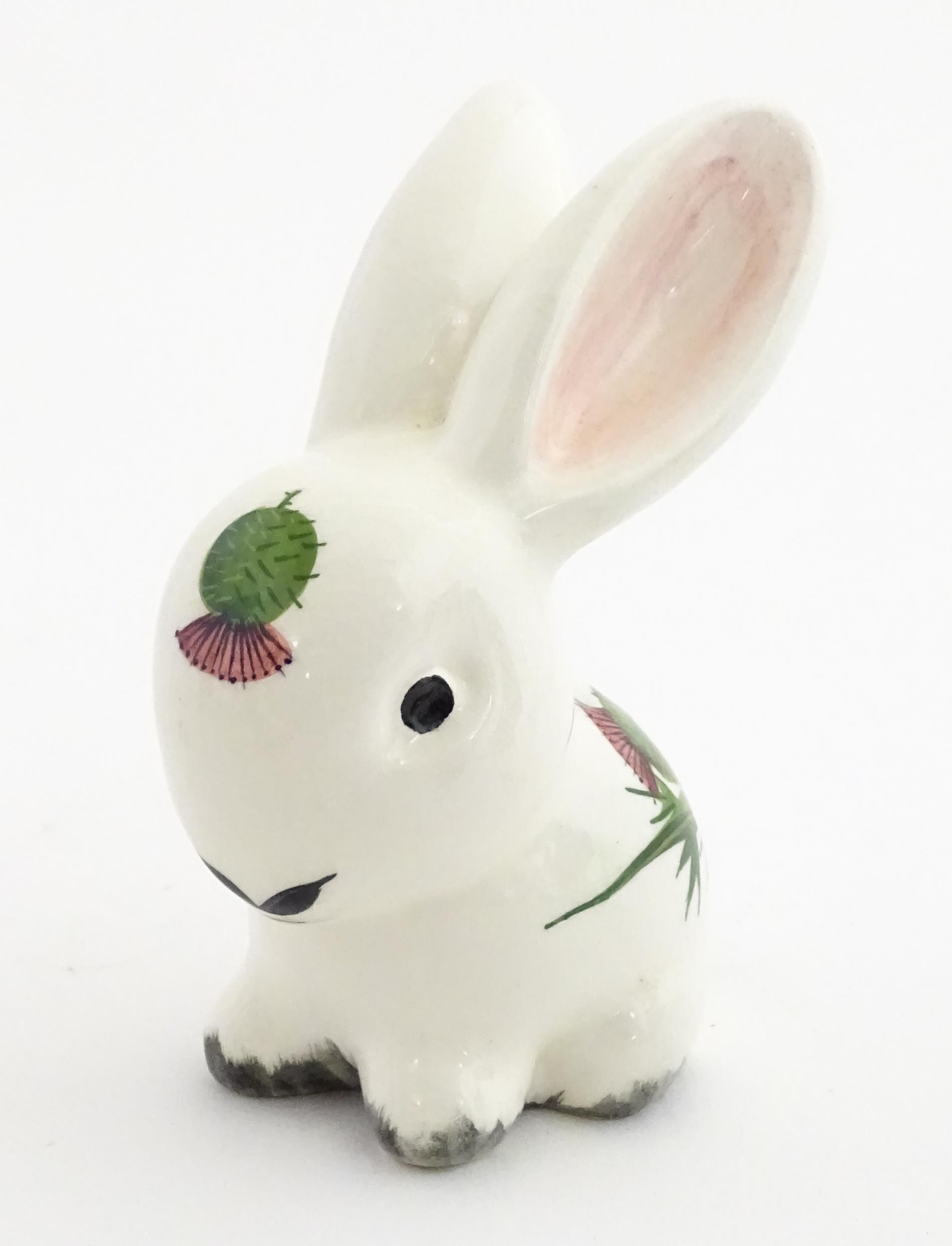 A Plichta model of a bunny rabbit, with hand painted Wemyss style thistle detail. Marked under. Approx. 5 1/4" high