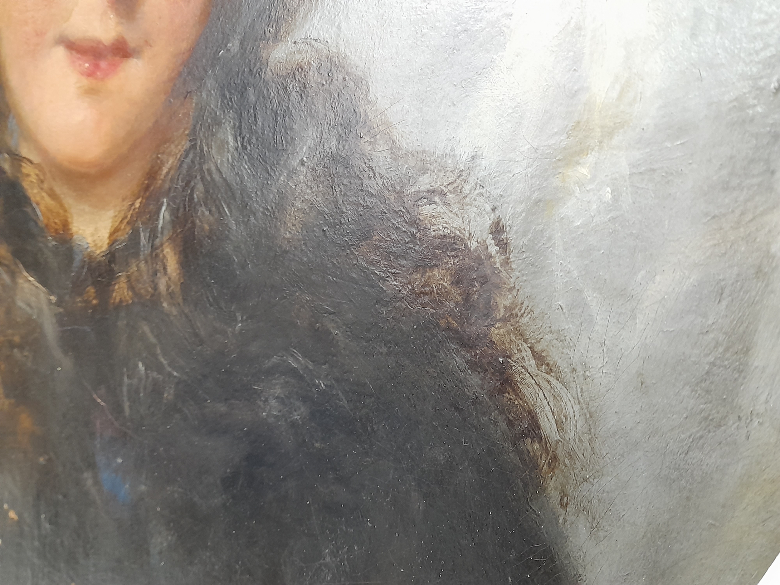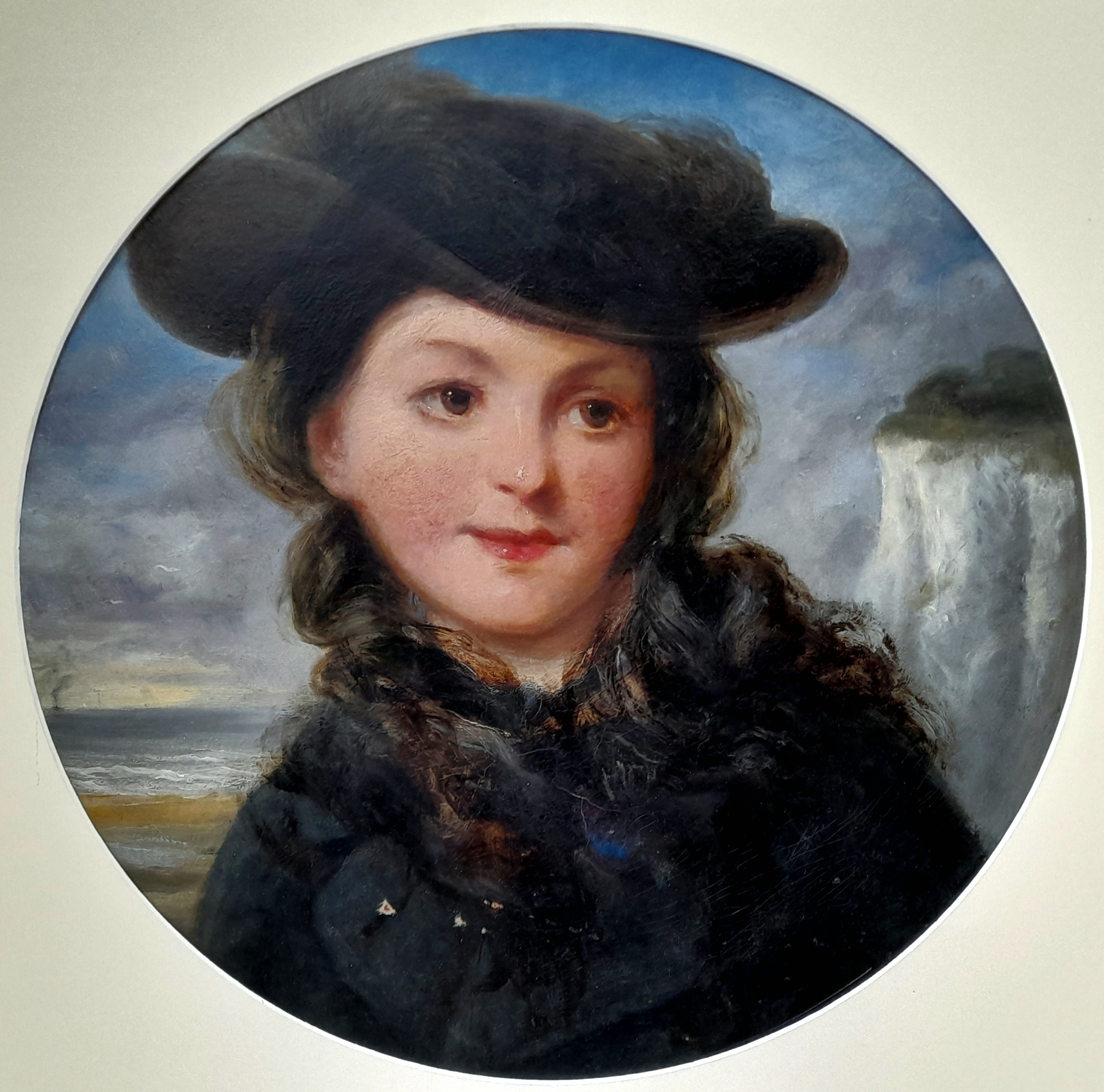 An Oil on Board Picture of a Young Girl by the Coast. Signed but unable to make out artists name. In frame - 56 x56cm. Some minor wear damage - please see photos.