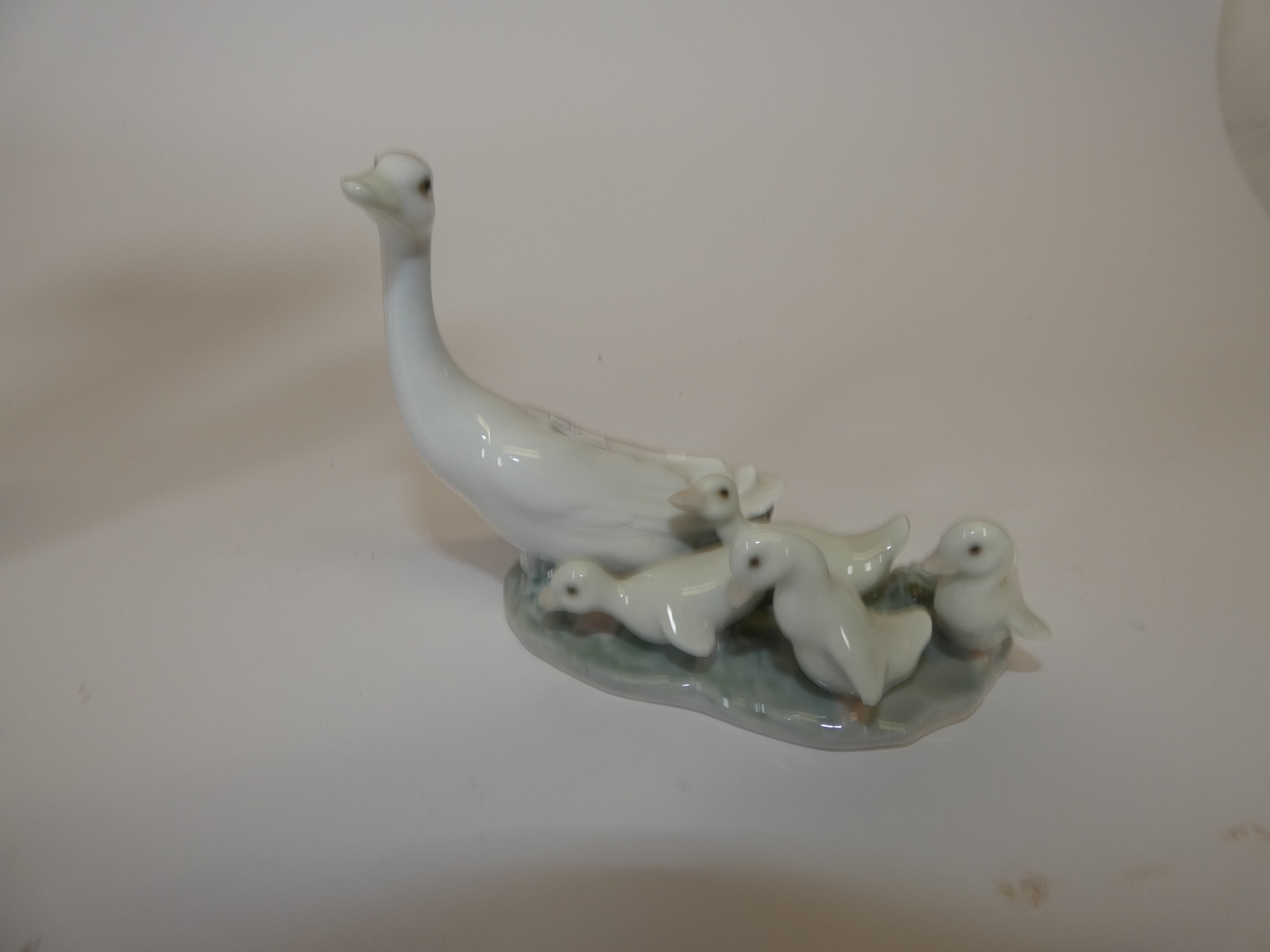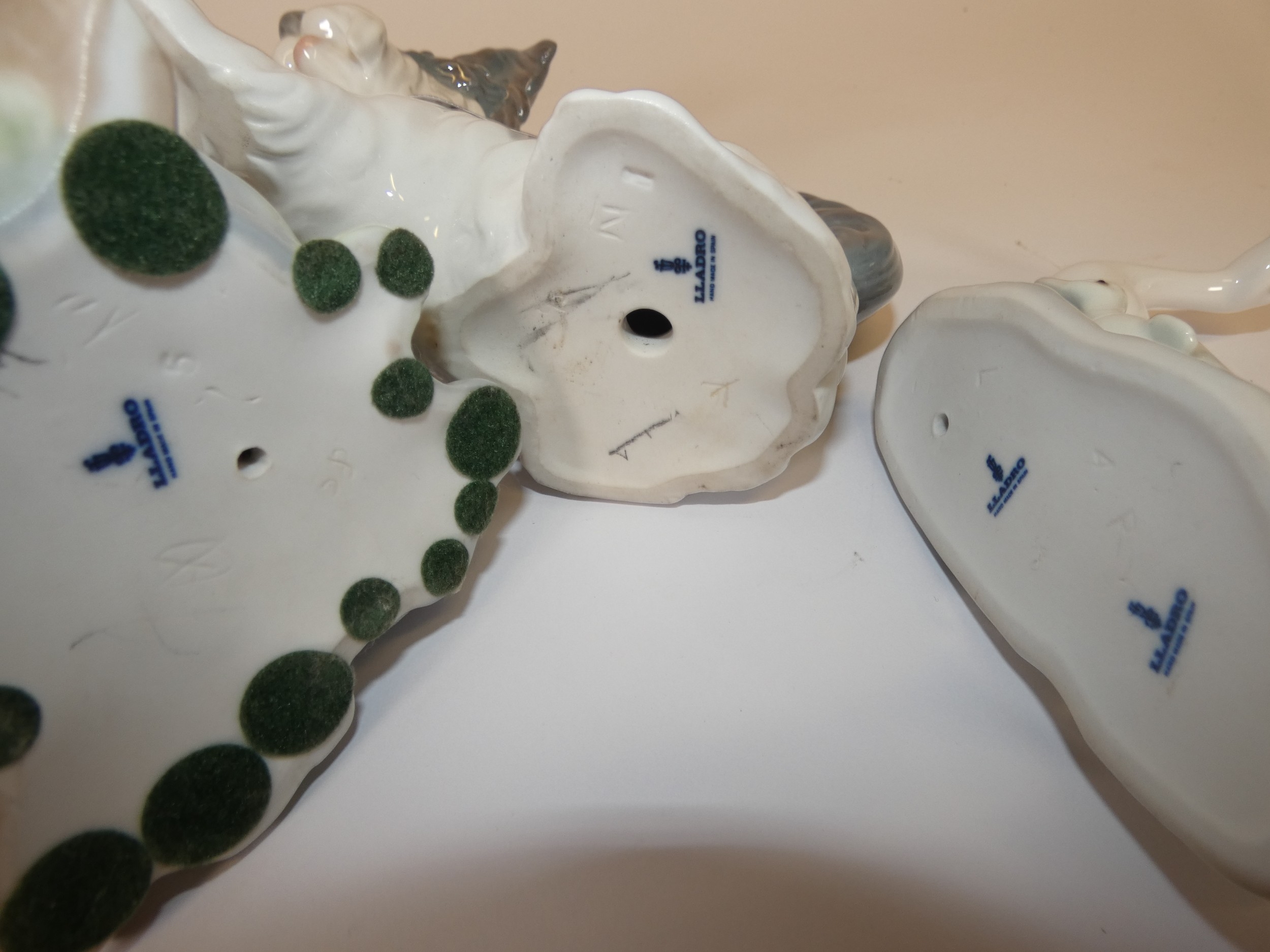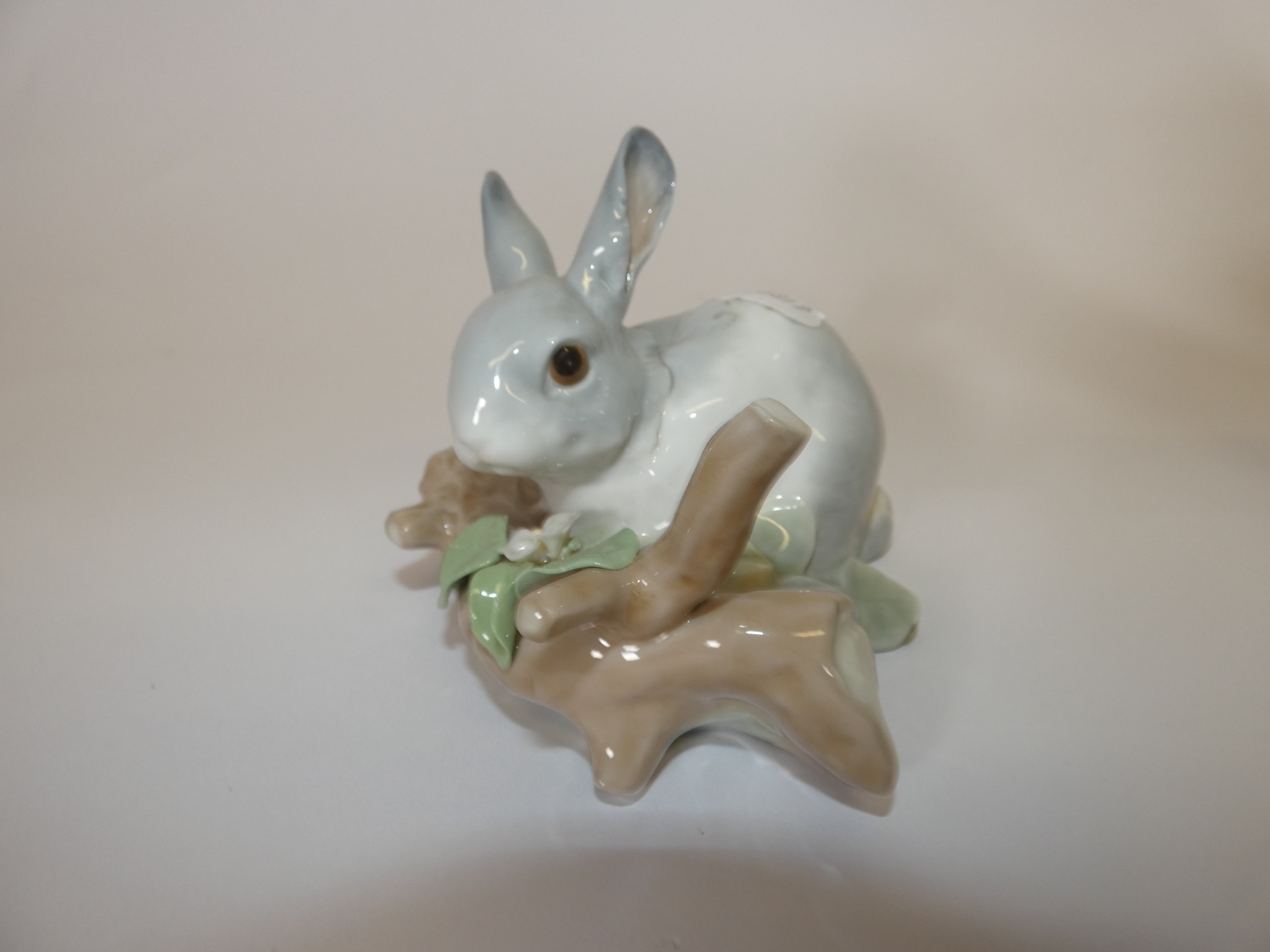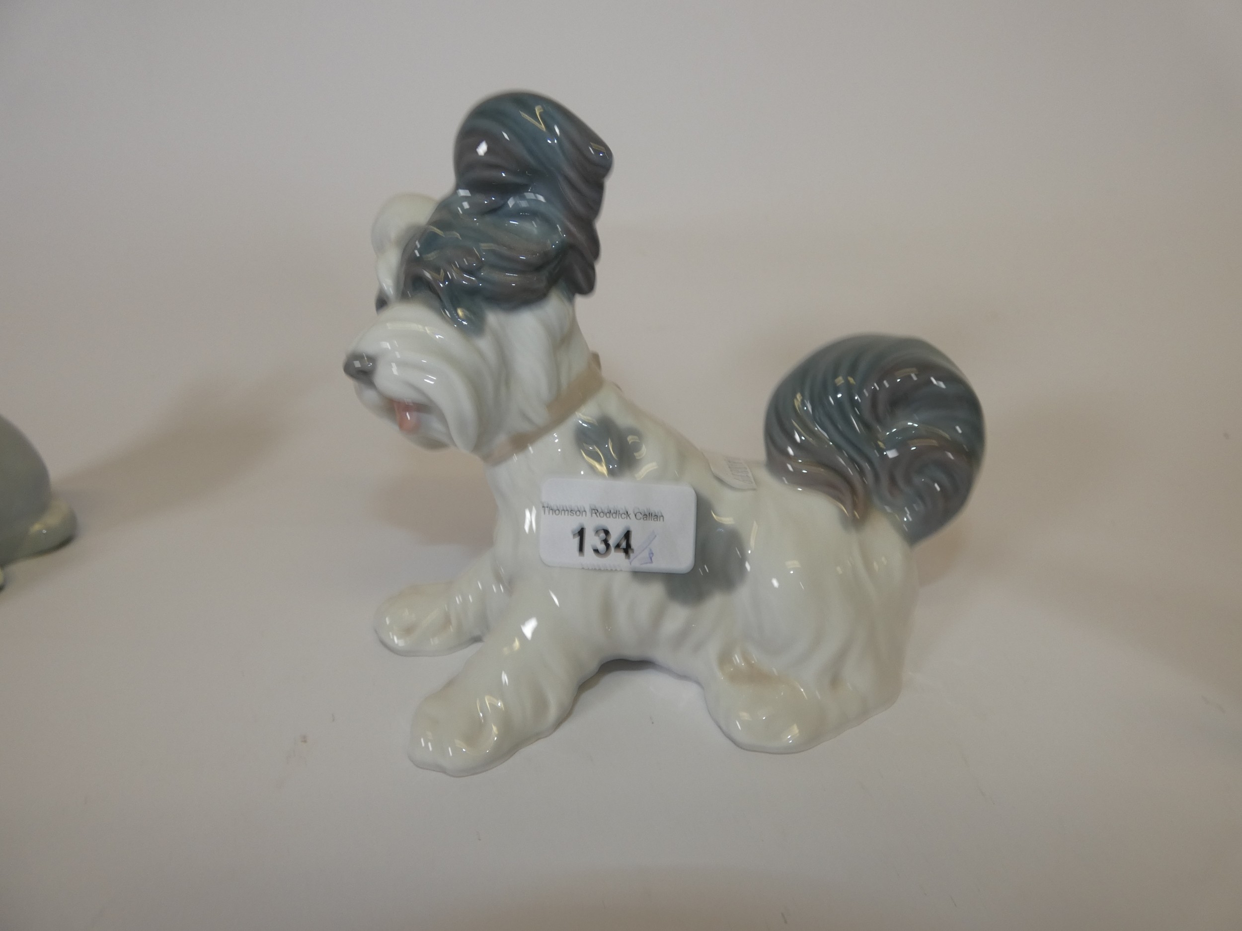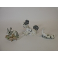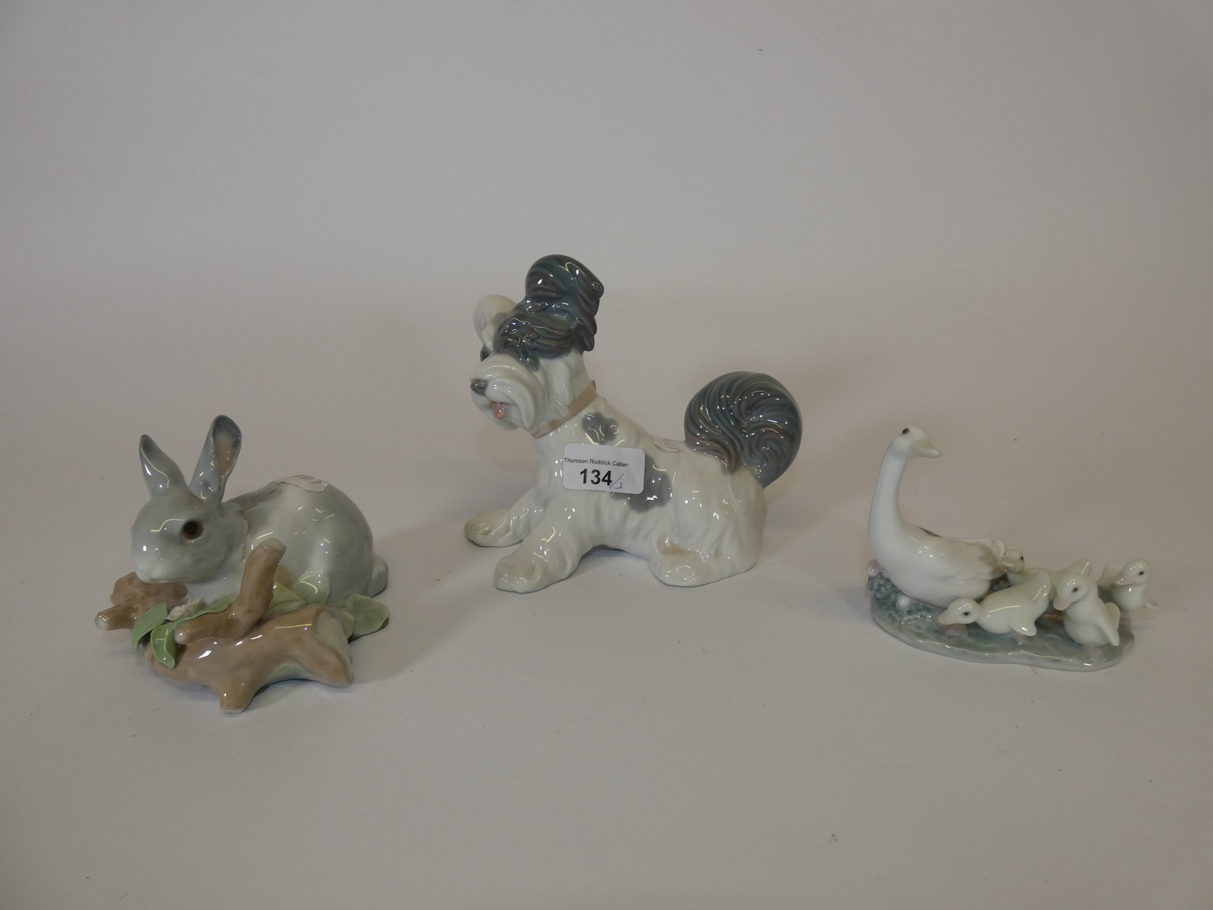 Lladro figure of a Skye Terrier, and another two Lladro figure groups of a rabbit and swan group. (3)
