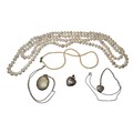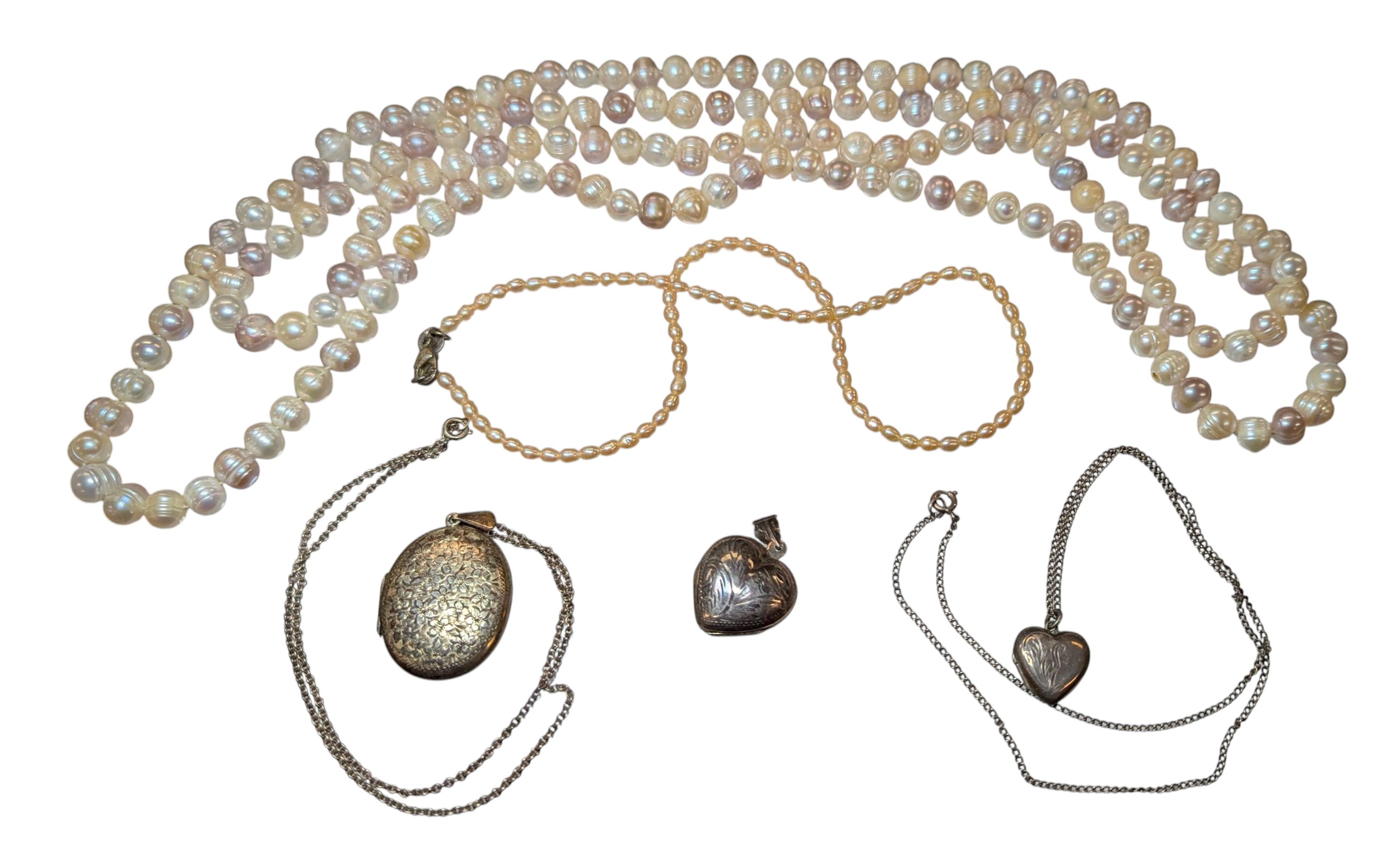 to include a "925" hallmarked heart shaped photograph locket pendant, a "SILVER BK&FT" stamped patterned heart shaped locket with "STERLING" stamped fine chain and a hallmarked silver floral patterned oval locket pendant with "STERLING" stamped fine chain, total gross weight of the jewellery is approx. 27.4g; two freshwater pearl necklaces,