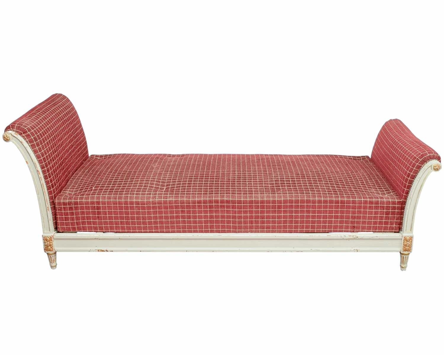 A continental painted pine daybed/couch. 19th century, with stud edged check upholstery, grey and gilt decorated frame, on turned and fluted feet, height 83cm, width 229cm, depth 88cm.