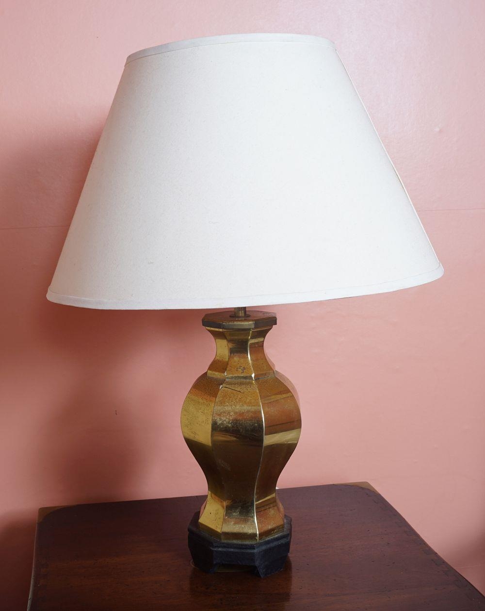 each of baluster chamfered form, complete with shade 23 cm. high