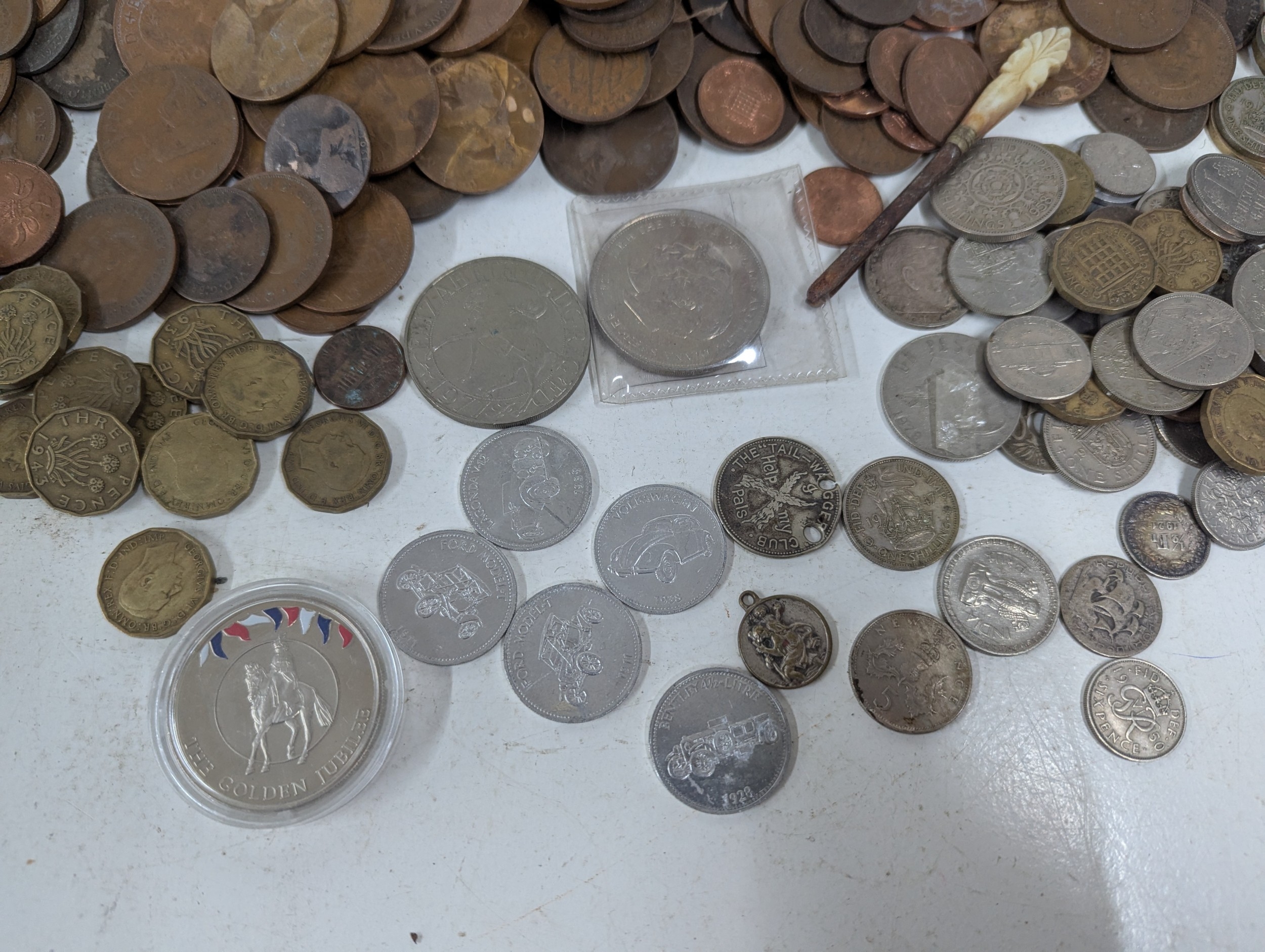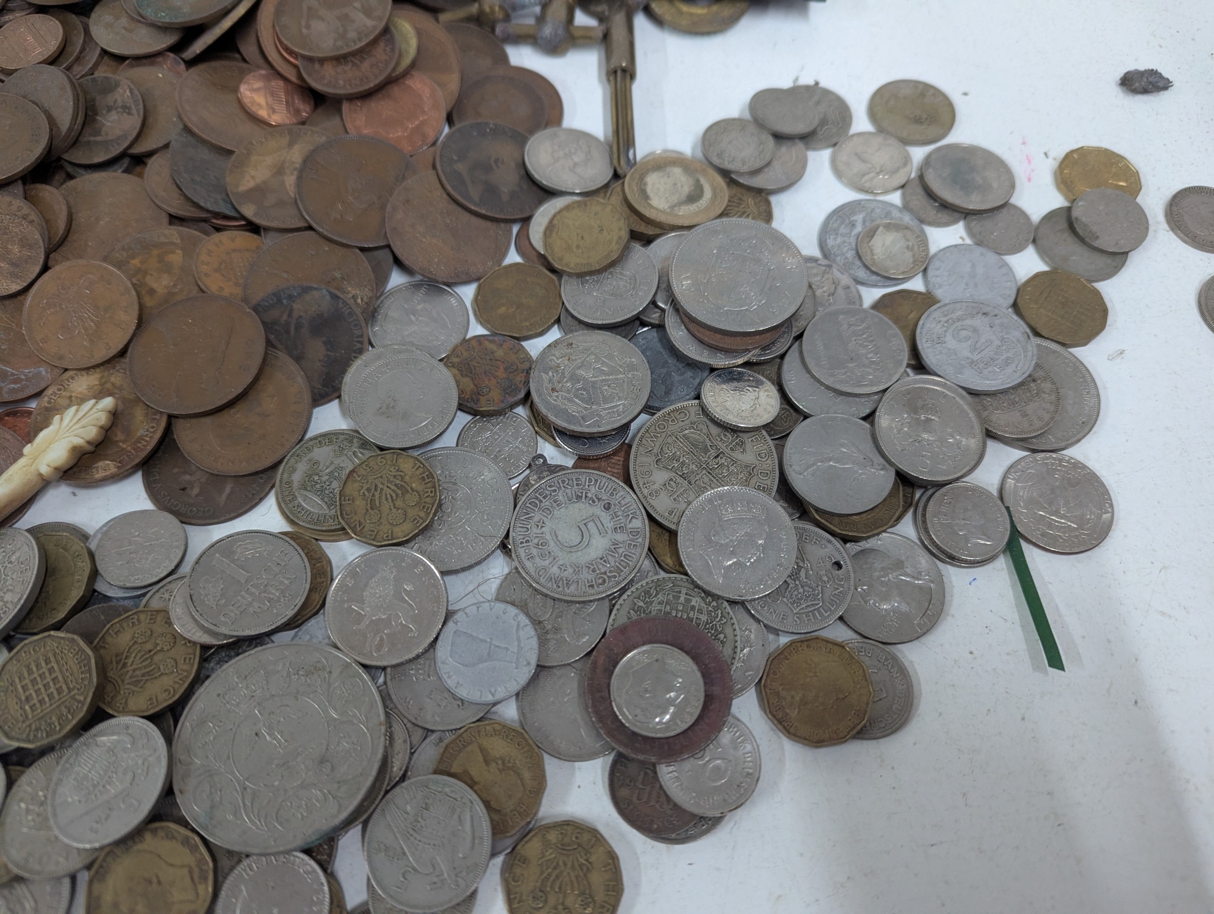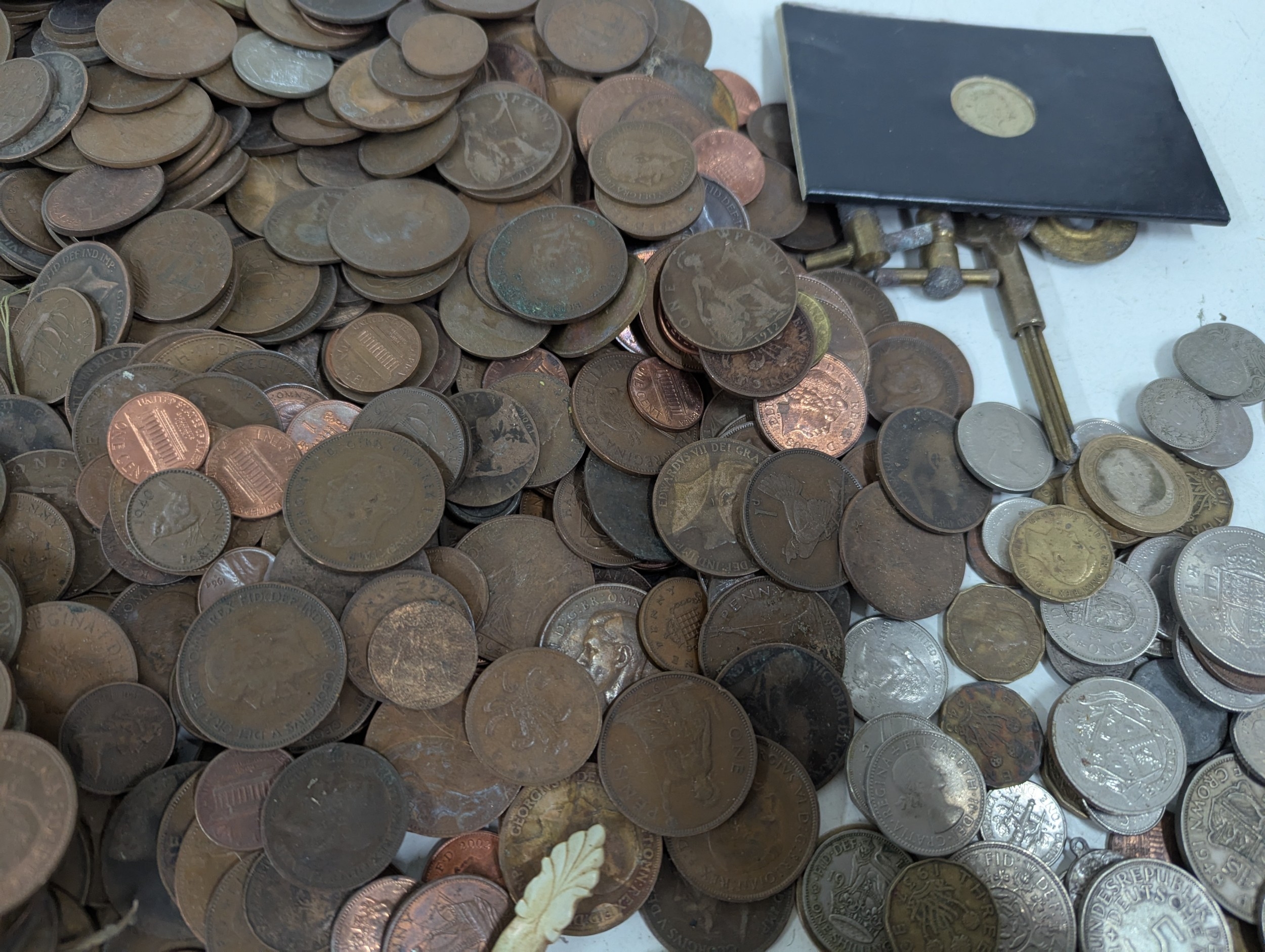 A collection of mainly British coinage to include one shillings, commemorative examples, shillings, pennies and others