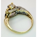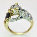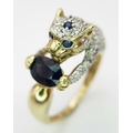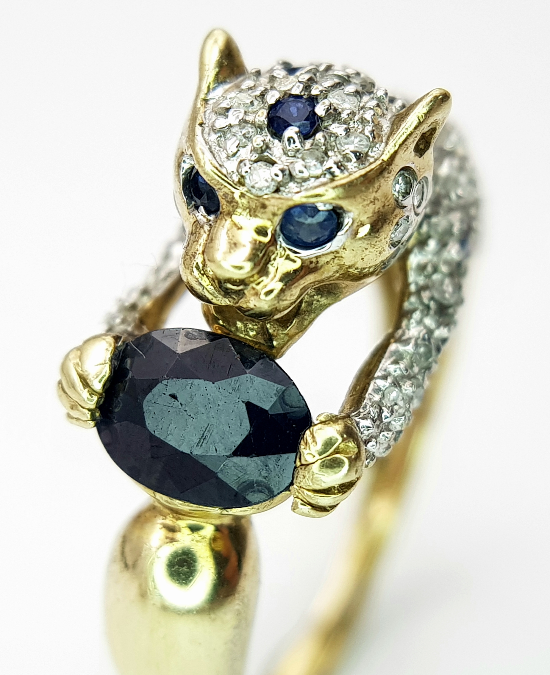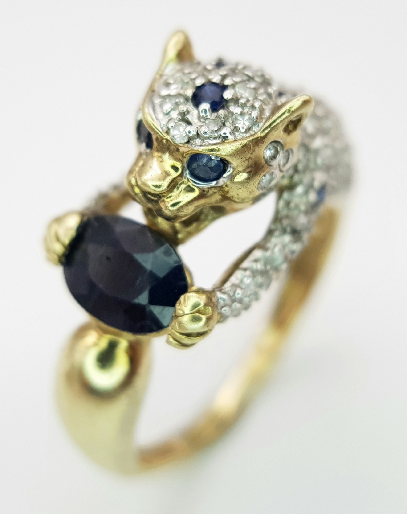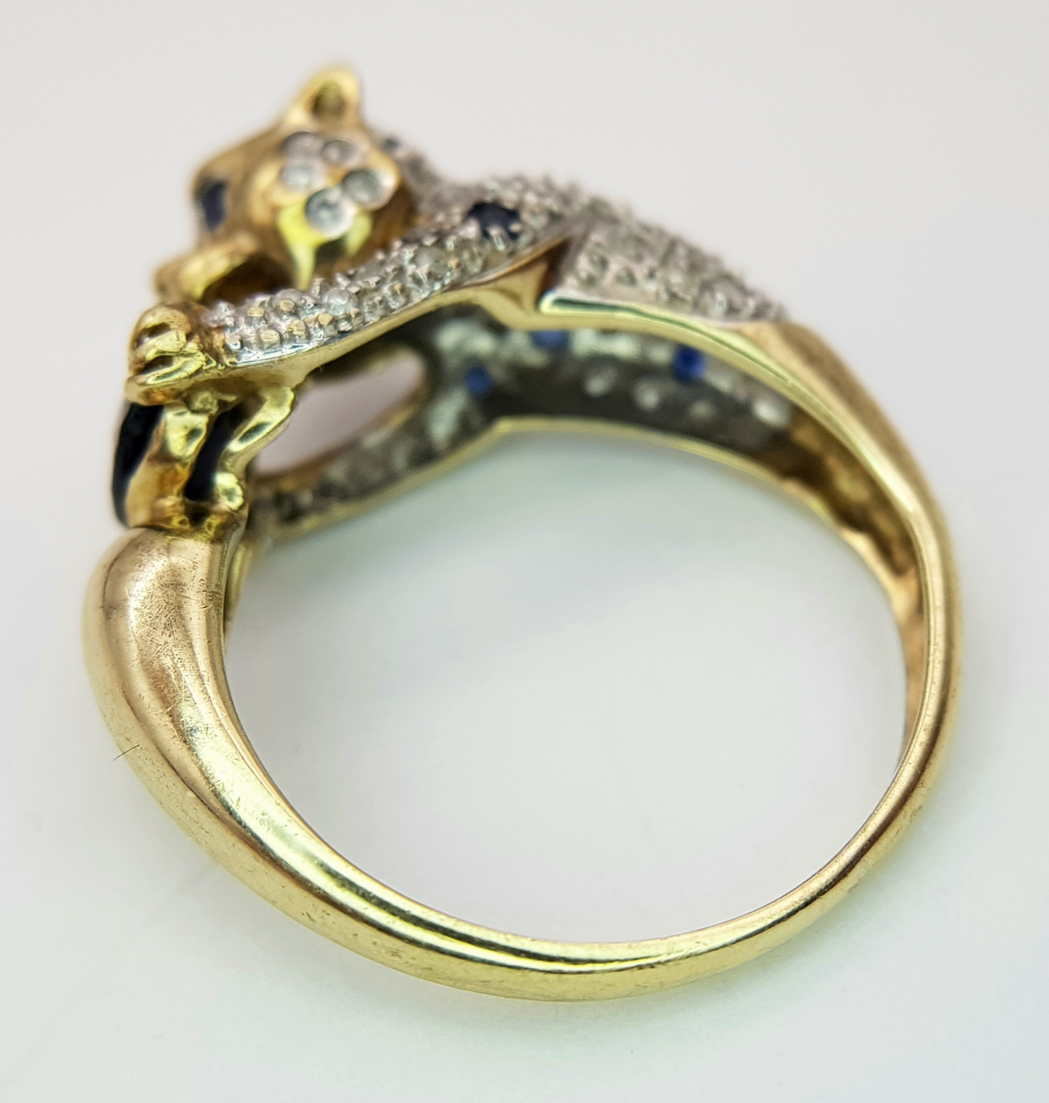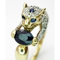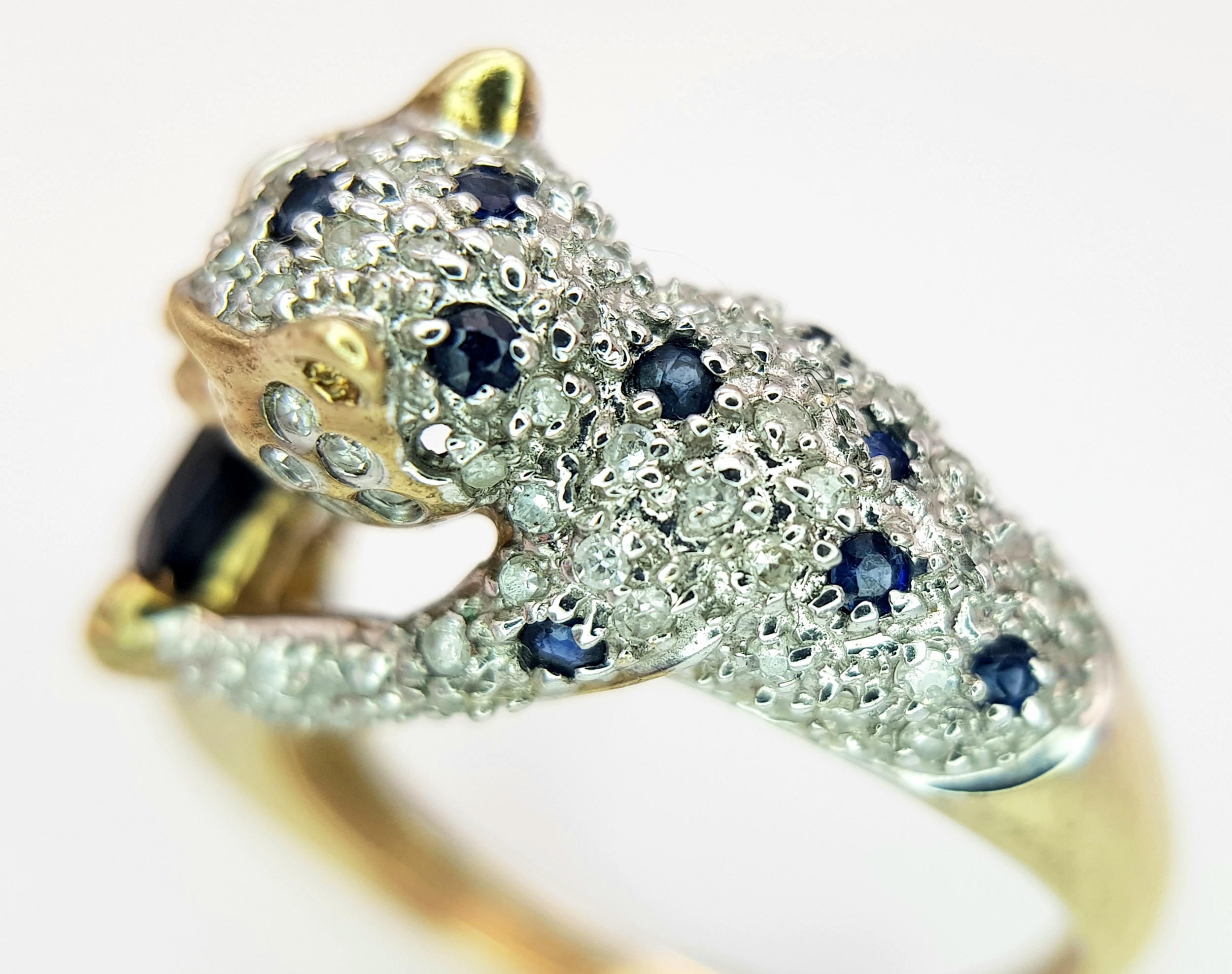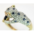 A 9K YELLOW GOLD DIAMOND AND SAPPHIRE SET PANTHER RING. TOTAL WEIGHT 4G. SIZE N. SC 9006