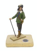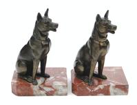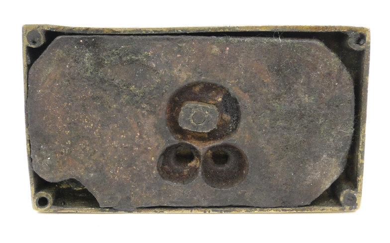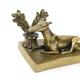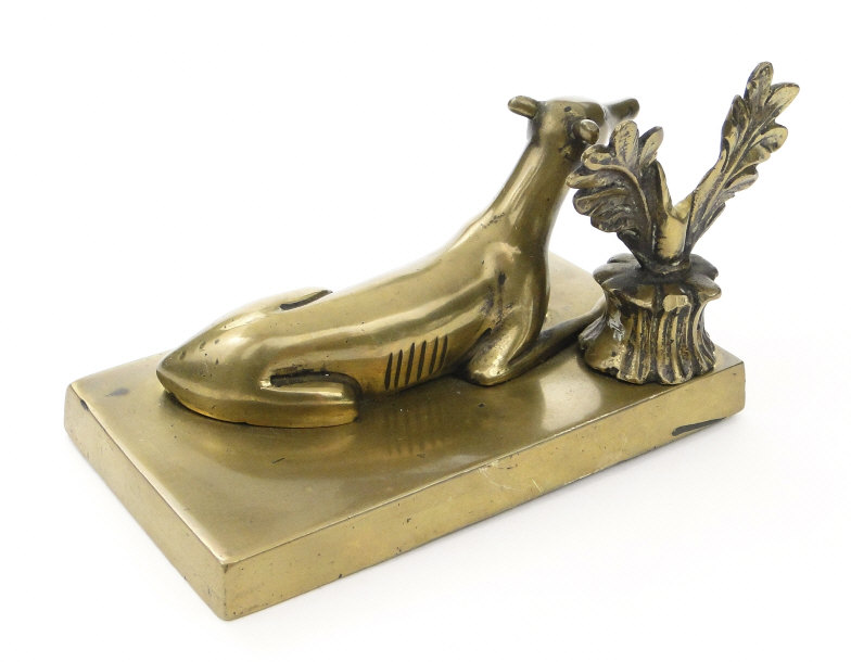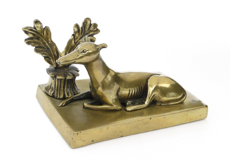 Early 19th century brass pen rest, the rectangular base with foliate and whippet mounts, 11cm in length