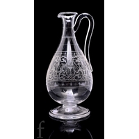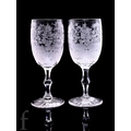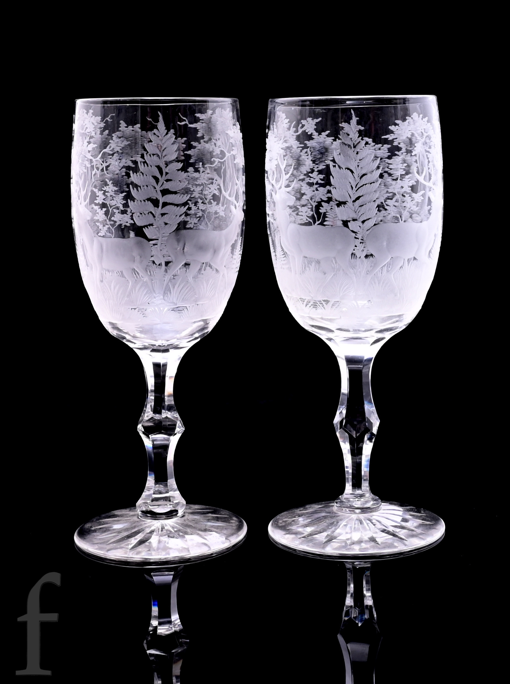 A pair of late 19th Century Stourbridge clear crystal goblets, the ovoid bowls engraved in the Bohemian taste with a stag and deer to a woodlands setting above a slice cut knopped stem and circular spread foot with radial cut star, height 19cm. (2)