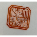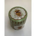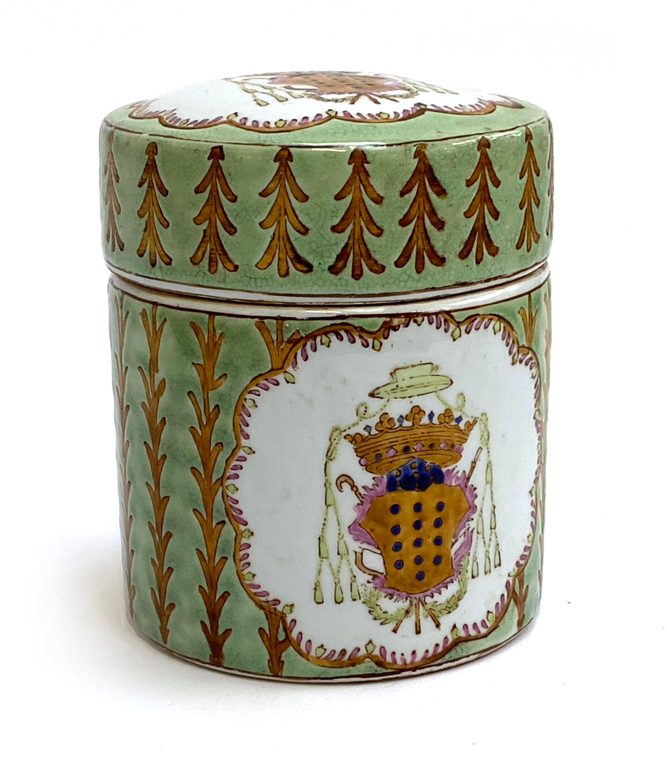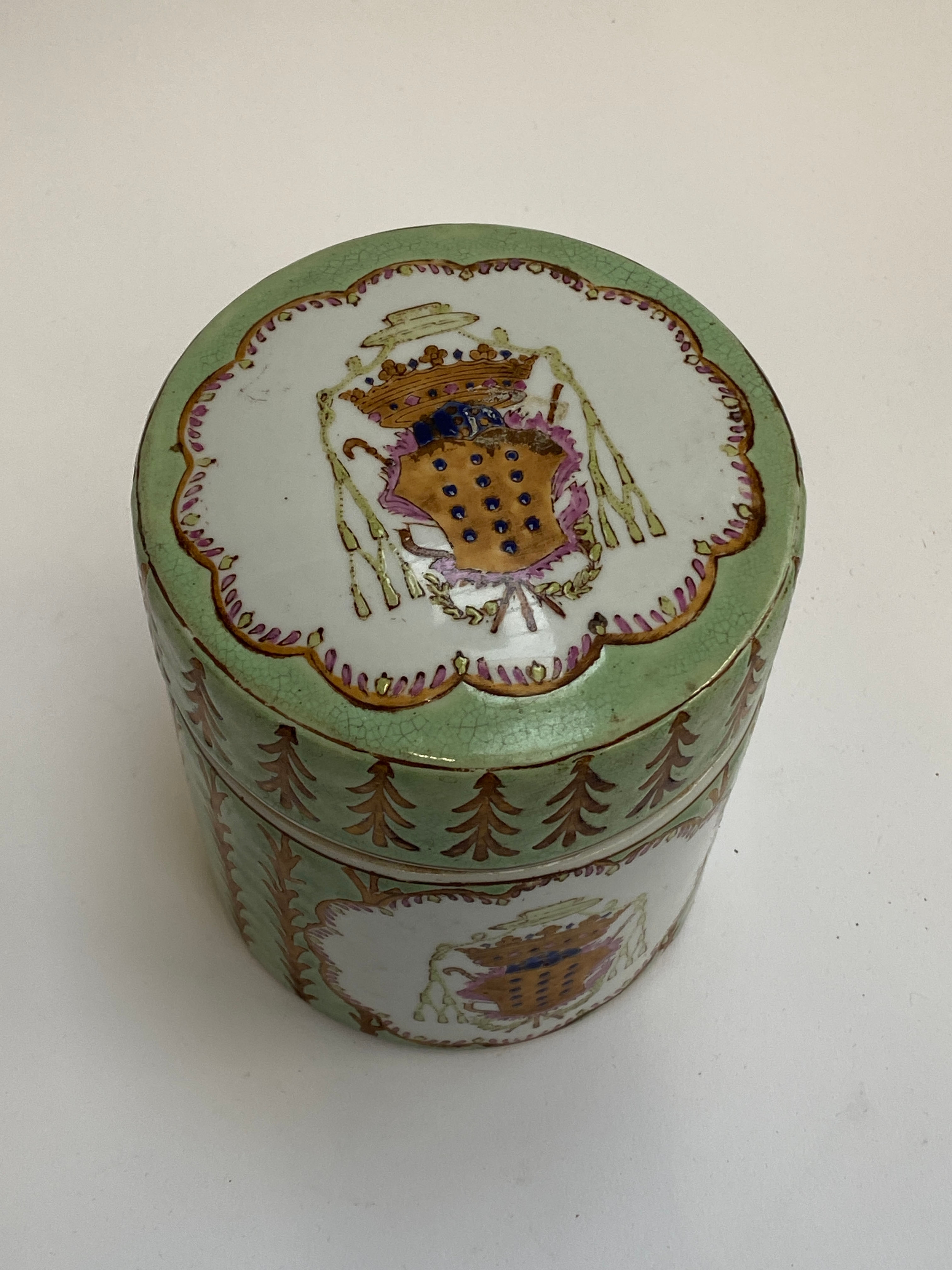 A 20th century Chinese porcelain armorial tea canister with green and gold decoration, red seal mark to base, 16cmH