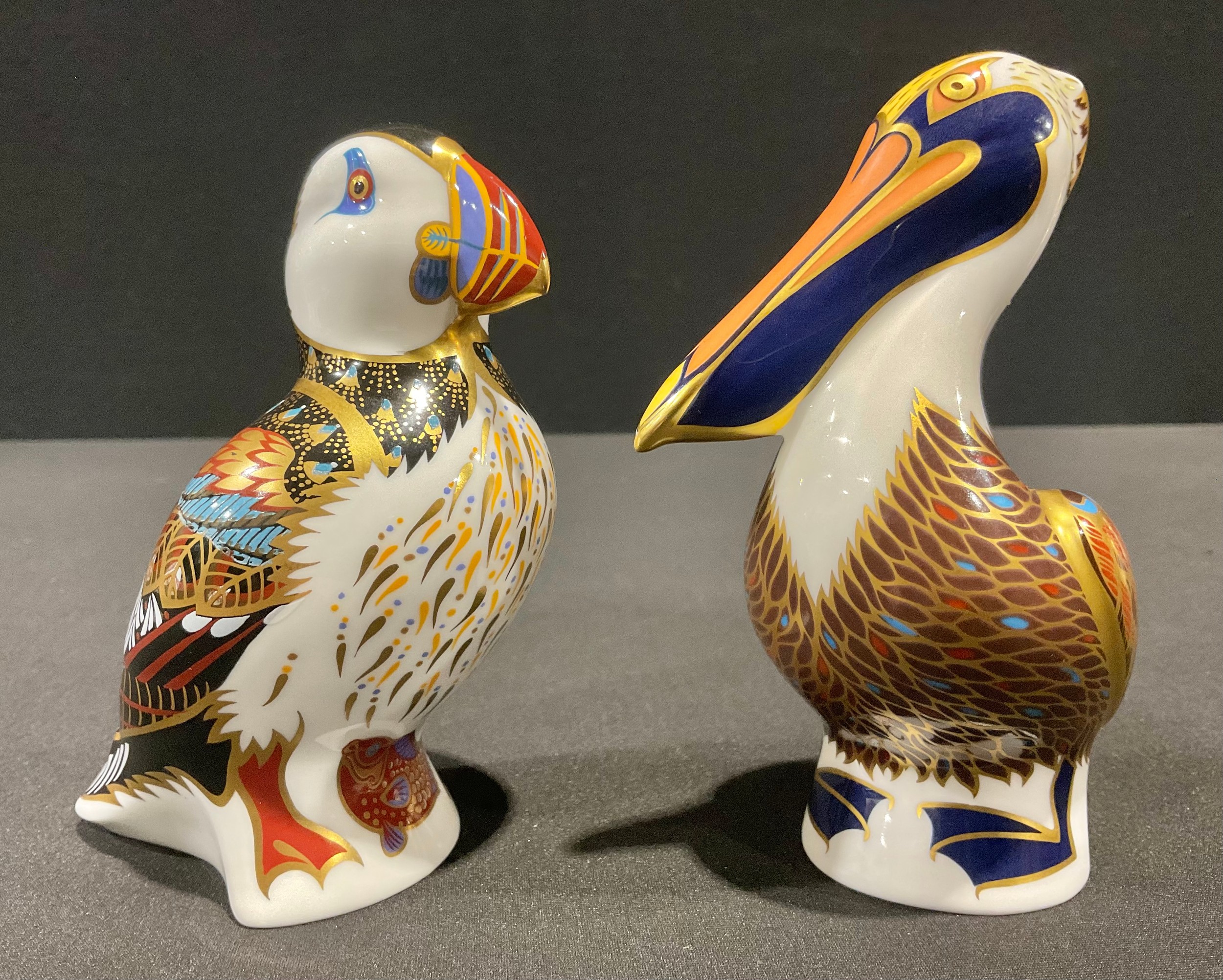 A Royal Crown Derby paperweight, Puffin, date code for 1996 (LIX), gold stopper and red Royal Crown Derby stamp on the base; together with a Brown Pelican, 13cm high, gold stopper, red printed marks and Royal Crown Derby stamp on the base (2)