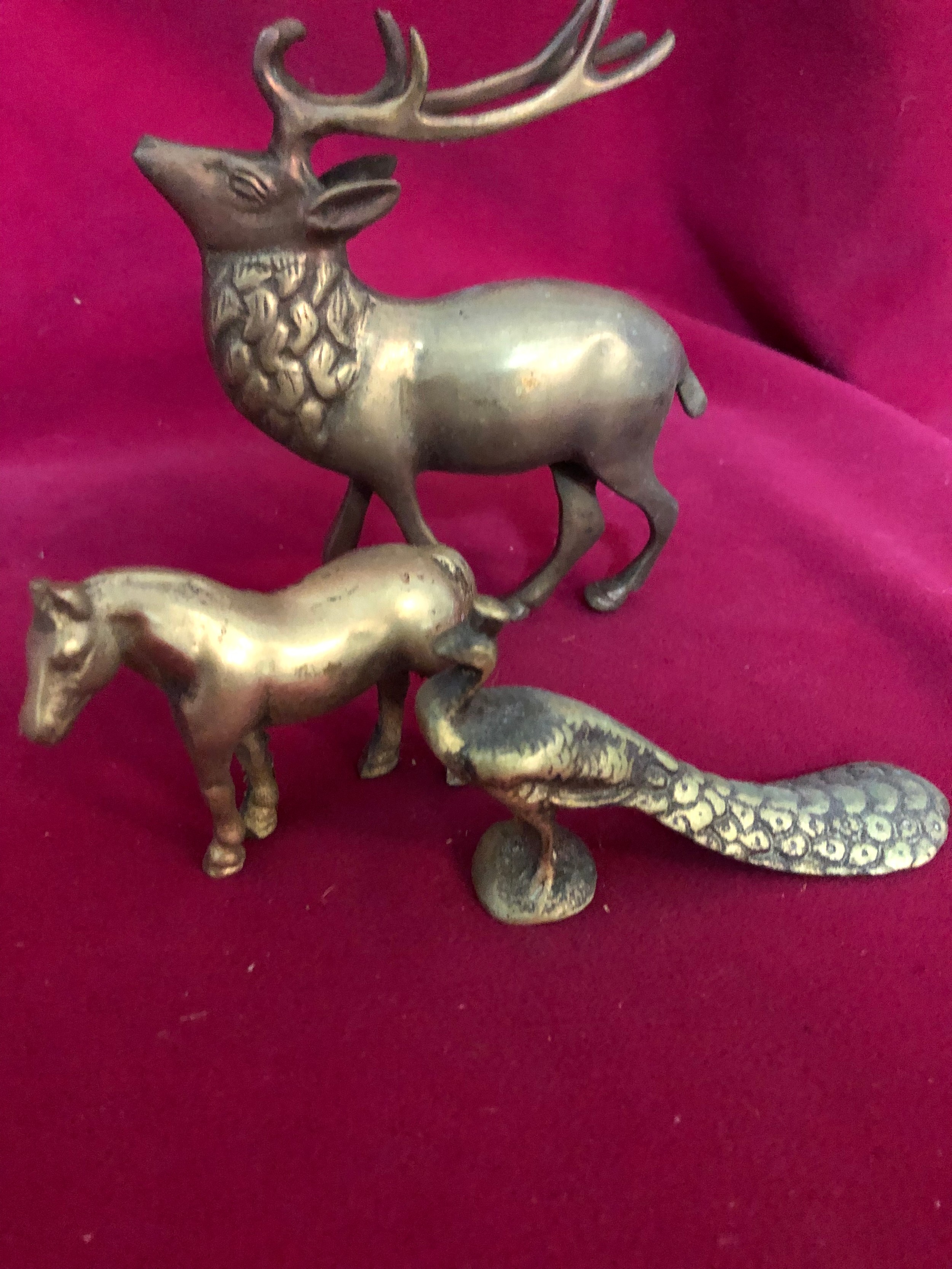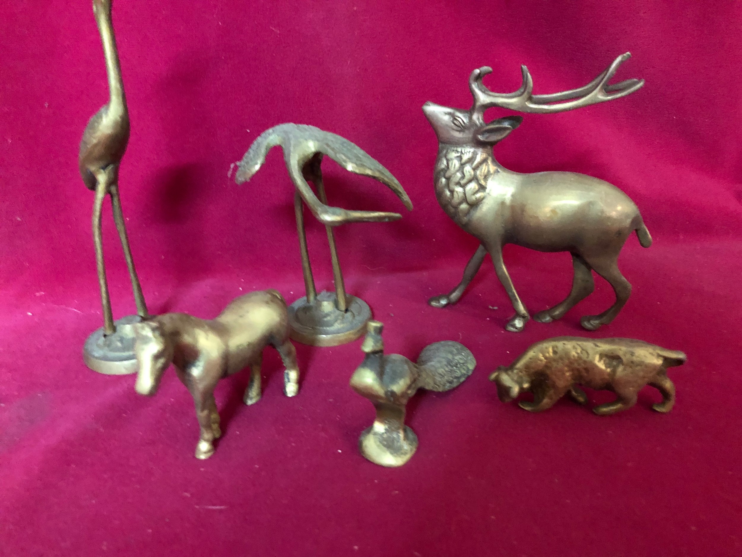 Selection of brass animals including stag, horse, heron, peacock, pelican and bull
