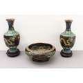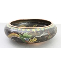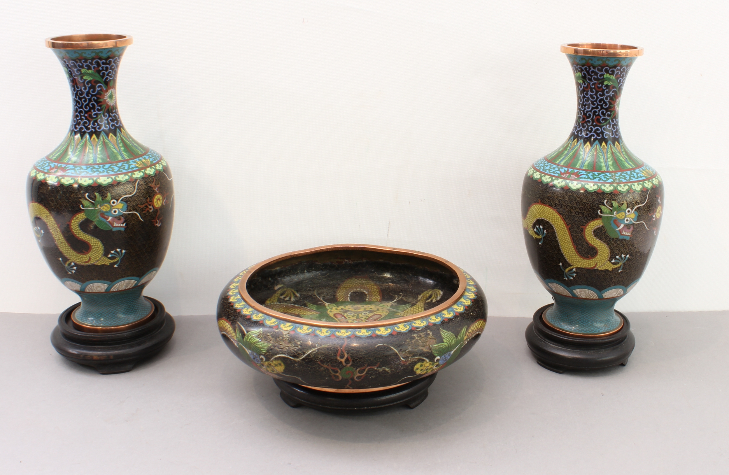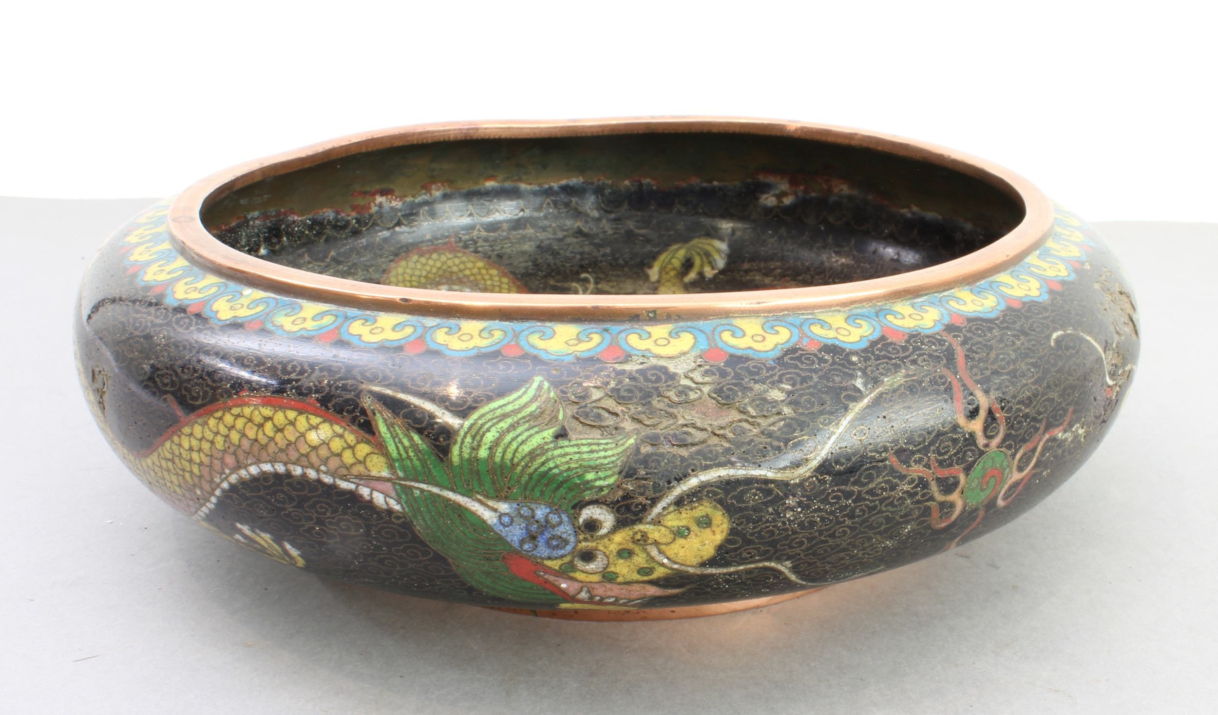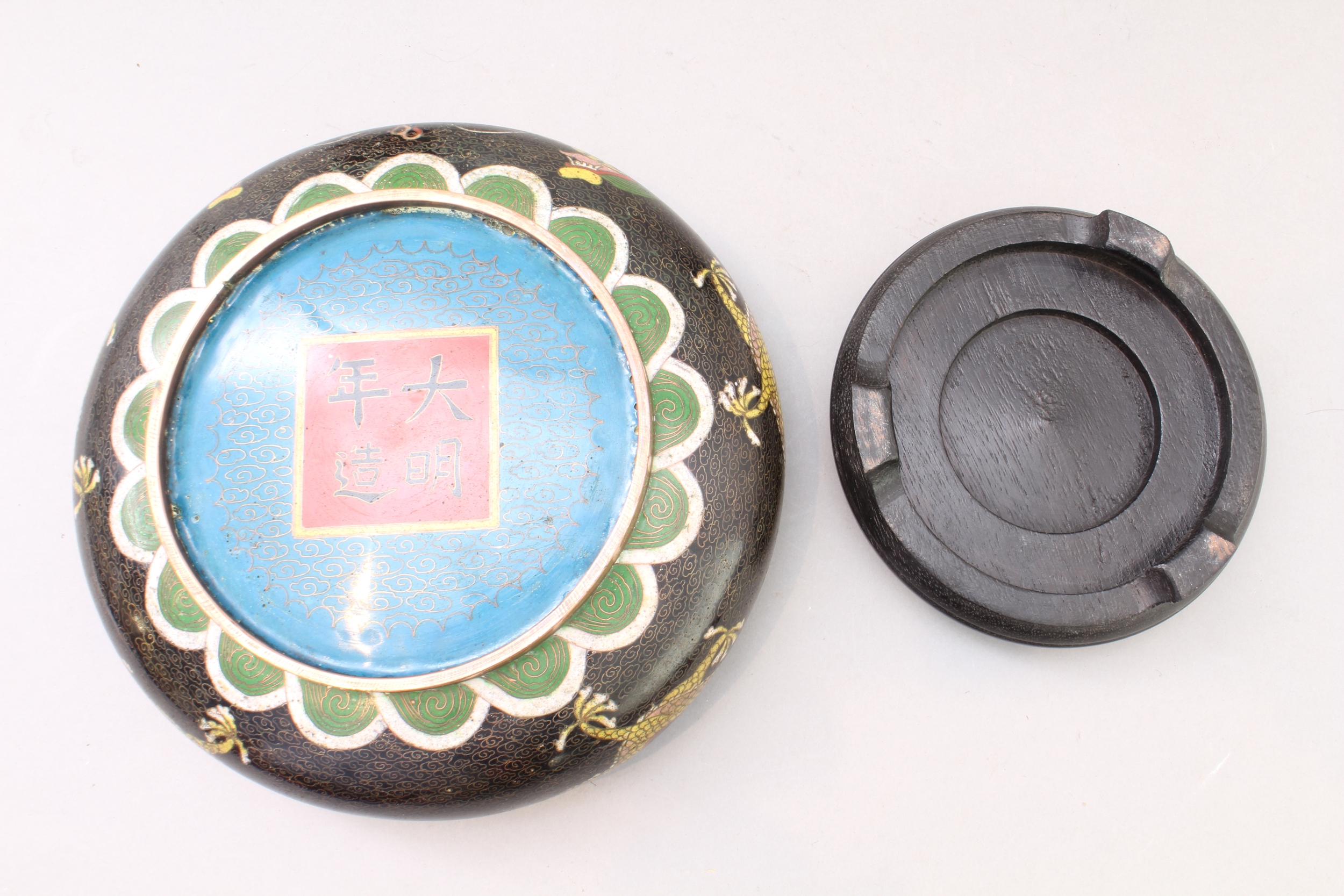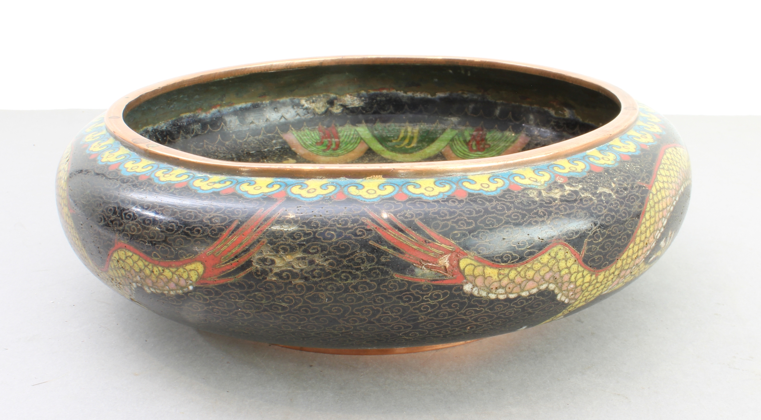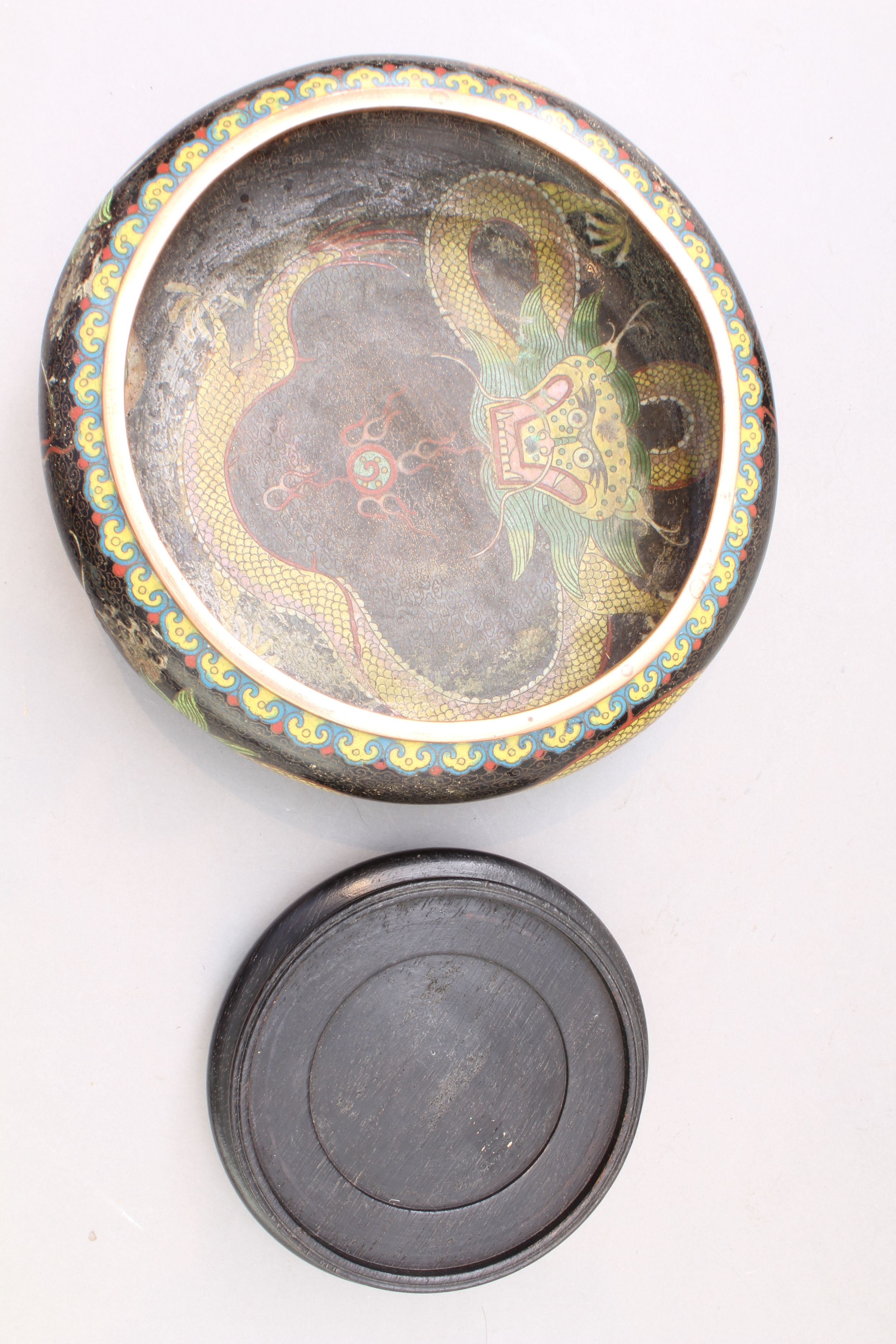 1. a late 19th to early 20th century Chinese bowl of squat spherical form: the border finely decorated with two five-claw Imperial yellow dragons contesting the sacred flame pearl of wisdom above lappets; the interior similarly decorated with a single Imperial yellow five-claw dragon and flaming pearl, unenamelled circular copper foot; the underside with and enamelled four-character mark within square red-enamel reserve; carved circular wooden stand. (20.5 cm in diameter).