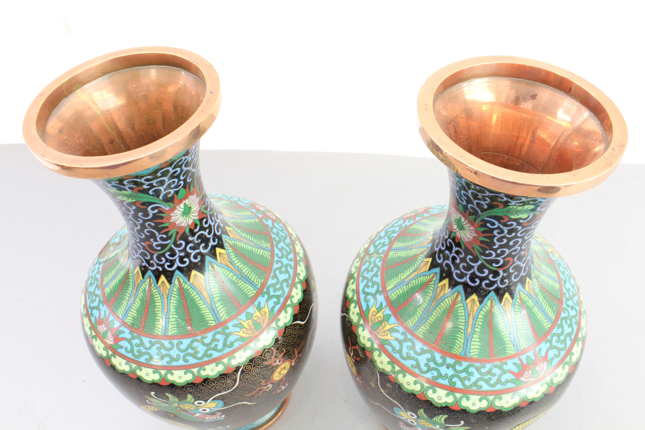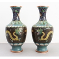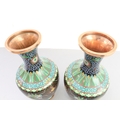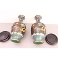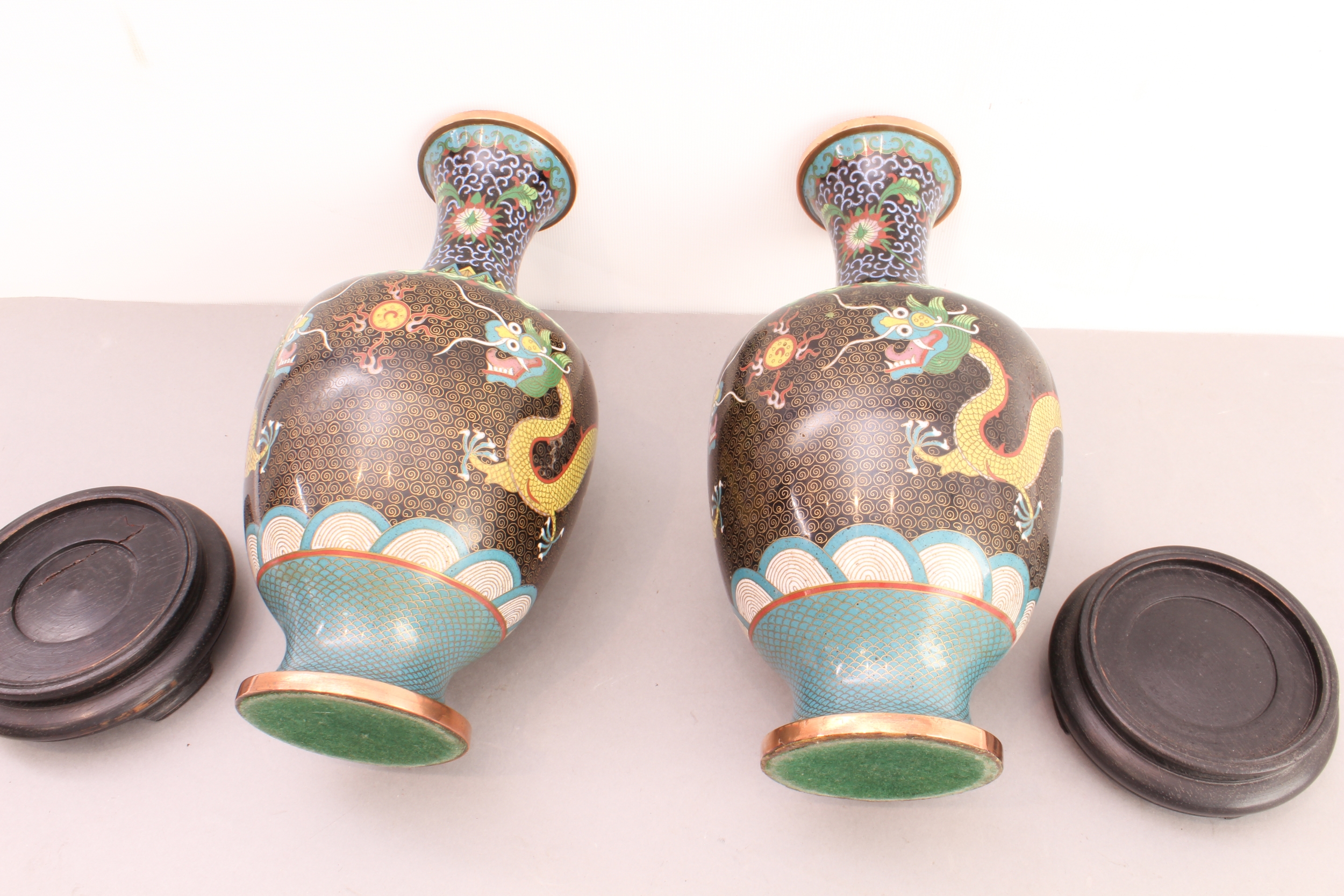 2. a pair of similarly decorated vases, both drilled and on non-matching carved circular wooden stands (23.5 cm high excluding stands)