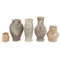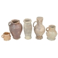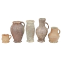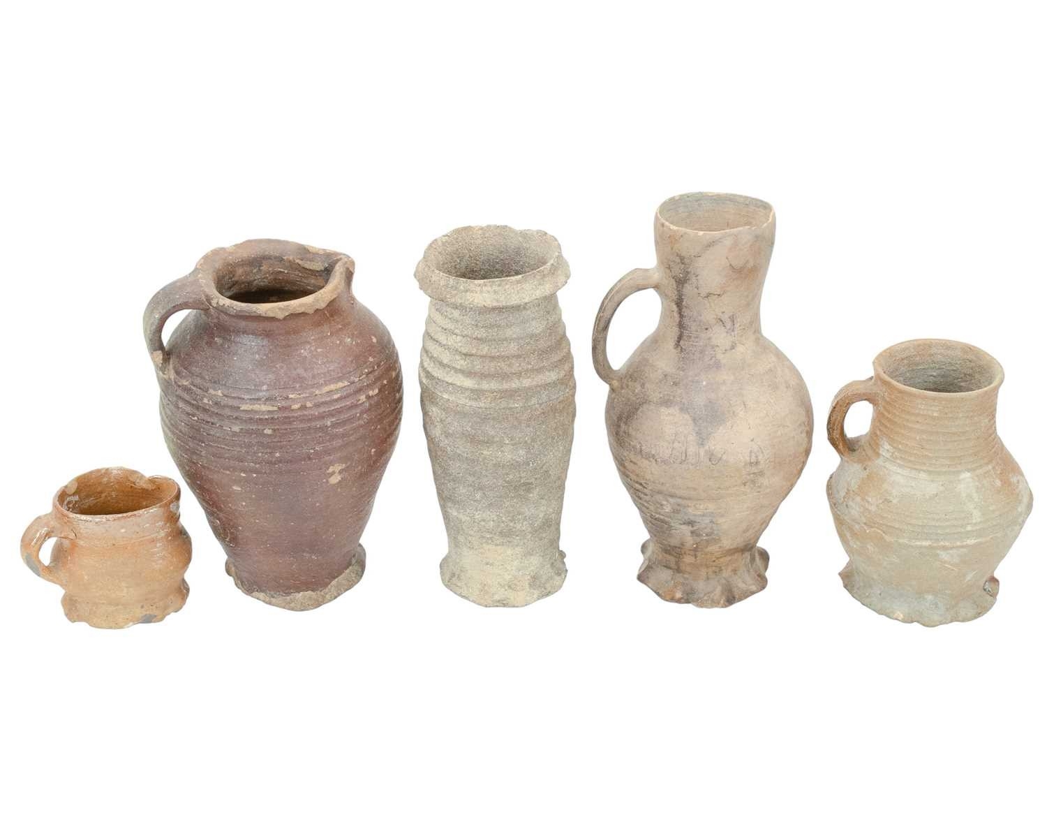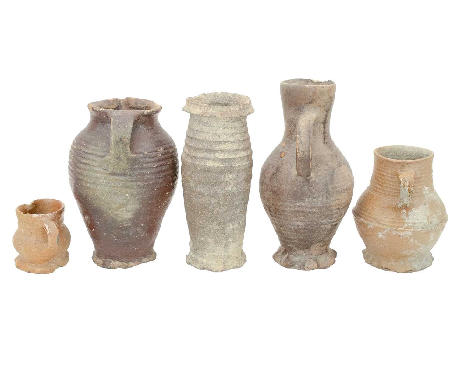 German medieval pots. 14th-16th century, comprising three jugs, with ribbed turning and thumb moulded feet, the tallest height 24cm, an urn, and a small jug (5). The collection of the late potter Peter Smith of Bojewyan Pottery in West Cornwall. Fellow of the Craftsman Potters Association, member of Newlyn Society of Artists and later chairman of Newlyn Gallery. Peter was also an influential teacher of ceramics at Falmouth University, where he encouraged a spontaneous and improvised approach based on developing technique and an understanding of the medium of clay as an expressive and practical form. Peter originally started as a research chemist before turning to pottery after attending evening classes. He started his own pottery at Bojewyan in West Cornwall in 1974. As well as being a renowned and experimental potter and tutor, he was also a keen collector of medieval and later pottery from the UK and further afield. His Guardian obituary can be read here:https://www.theguardian.com/artanddesign/2025/aug/13/peter-smith-obituary