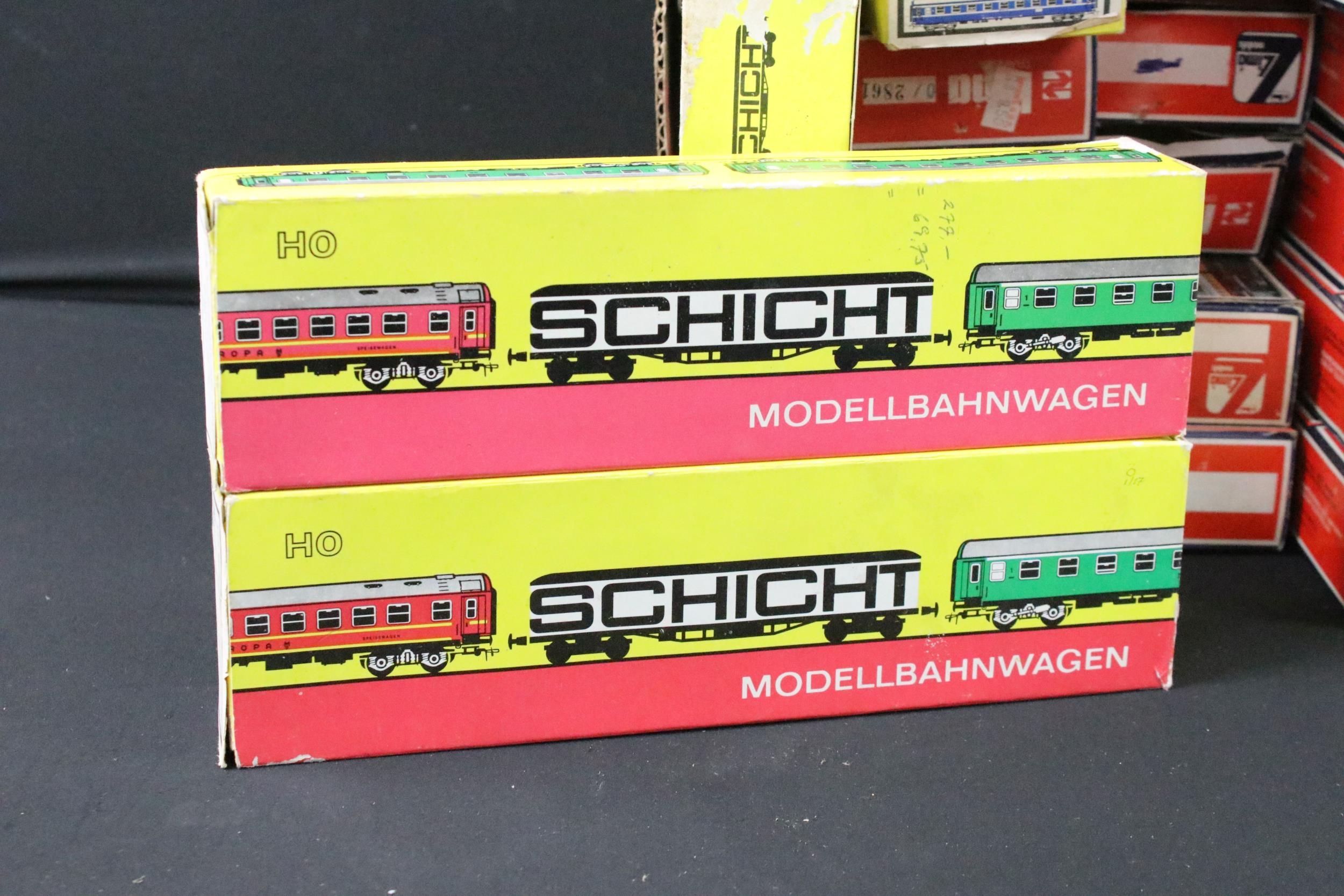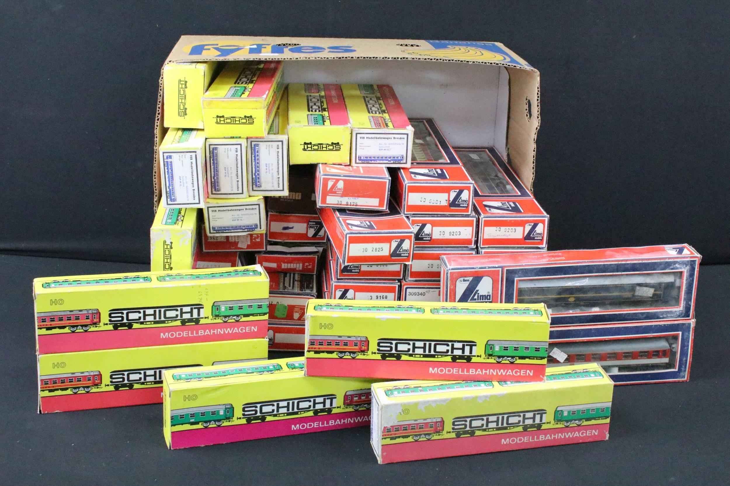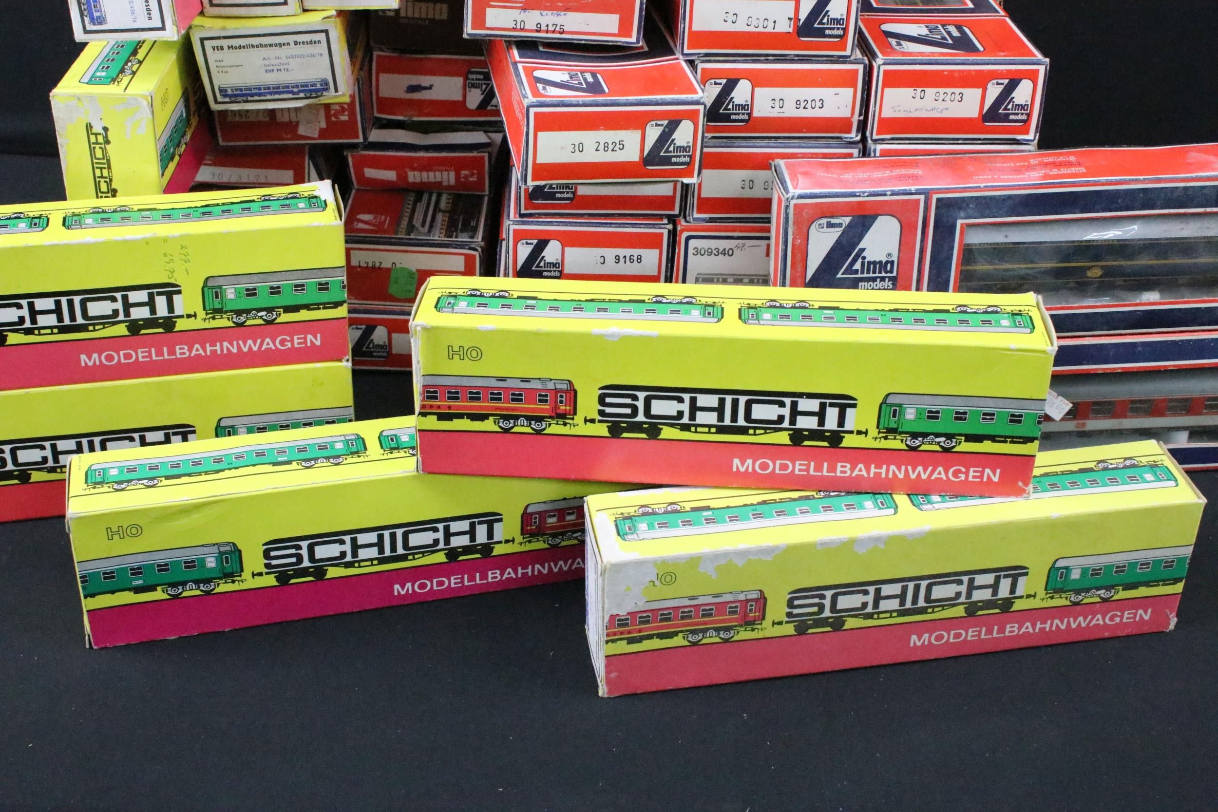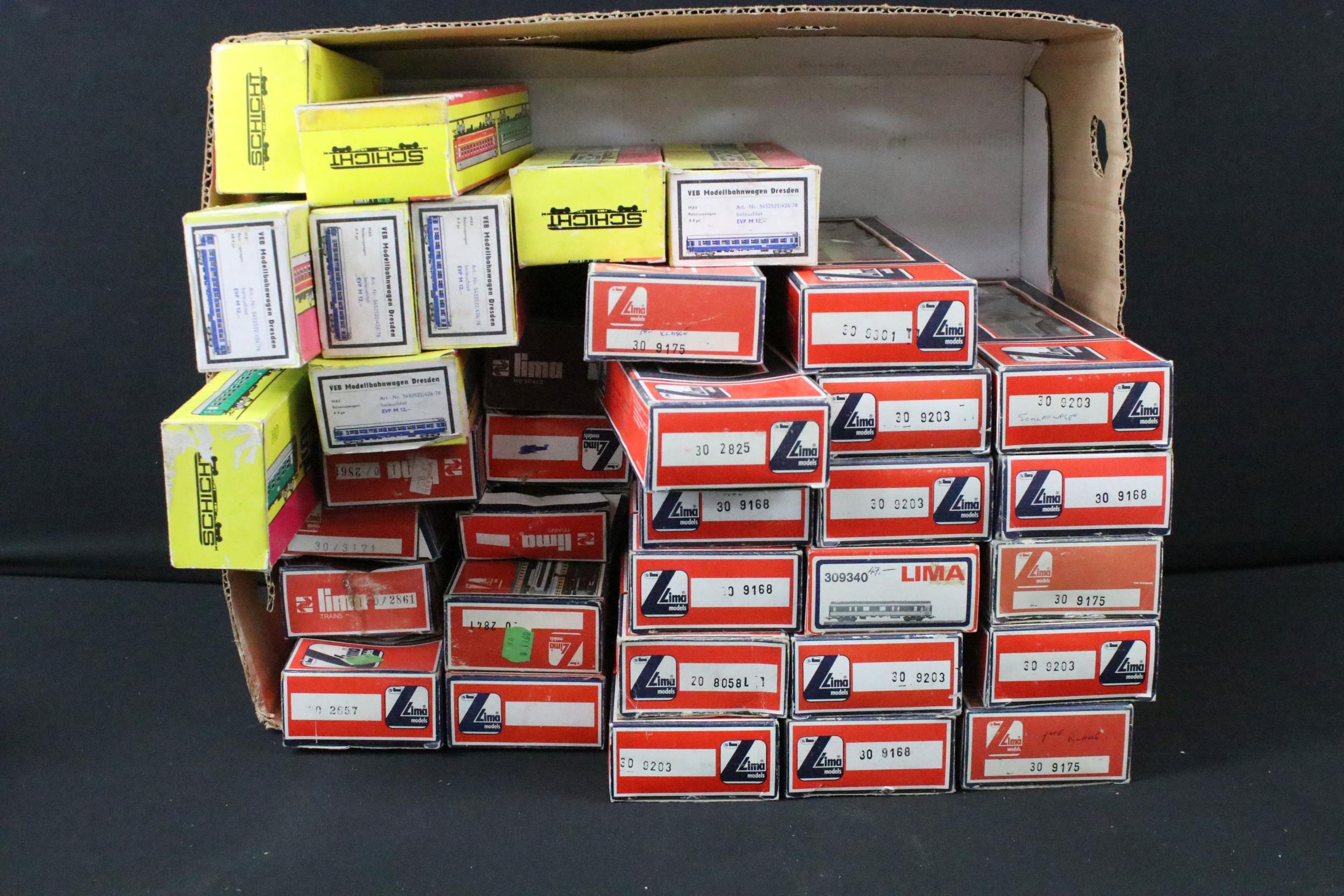 42 Boxed HO / OO gauge items of rolling stock to include 28 x Lima and 14 x Schicht, featuring coaches and wagons