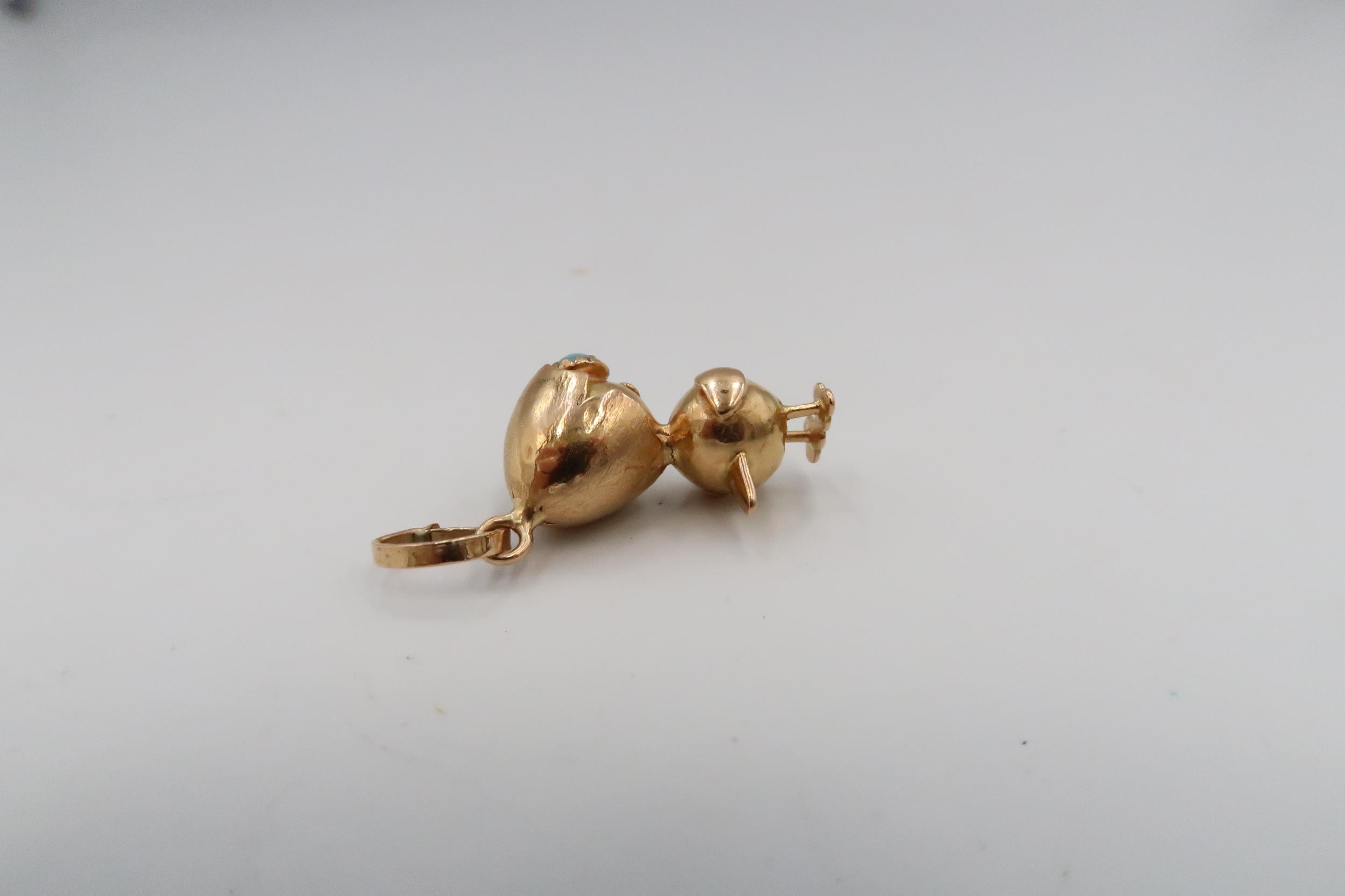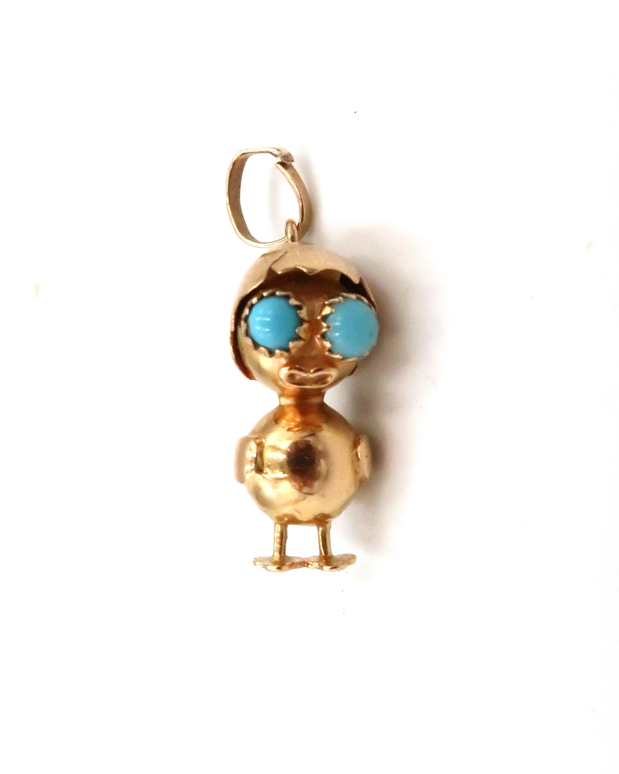 An 18ct gold and turquoise pendant in the form of a chick with an eggshell hat and turquoise set eyes, 4.8g.