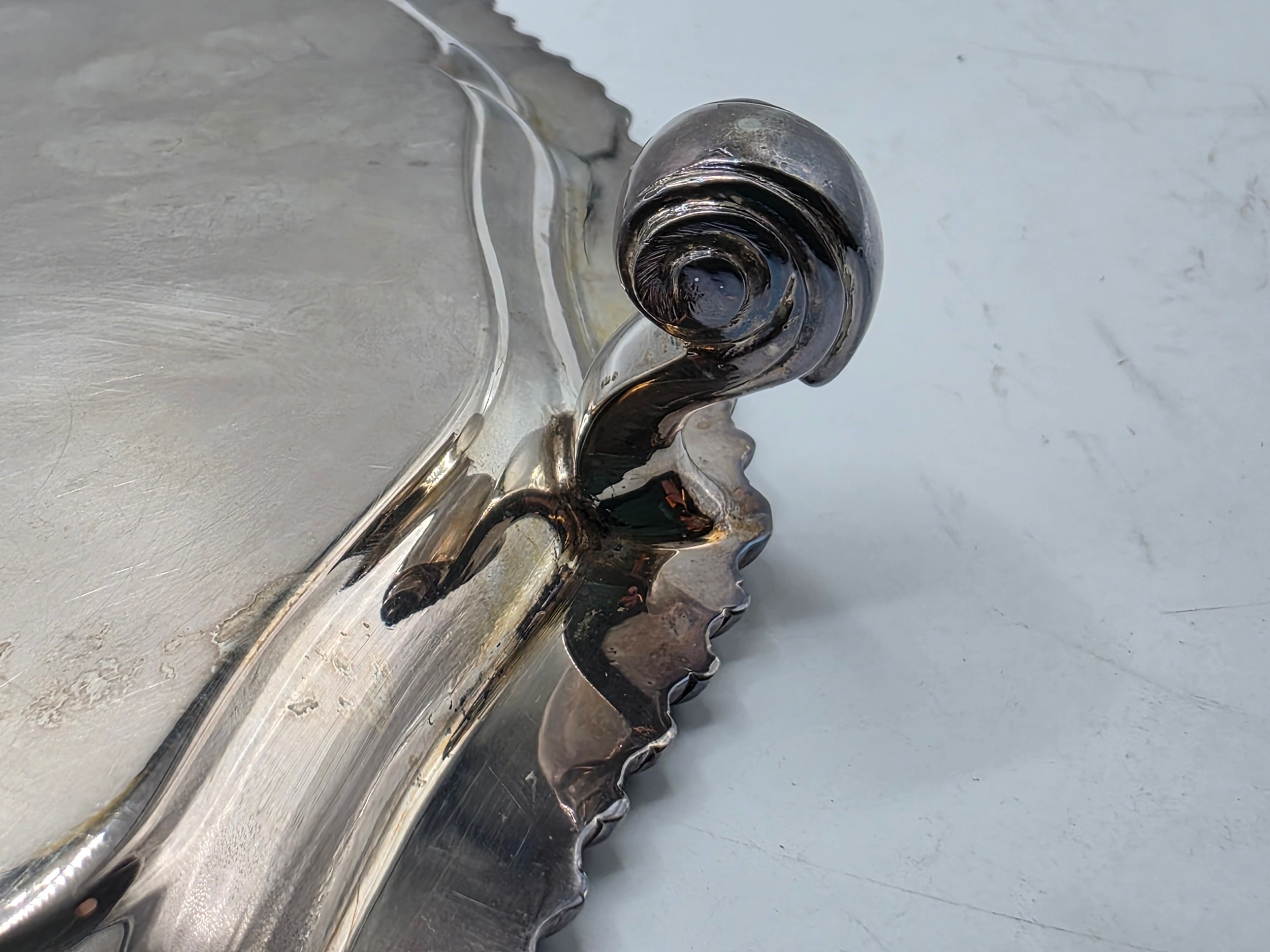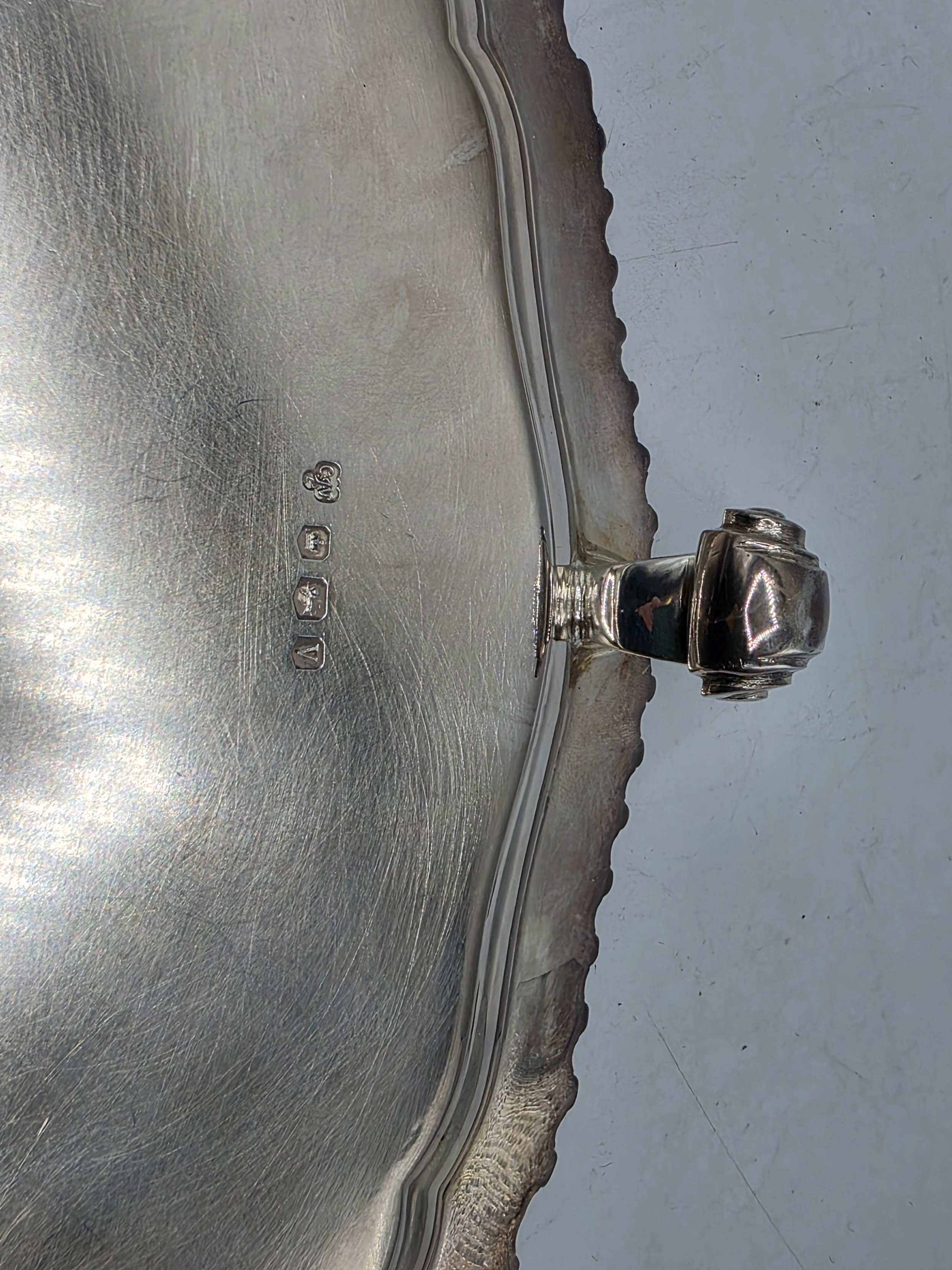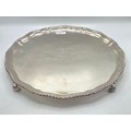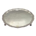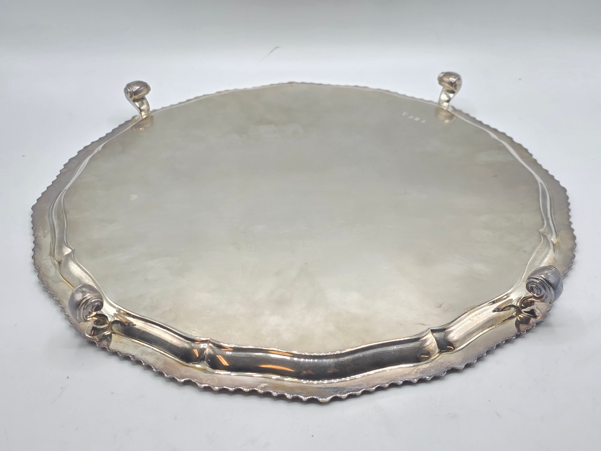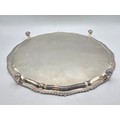 A large sterling silver tray with cast rim and on four scroll feet. 36cm(d). By CJ Vander Ltd Sheffield. 1963. 1378g