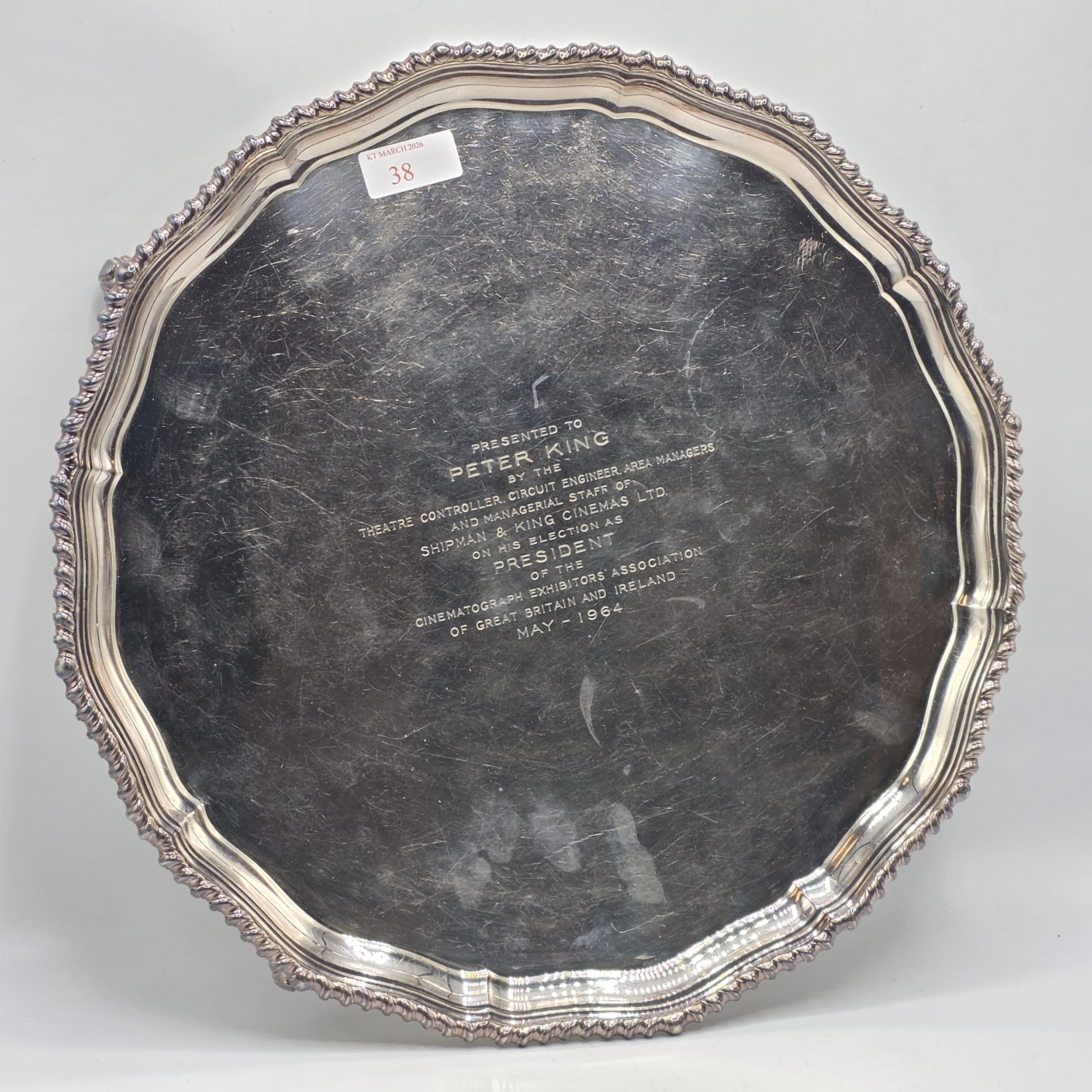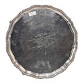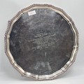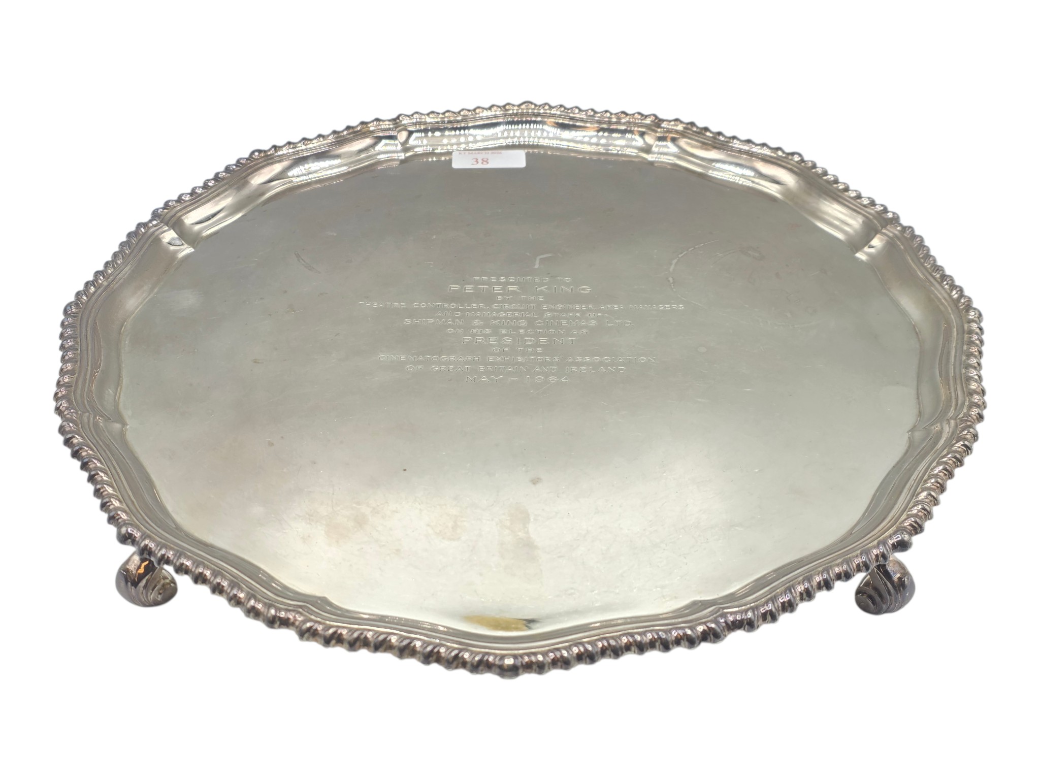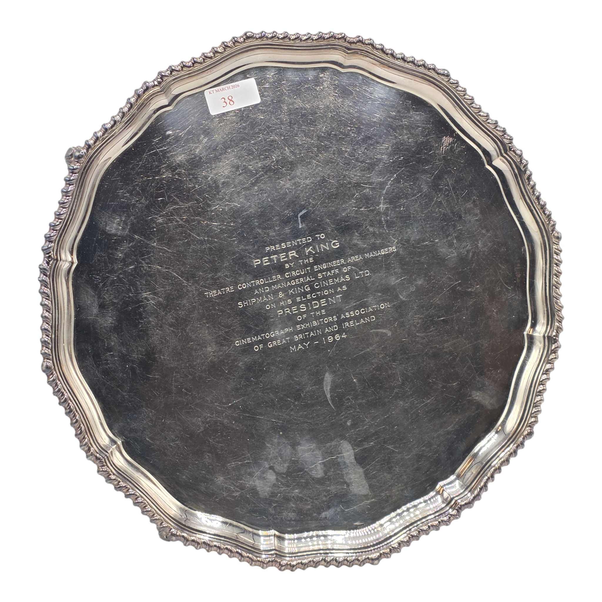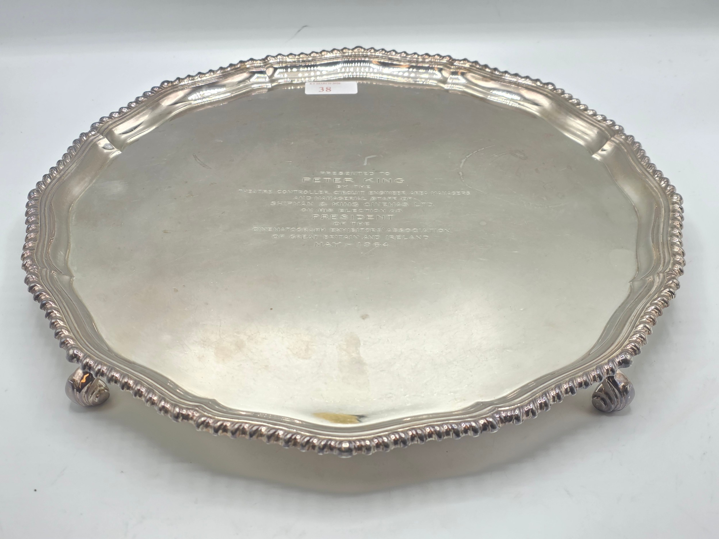 A large sterling silver tray with cast rim and on four scroll feet. 36cm(d). By CJ Vander Ltd Sheffield. 1963. 1378g