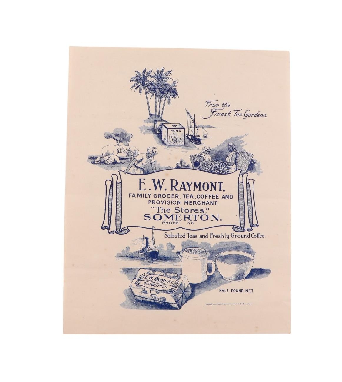 Local Interest. An early 20th century advertising poster for EW Raymont "The Stores Somerton", 28 by 36cms.