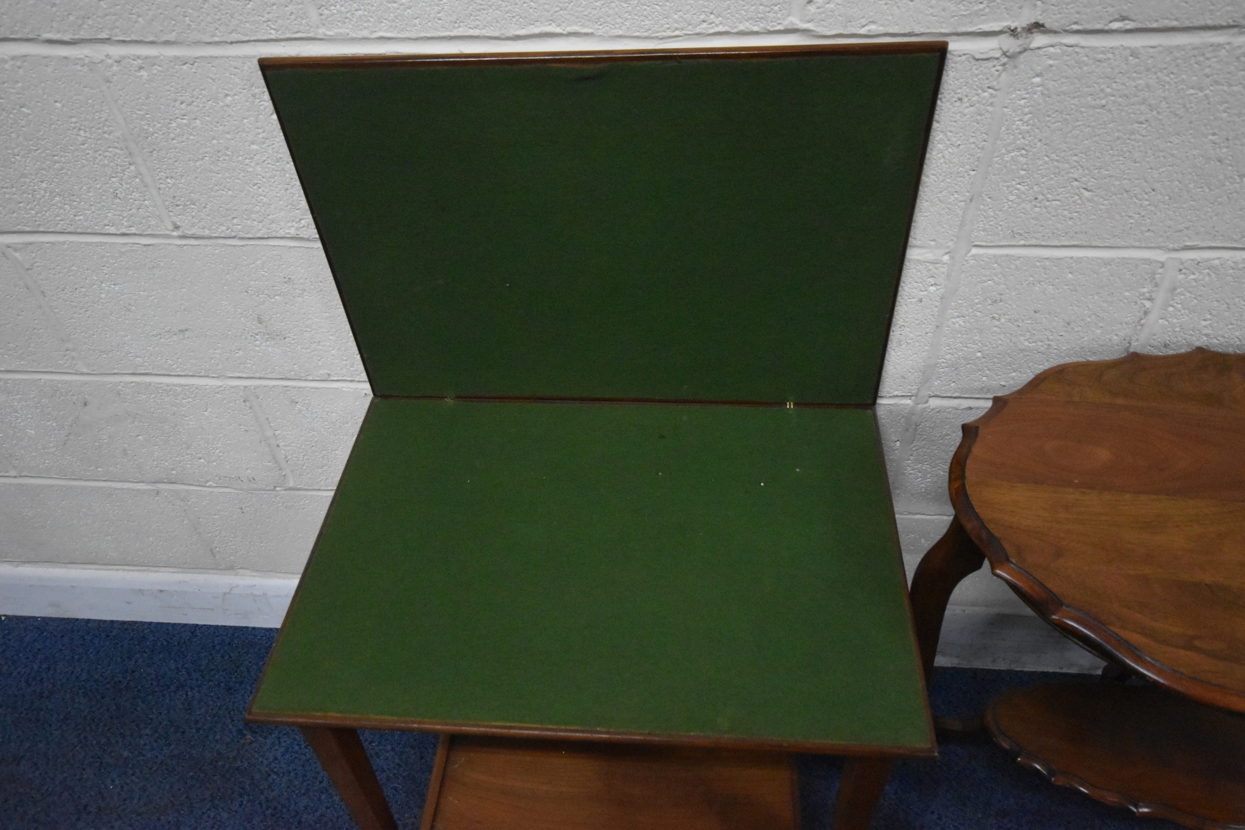 A 20TH CENTURY OVAL TABLE, with a wavy edge, raised on four shaped legs, united by an undershelf, width 82cm x depth 49cm x height 74cm, a walnut trolley, the swivel fold over top enclosing a green baize, along with a small oak stool, condition report: all with imperfections, such as marks, scuffs, stains, discolouration, other wear and usage (3)