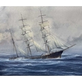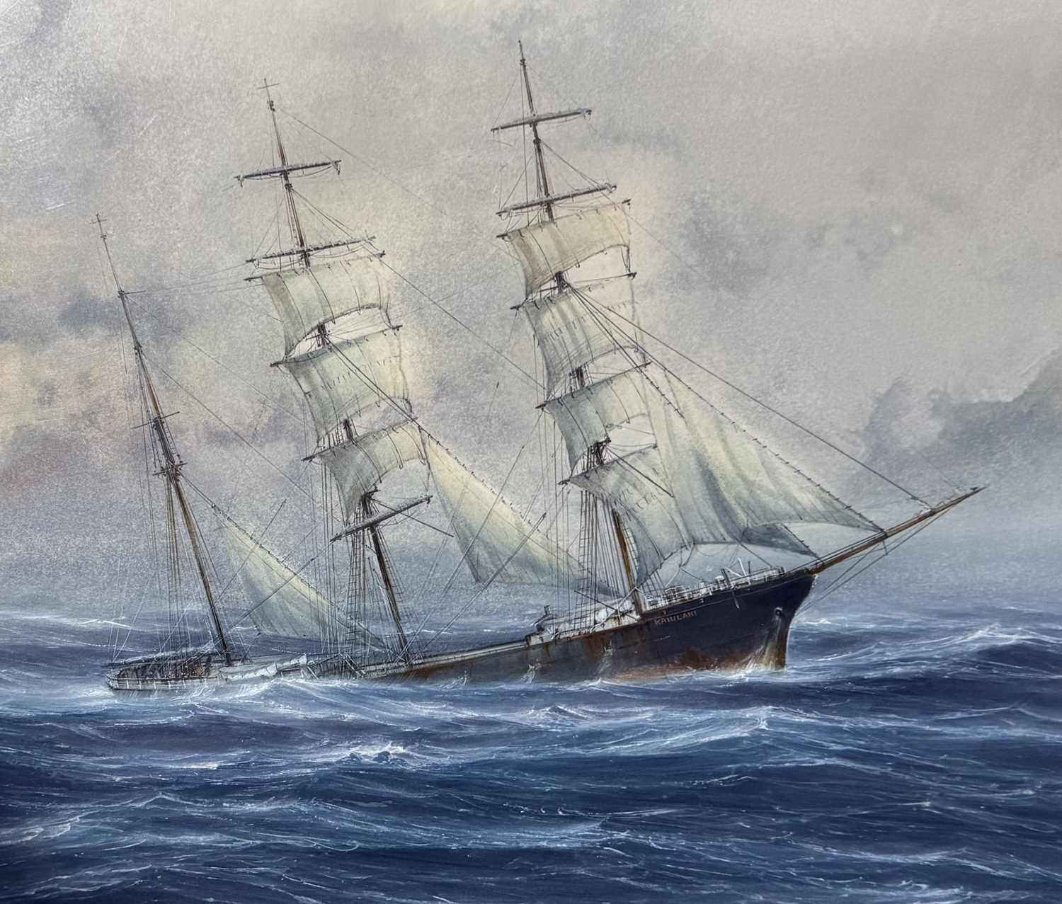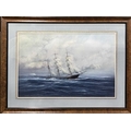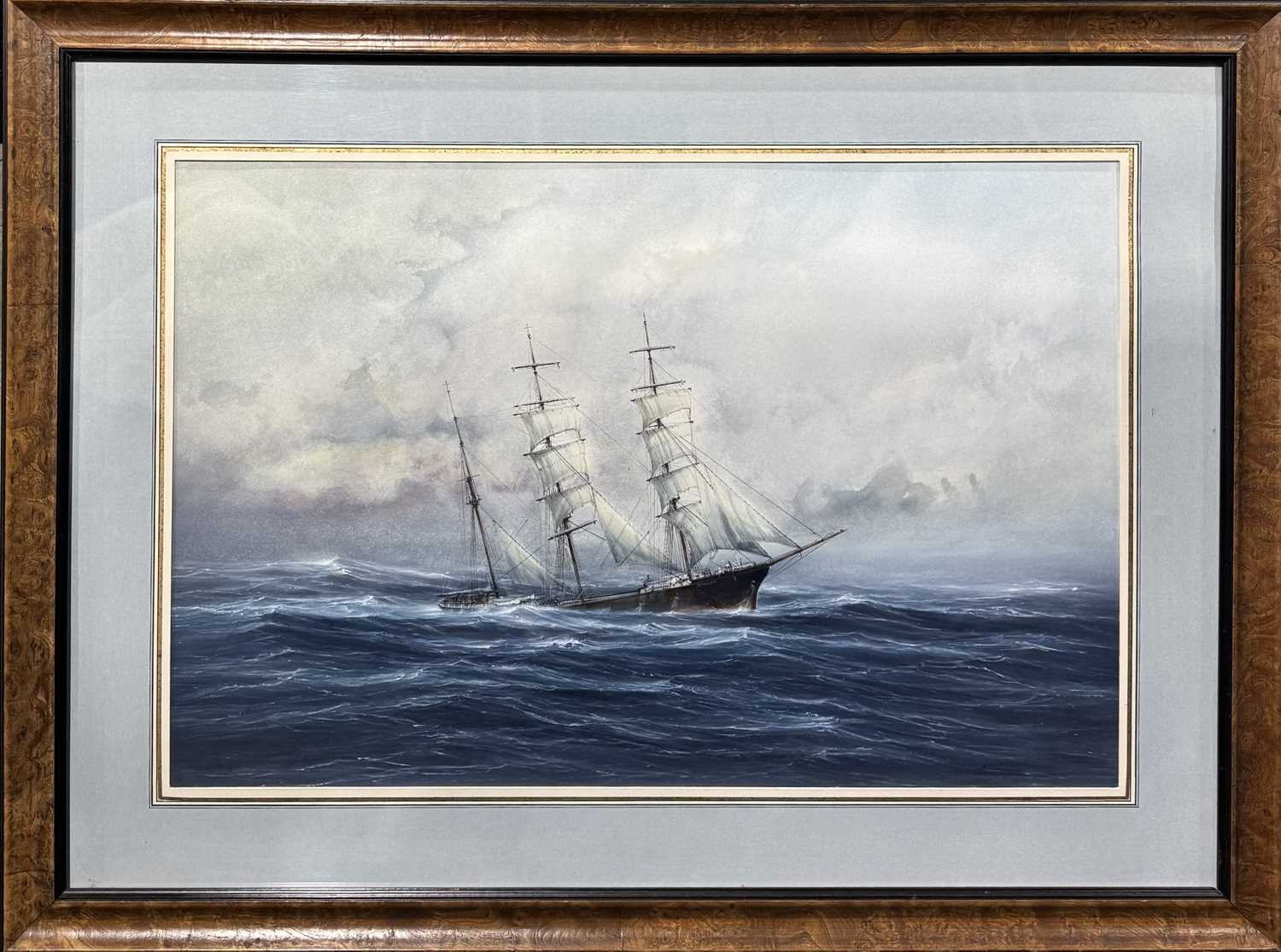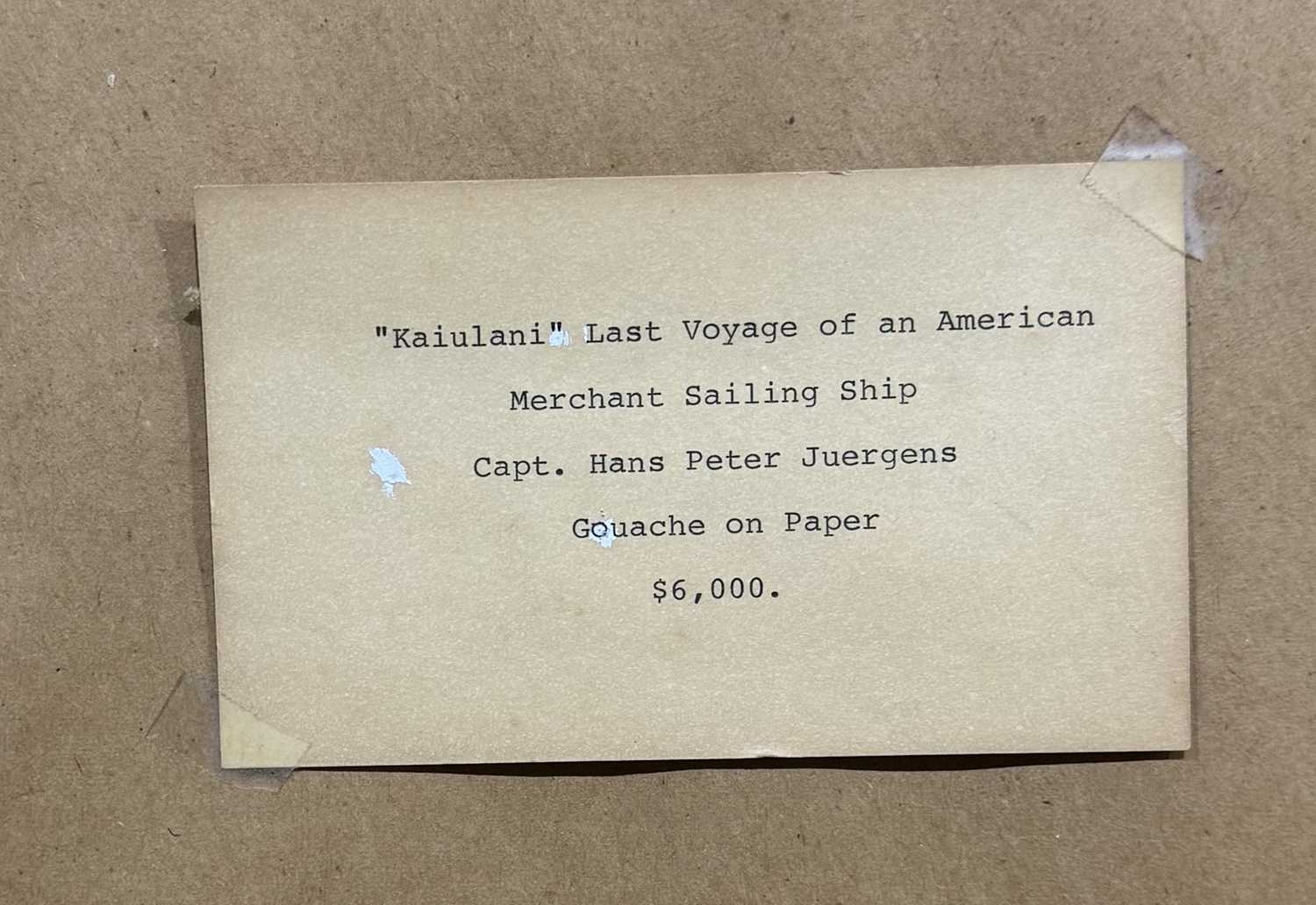 Hans Peter Jurgens (German, 1924-2018), 'Kaiulani Last Voyage of an American Merchant Sailing Ship' seascape, gouache on paper, backing label with retail price of $6000, 43 by 66cm, burr walnut frame (1)