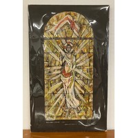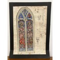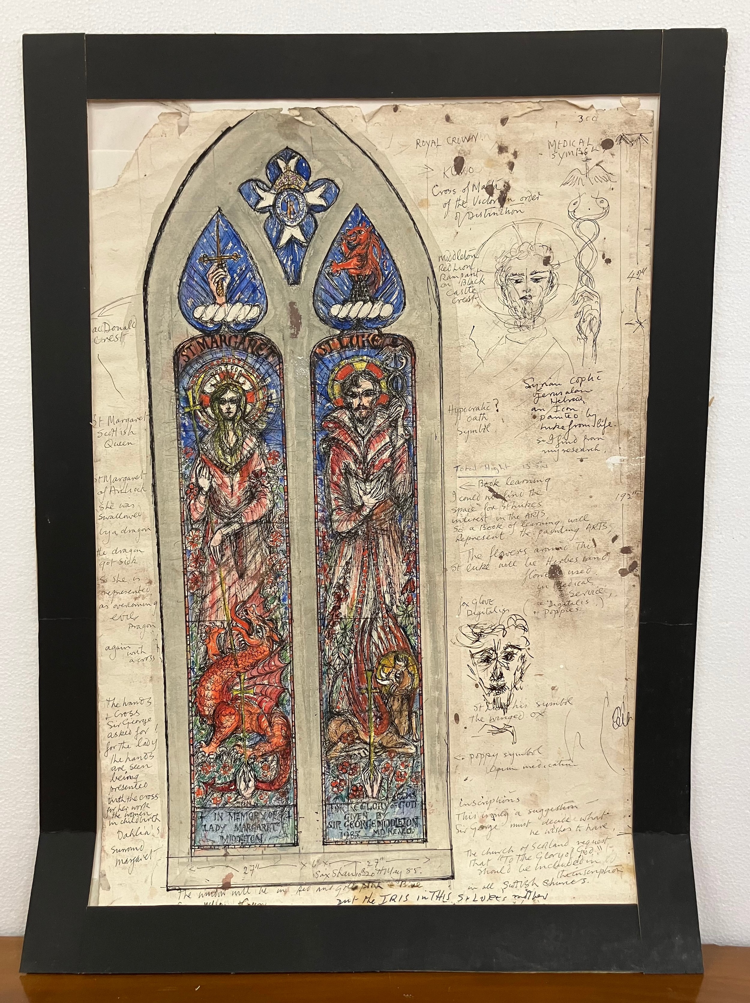 Sax Roland Shaw (1996-2000), study of an ecclesiastical stained glass window, surrounded by handwritten notes and comments by the designer, 54 x 37cms, unframed