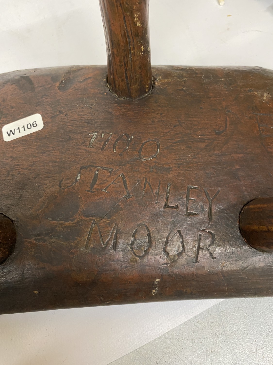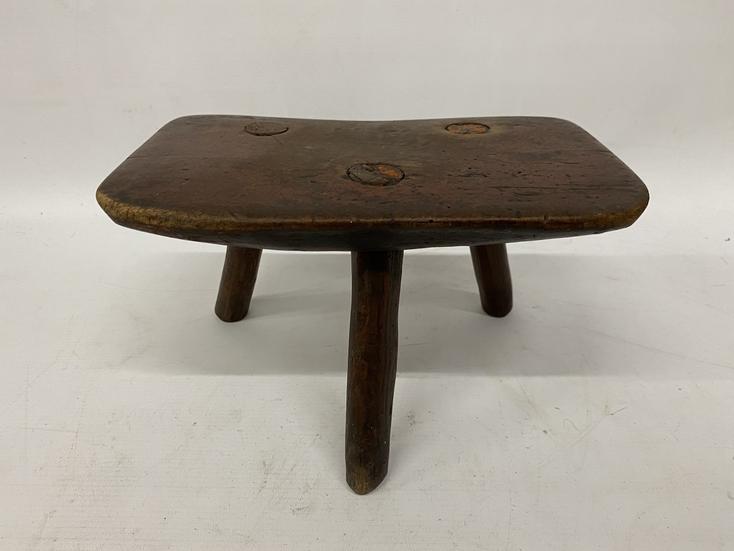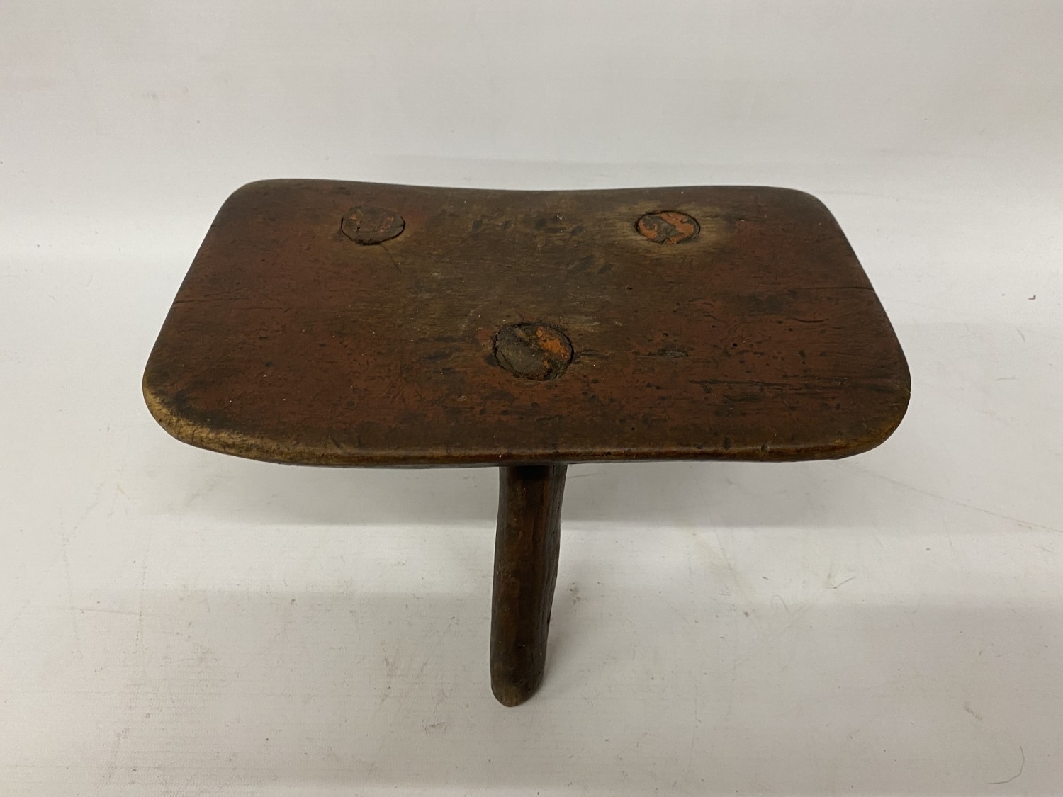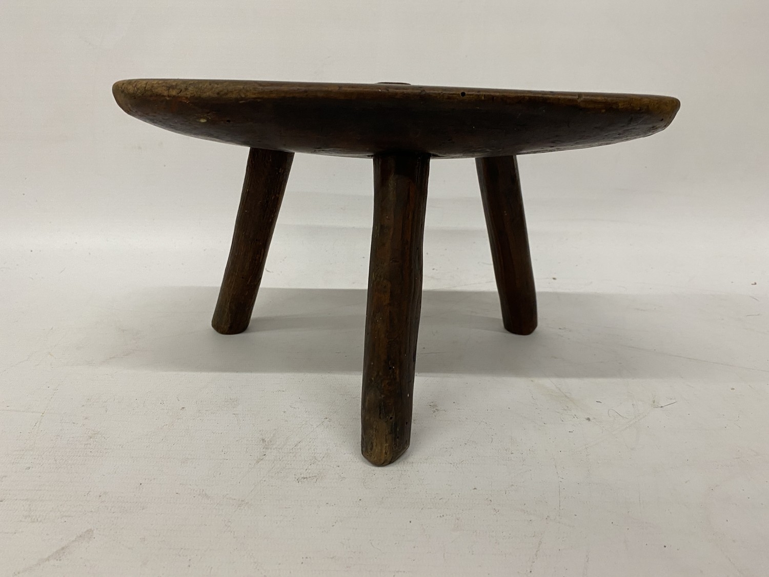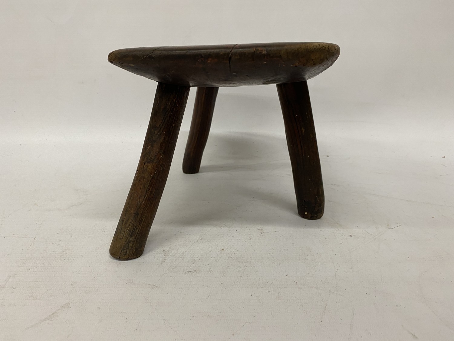 A 325 YEAR OLD MILKING STOOL MARKED TO THE BASE, '1700 STANLEY MOOR'
