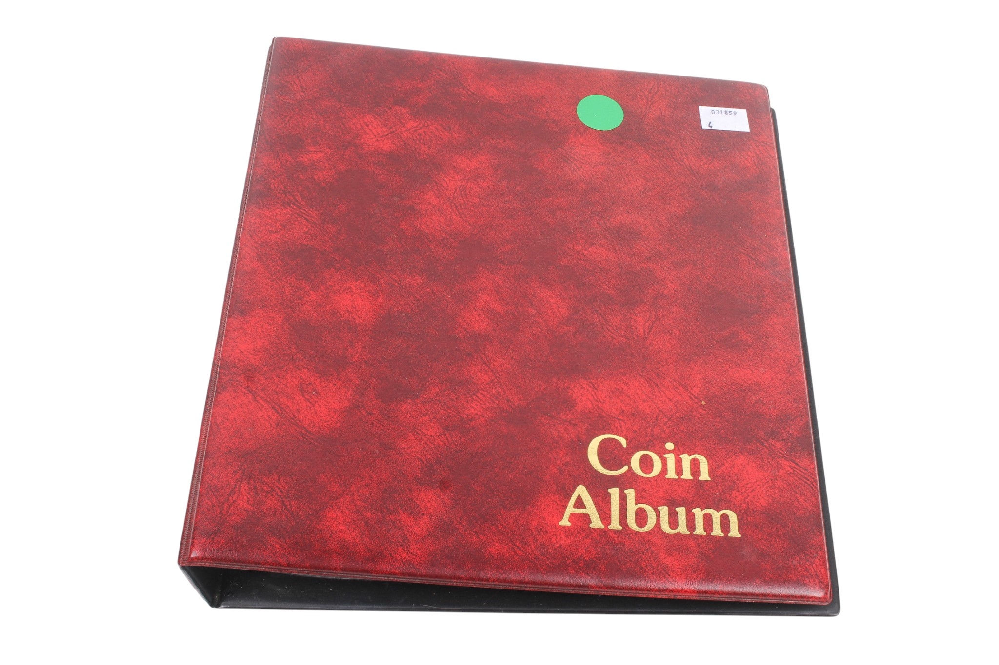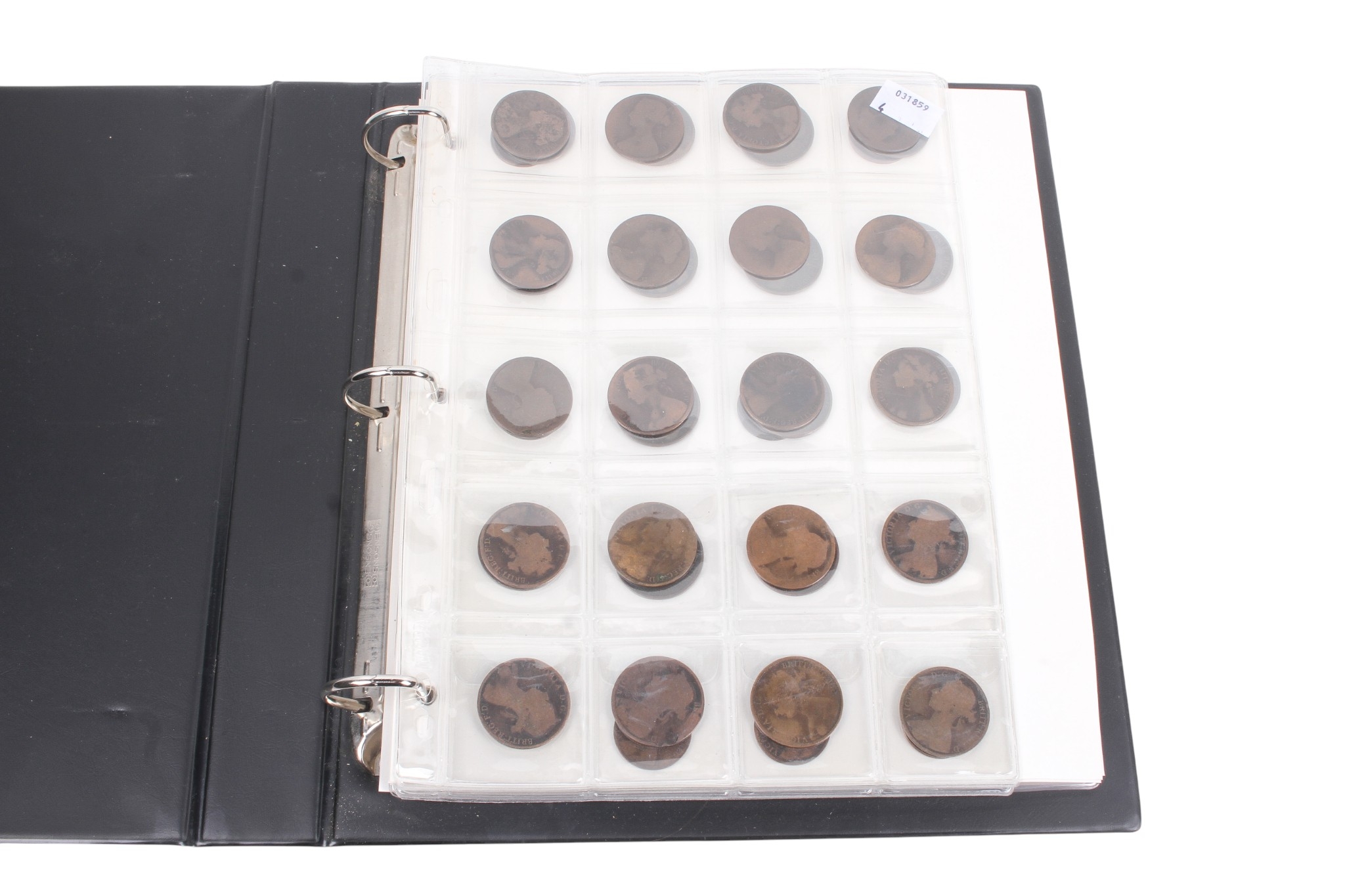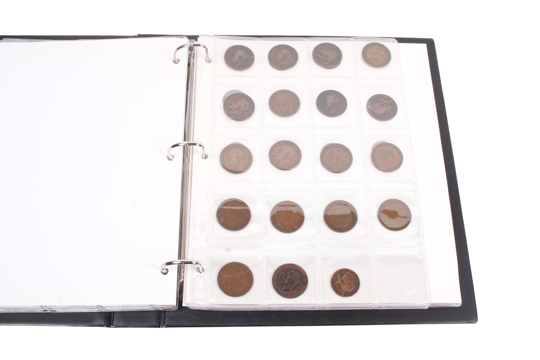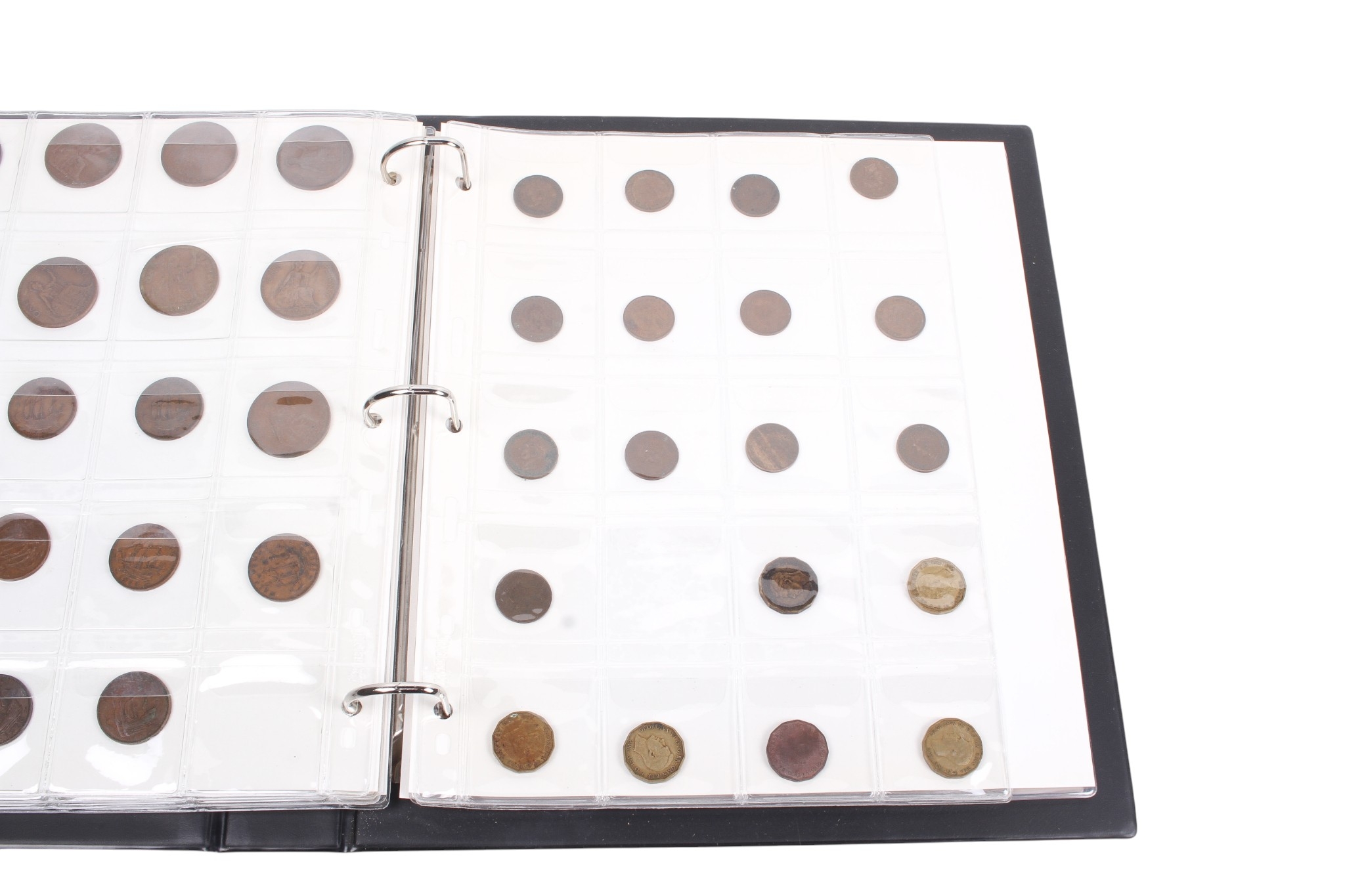 A red album of coins. Including mainly Victorian and 20th century bronze pennies, half pennies and farthings, lots of different dates Victorian pennies