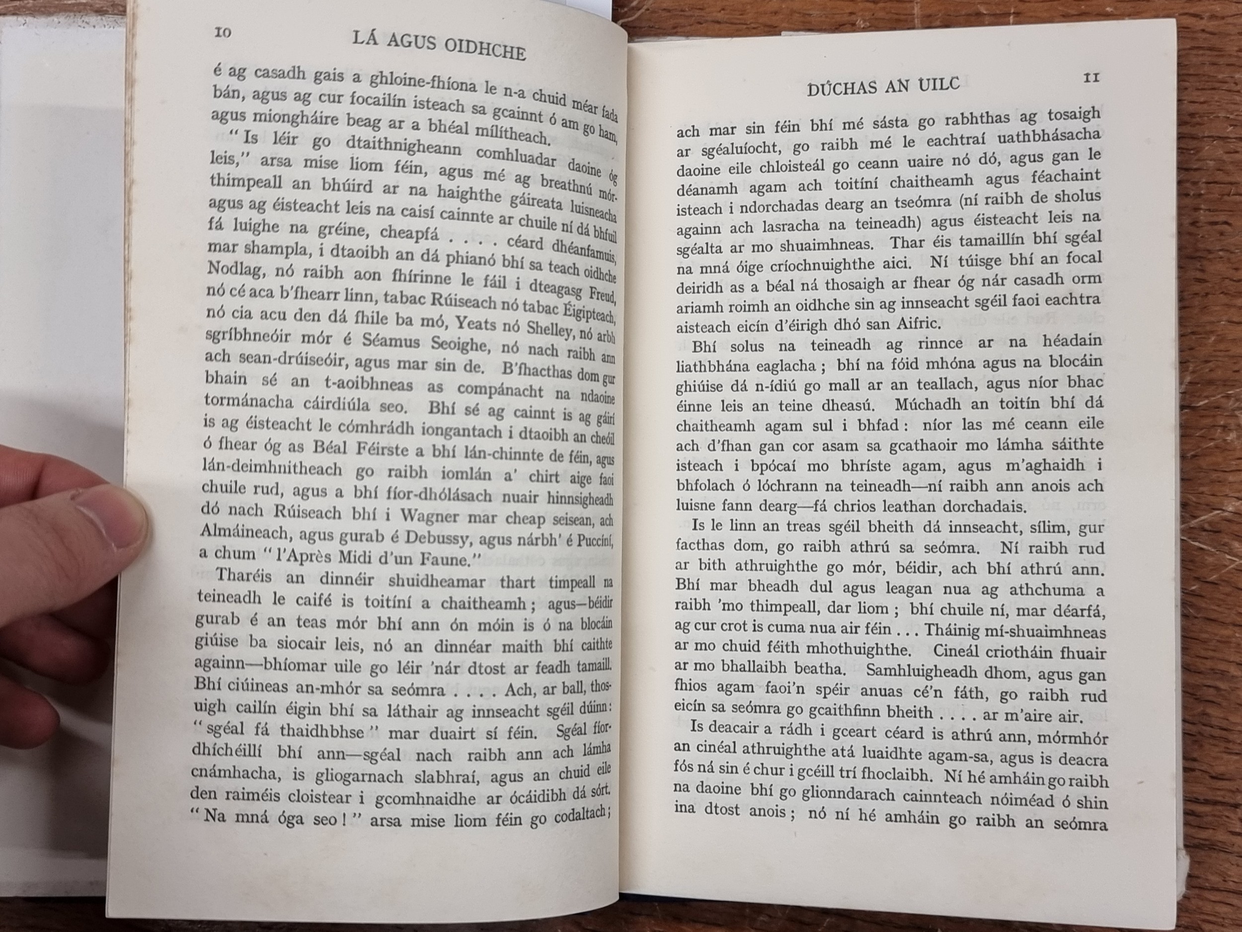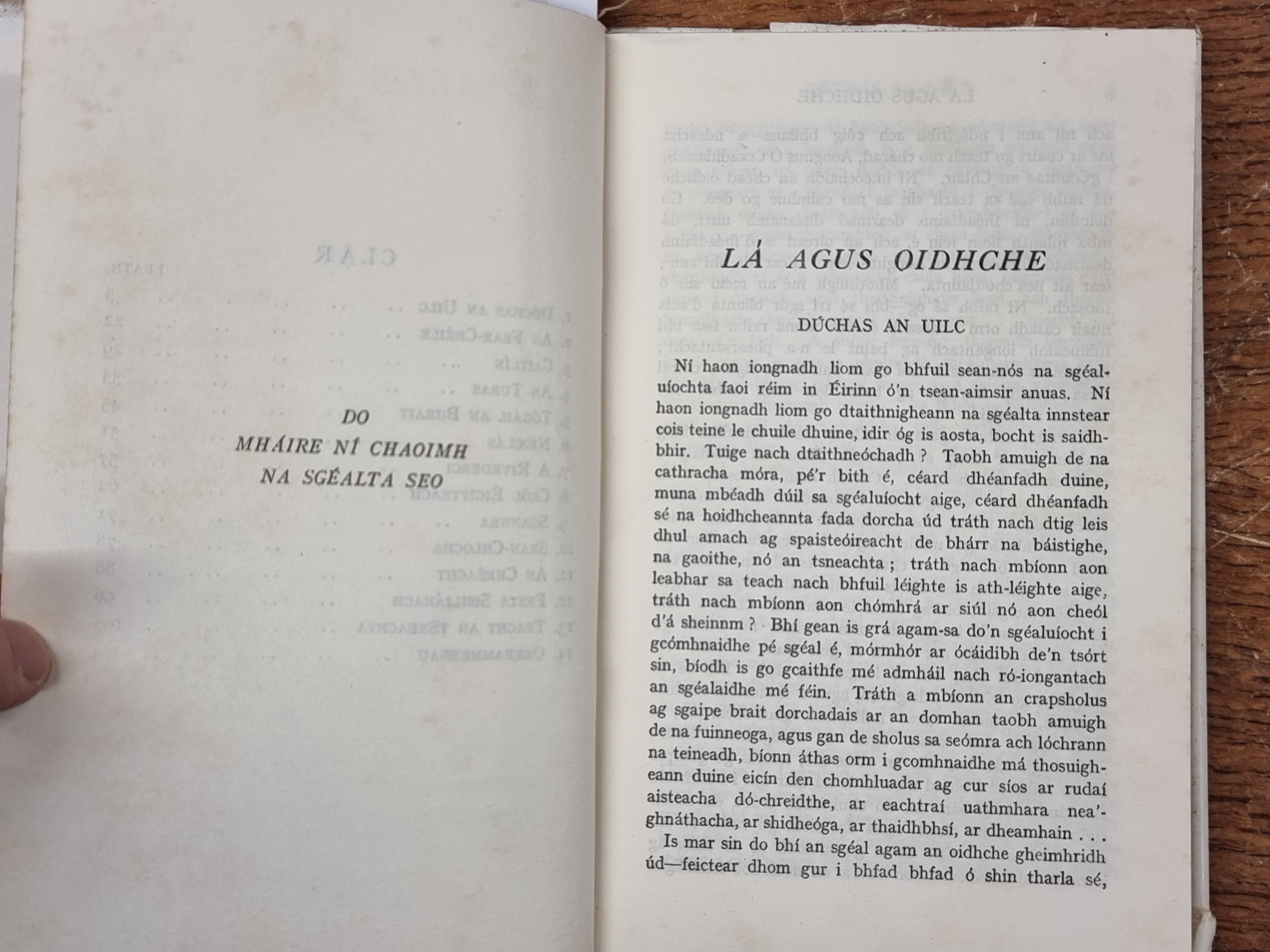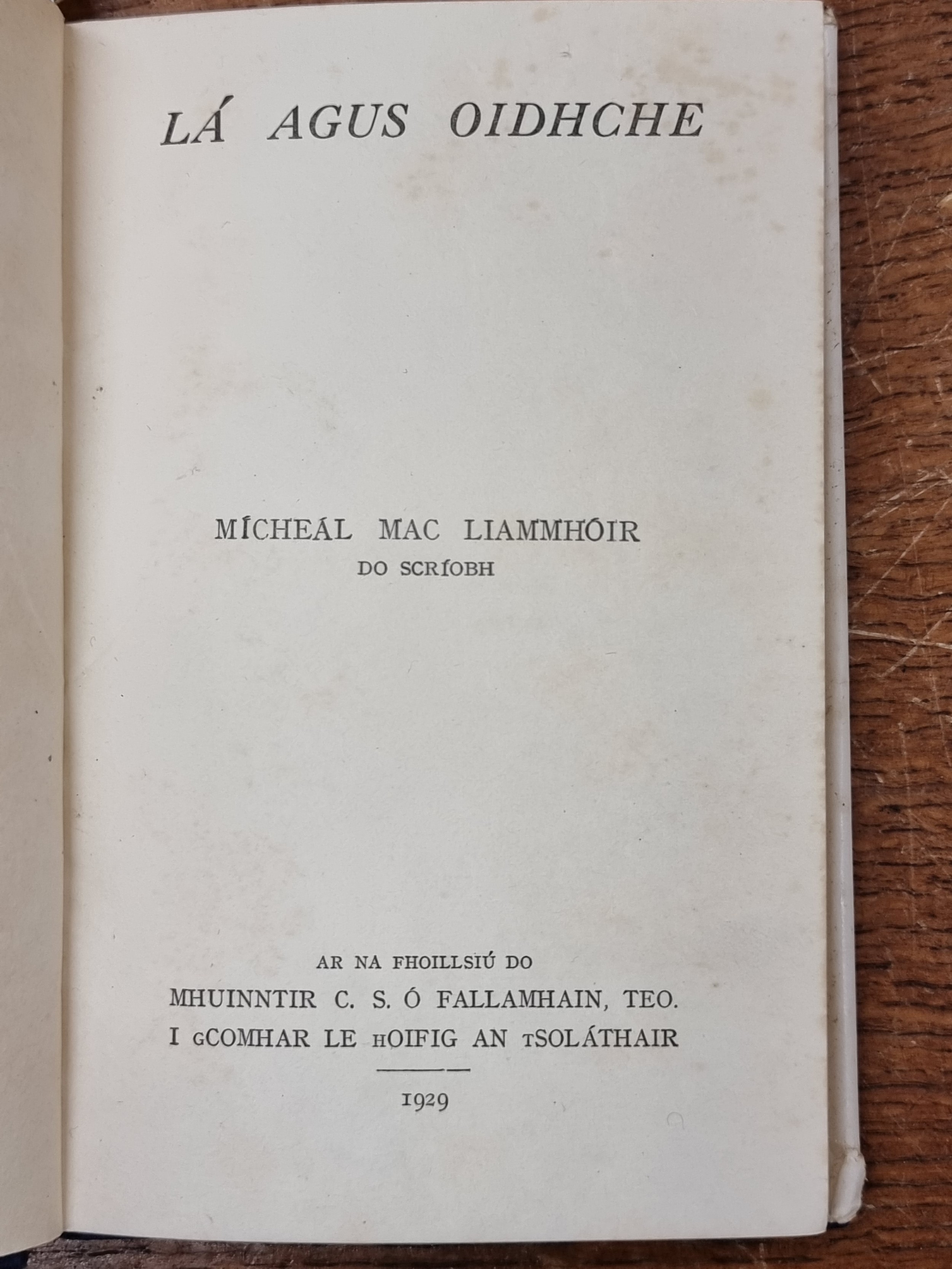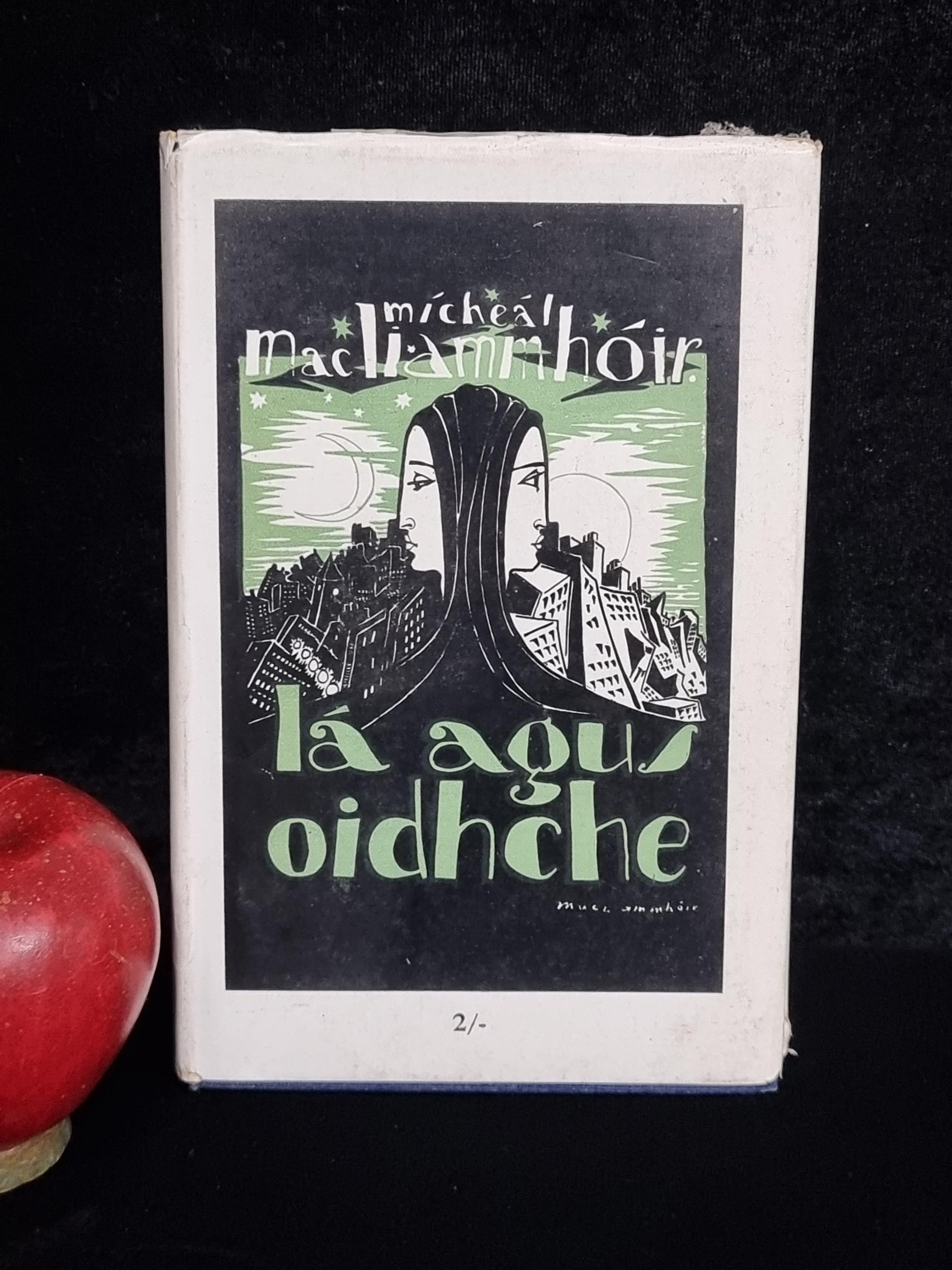 A truly gorgeous hardback first edition of "Lá agus Oidhche" by Micheál MacLiammóir, with original dust jacket. Published by Mhuinntir C. S. O Fallamhain, Teo. in 1929. Fabulous cover art. Other lesser copies of this book are selling for $66 on abebooks.com