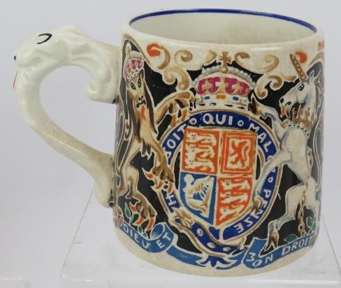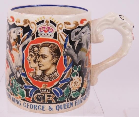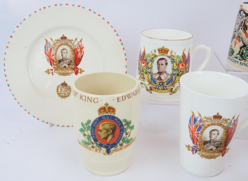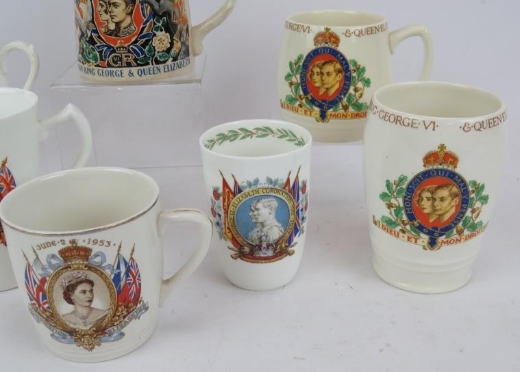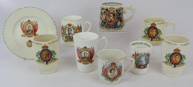 A George VI Coronation mug designed by Dame Laura Knight, 3 other George VI cups, a Queen Elizabeth II Coronation mug and four pieces of Edward VIII Commemorative ware. (9).