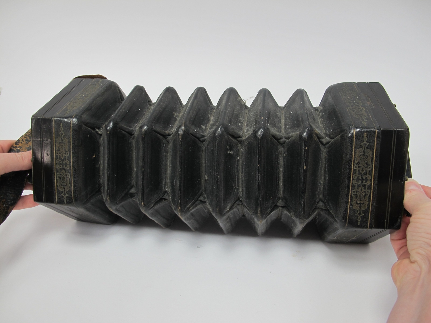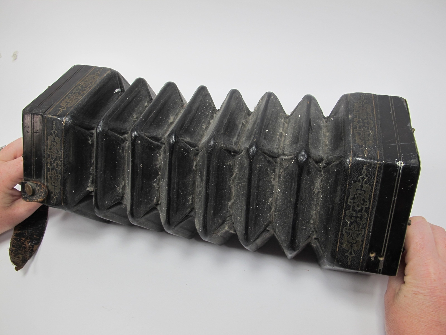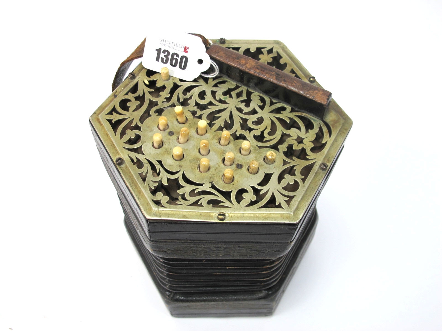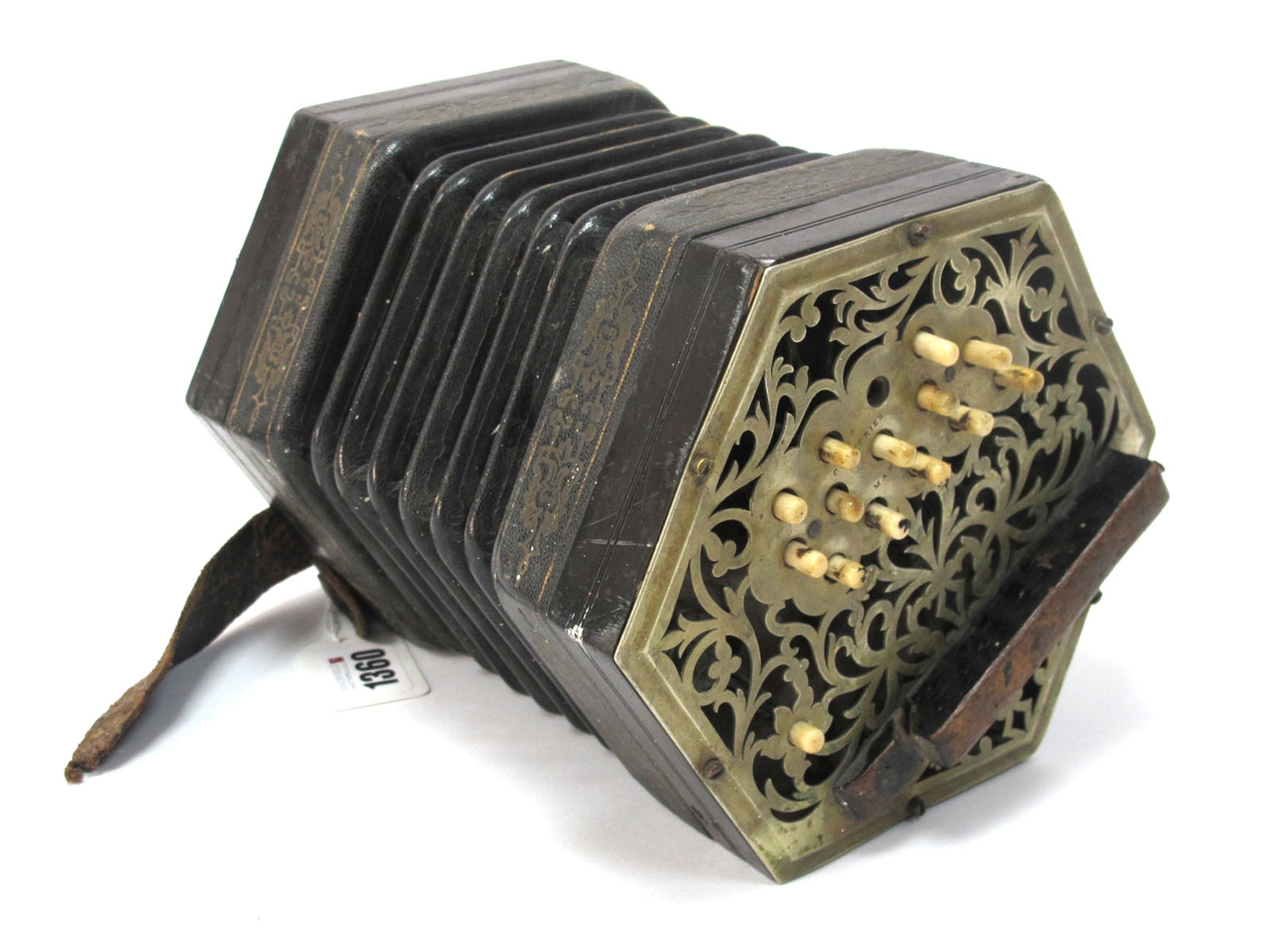 Lot 1360 - one button is stiff, one is absent, a sound is produced when pushing and pulling the bellow, even without pushing the buttons, no visible tears to the bellows, 3.0 x 0.5cm wooden strip absent to one side, scuffing on corners of some bellows, scratching, general wear.