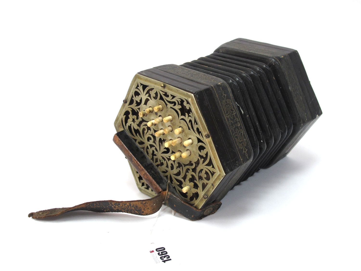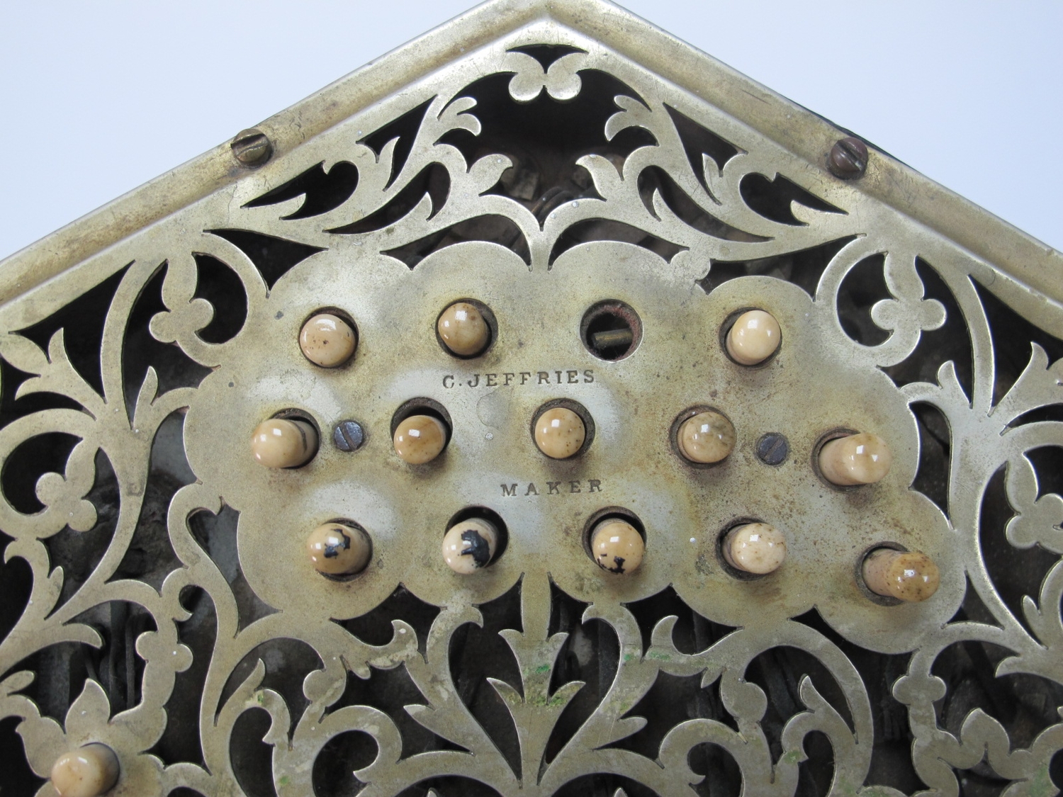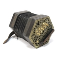 C. Jefferies Concertina, with thirty buttons (one absent), six section leather bellows, fret cut nickel ends, stamped ''C.Jeffries Maker', 22cm long, 17.5cm widest, measure of hexagonal ends (no box).