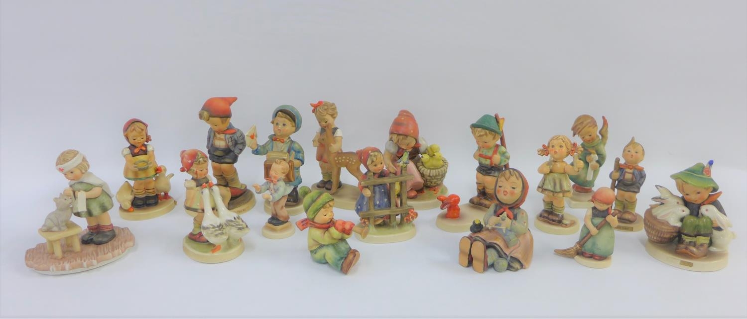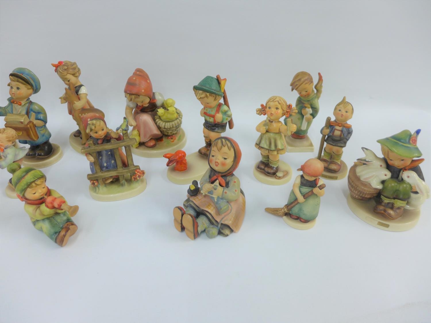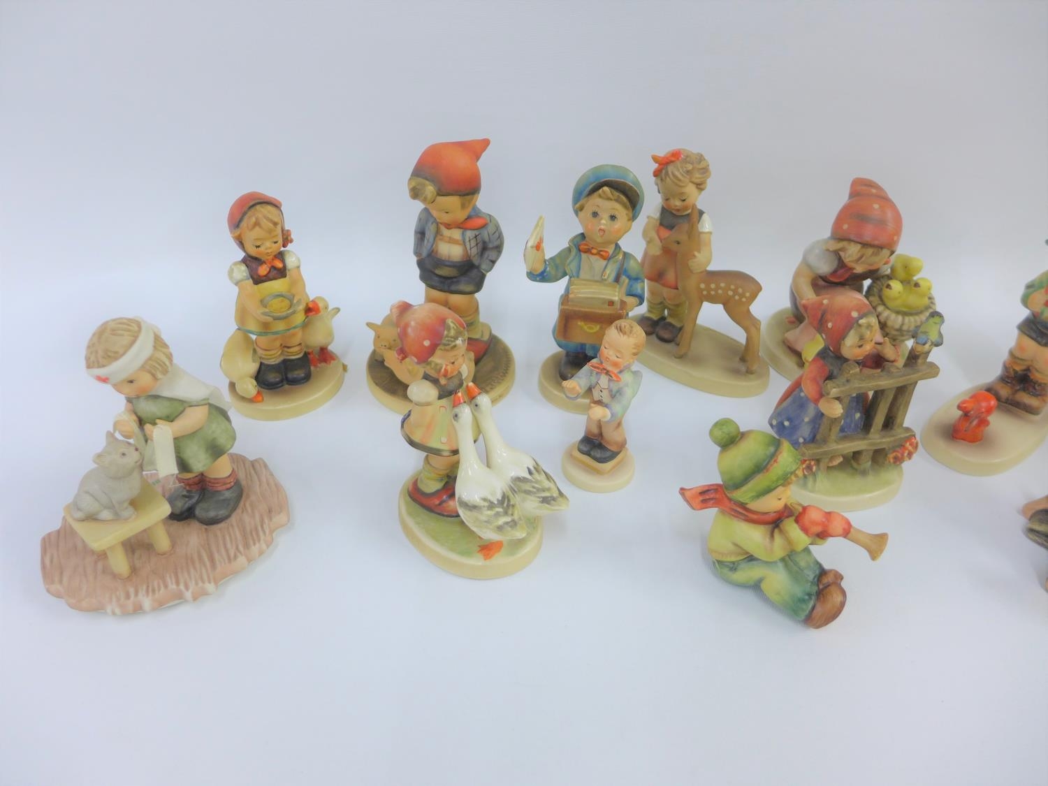 Collection of seventeen various Hummel and Goebel figures to include Little Hiker and Farm Boy etc, tallest 14cm, (17)