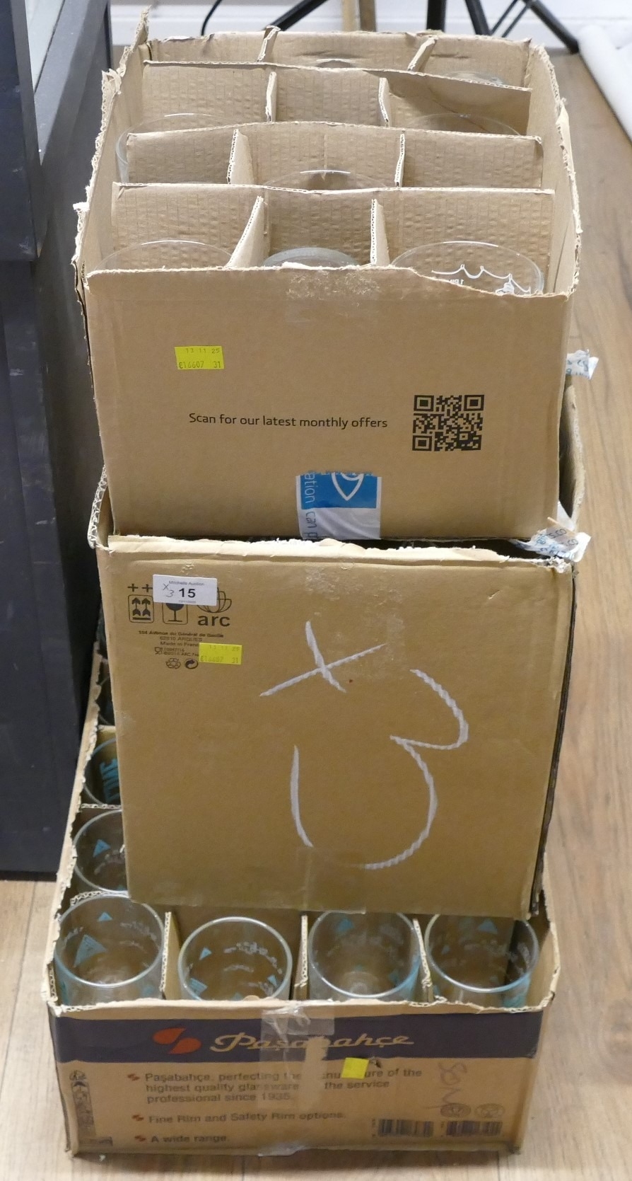 Three boxes of as new brewery glasses, Jennings Fine Line pint, Fullers pint glasses etc