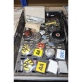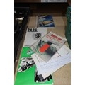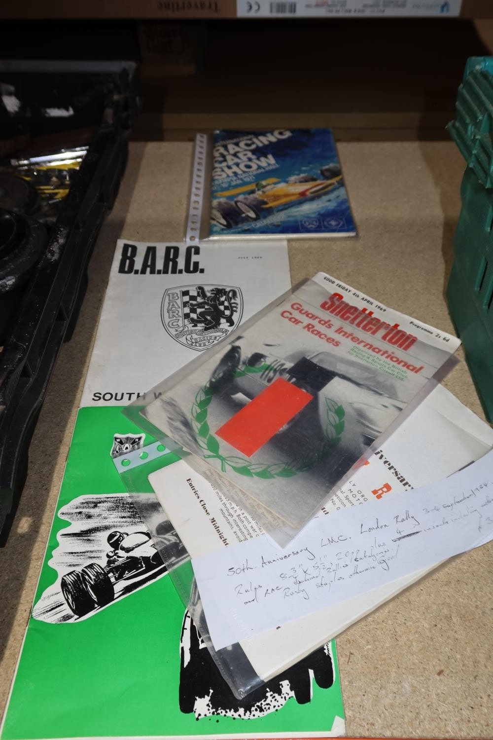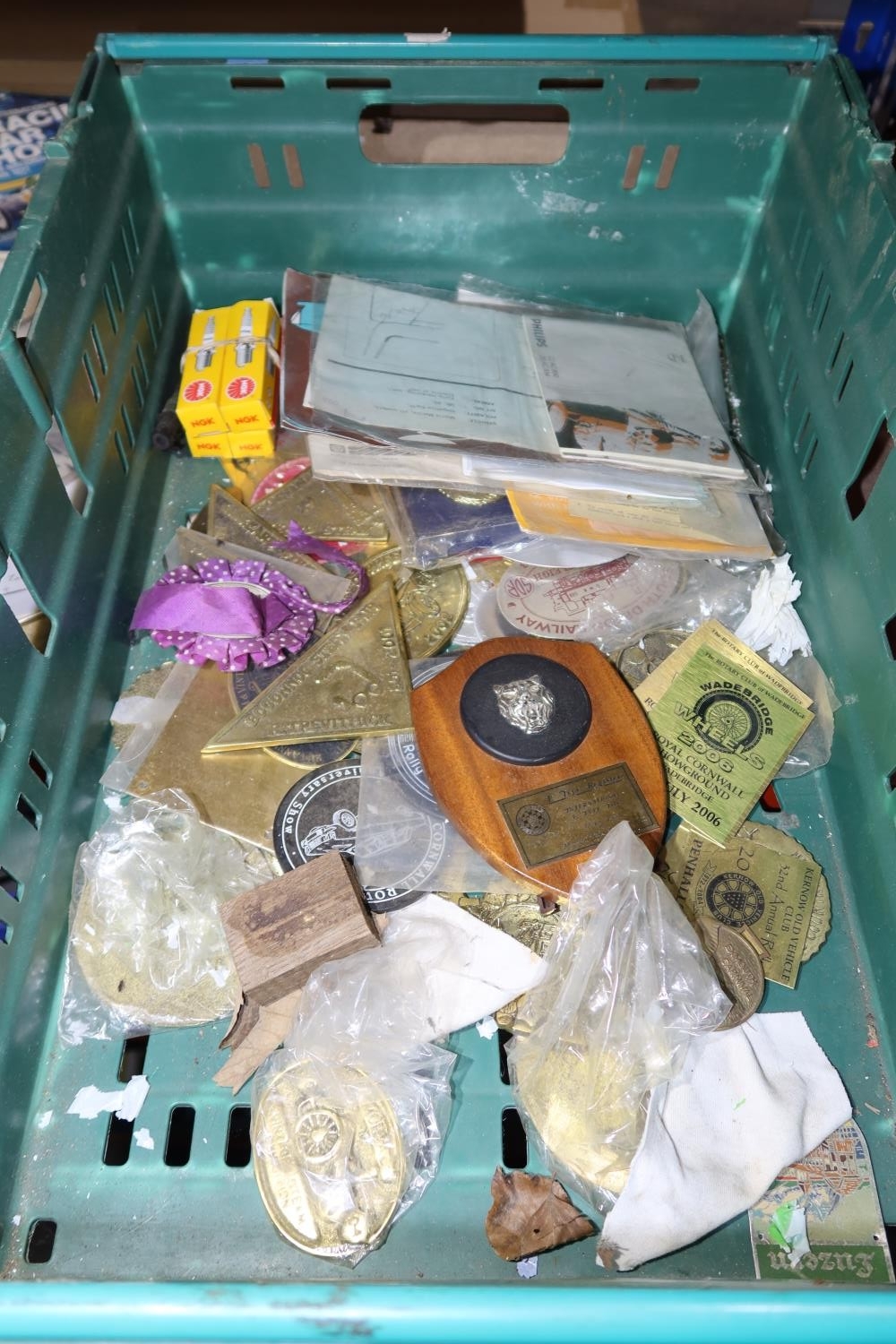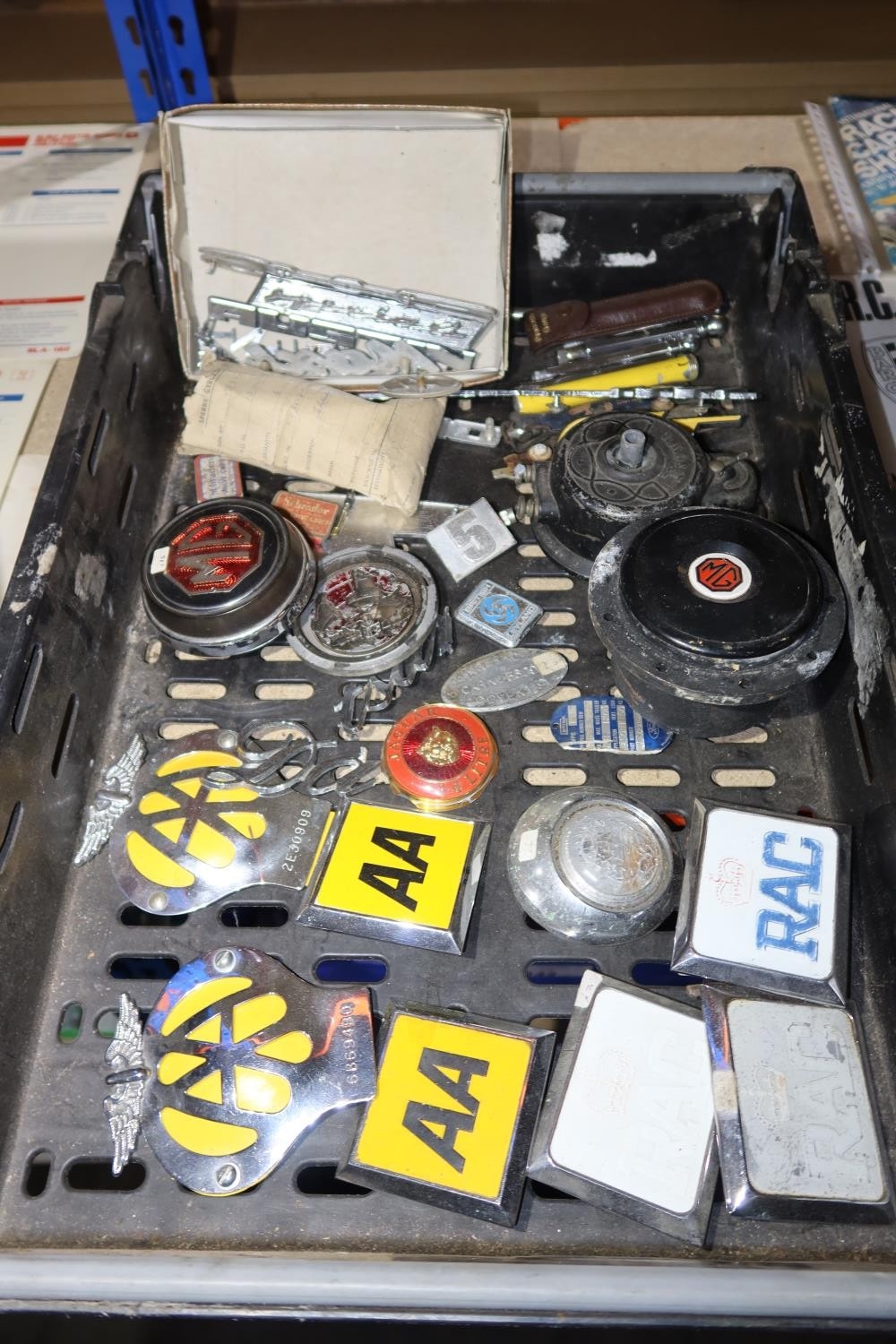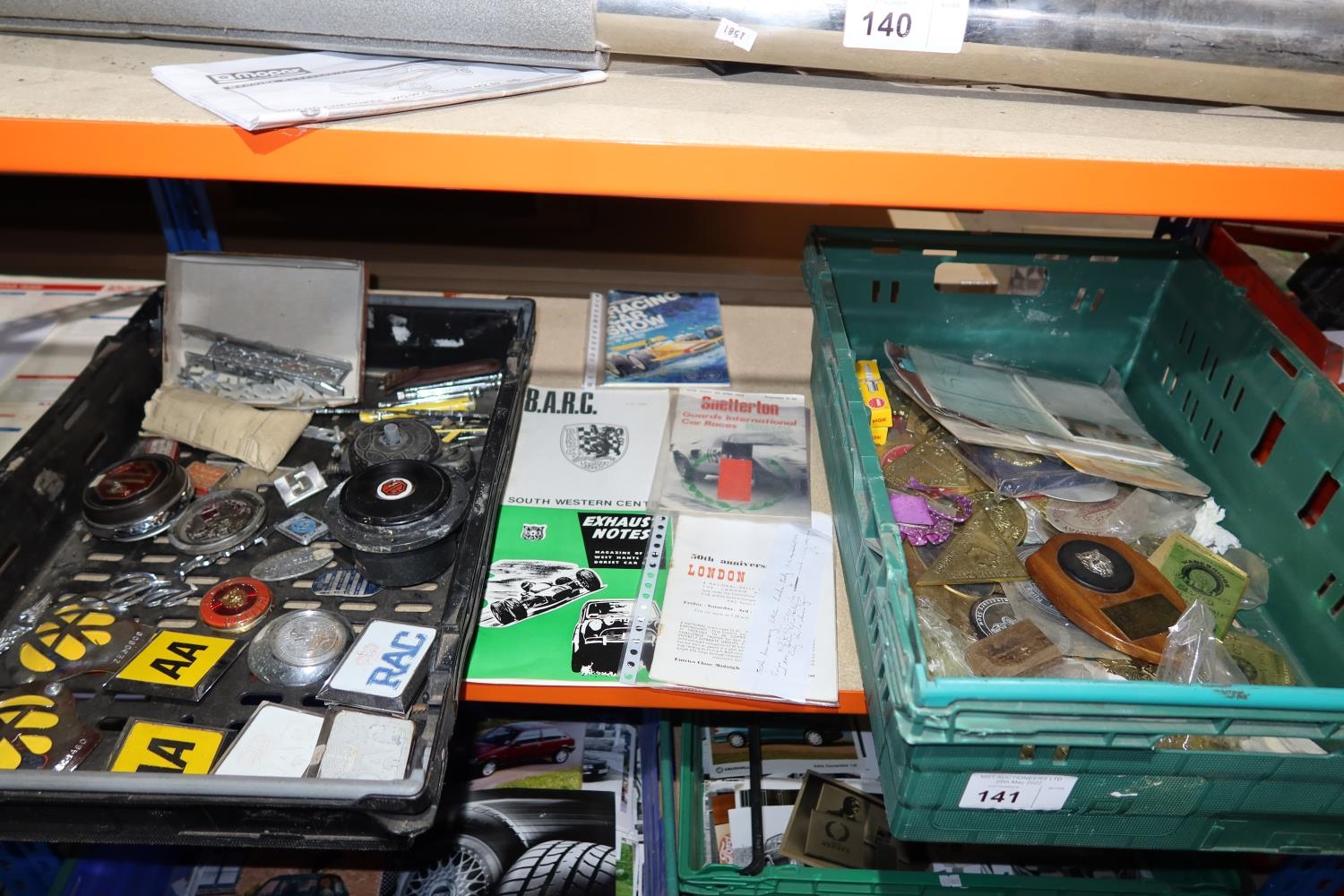 A quantity of various vintage car related items including 2 x AA badges, manufacturers badges, programmes, brochures, brass rally plaques etc. Contents of 1 shelf and the 2 plastic crates are not included