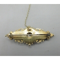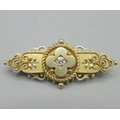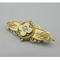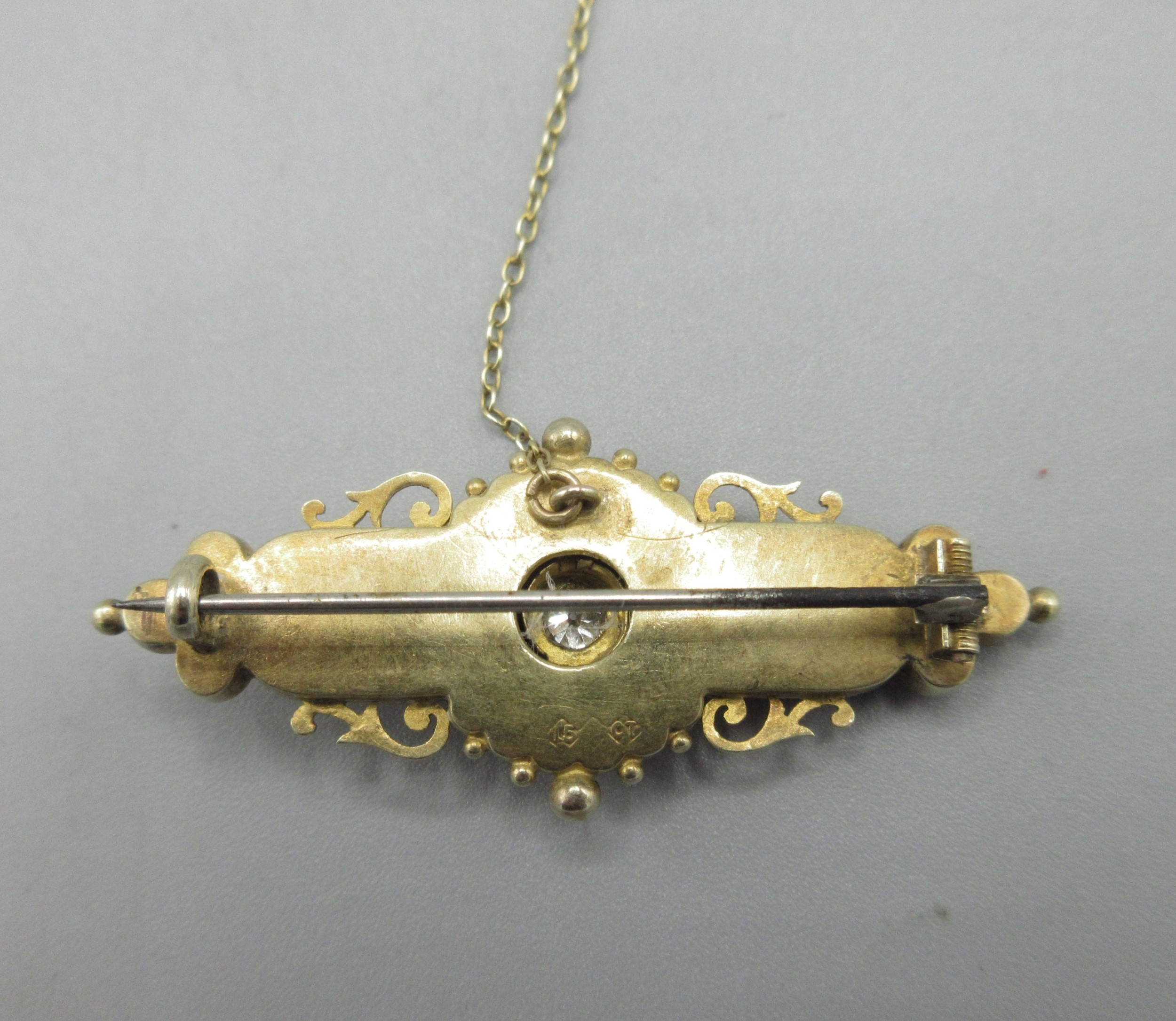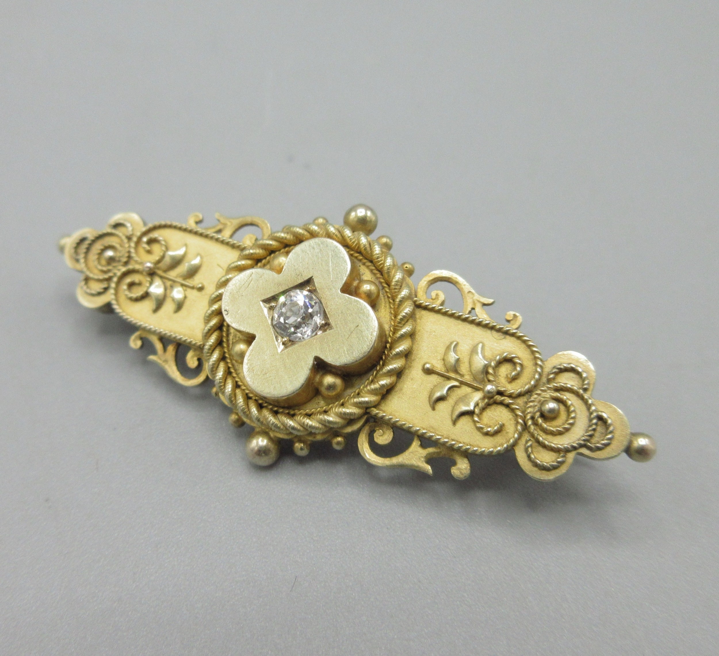15ct gold and diamond Victorian Etruscan revival brooch, central clover-like setting rotates in rope twist border, stamped 15ct, L5cm, 5.8g