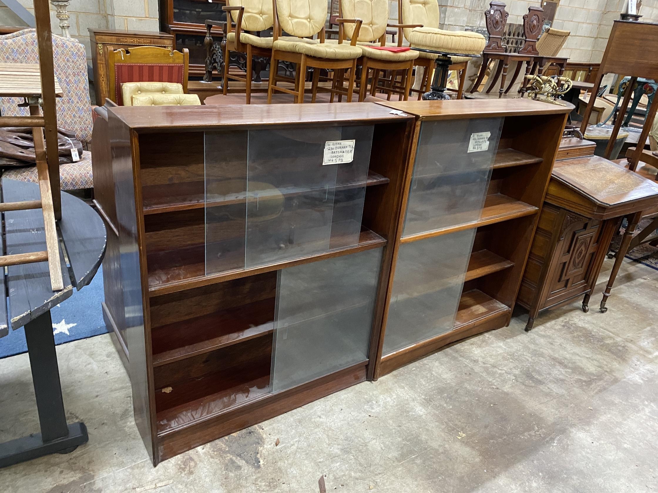 A near pair of mid century bookcases by Herbert E Gibbs, larger width 91cm, depth 24cm, height 112cm