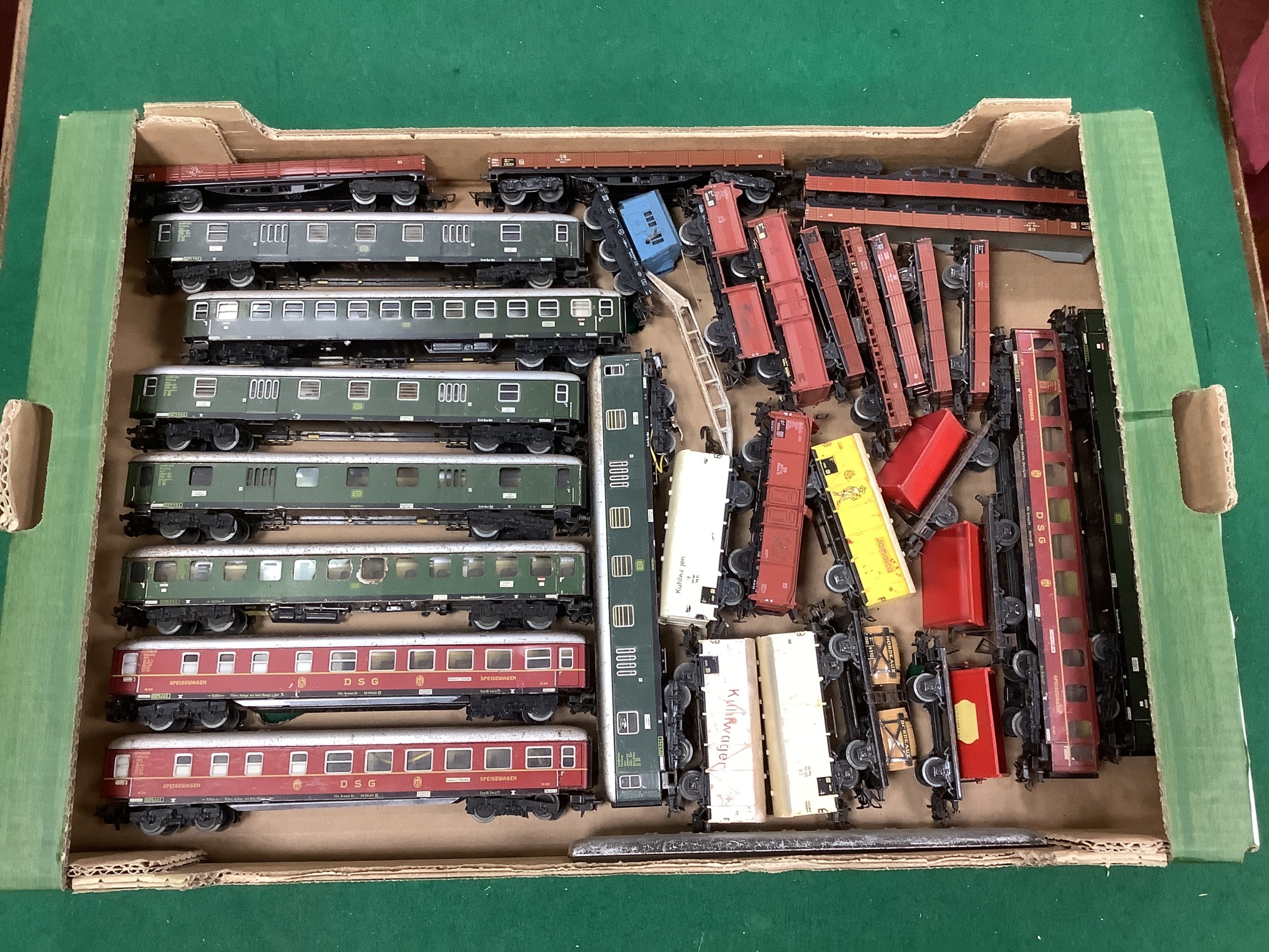 Approximately thirty-one items of Marklin HO scale German rolling stock including ten tinplate coaches (some missing wheels and one missing roof) and twenty-one wagons; all playworn.