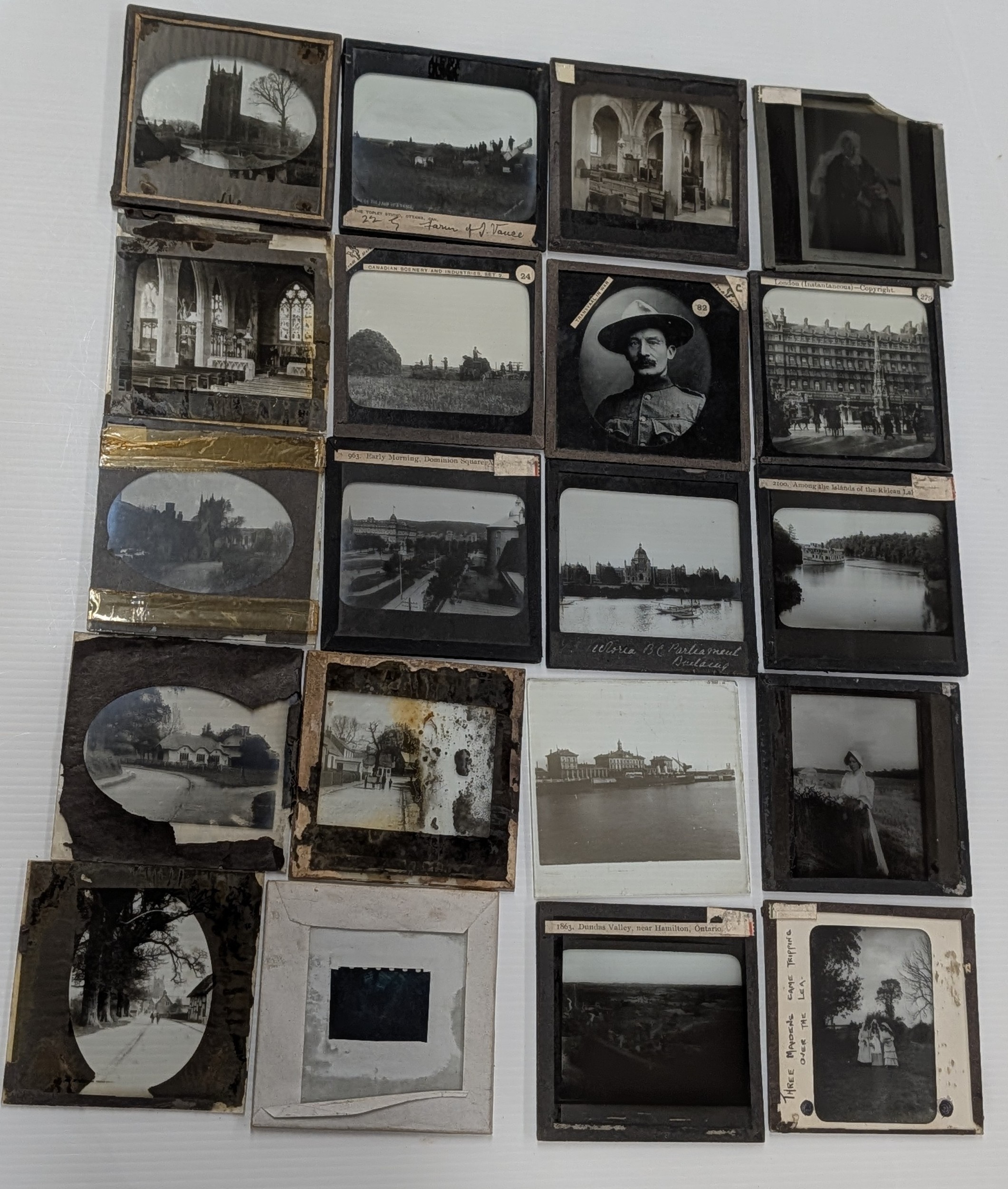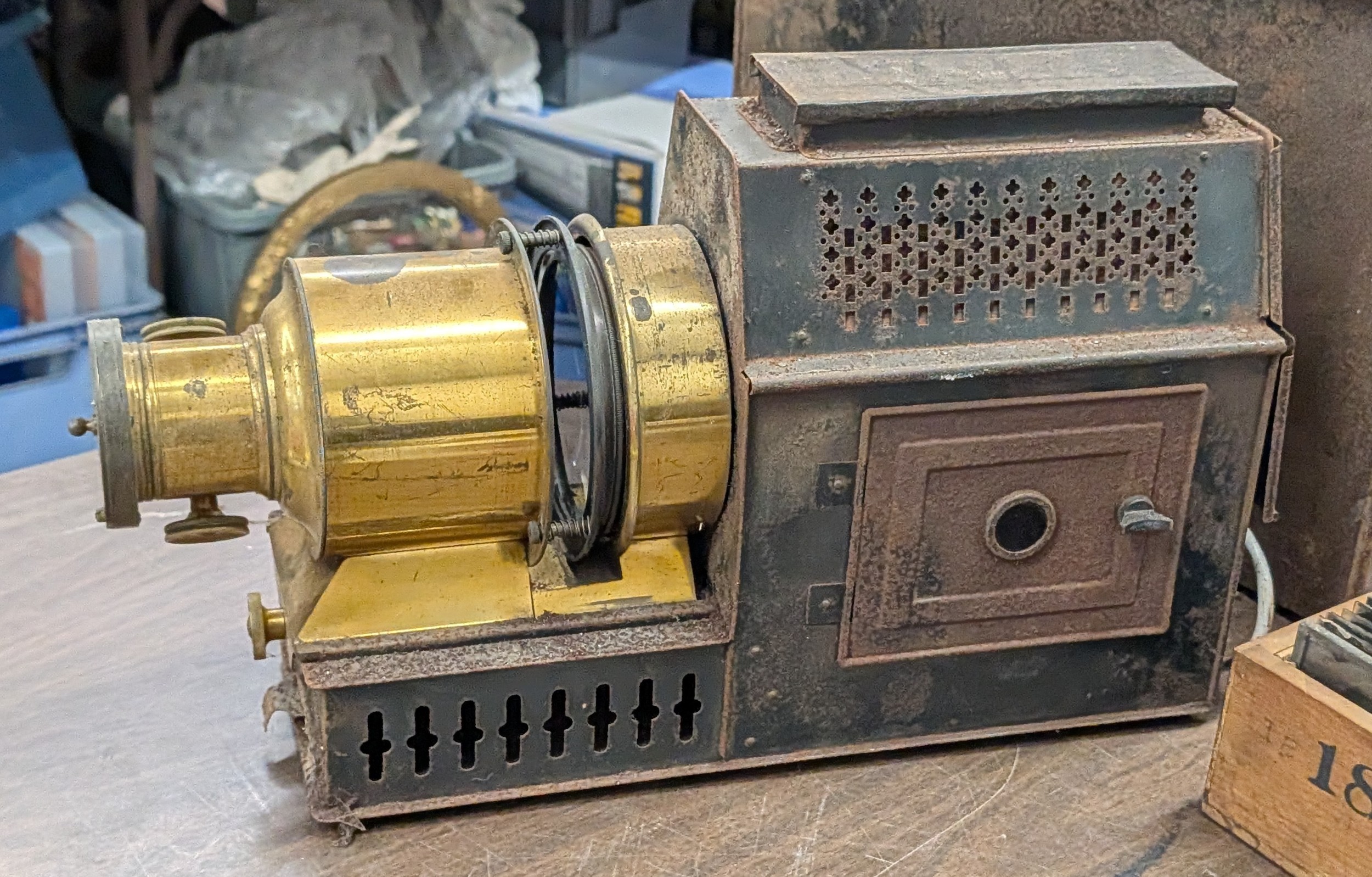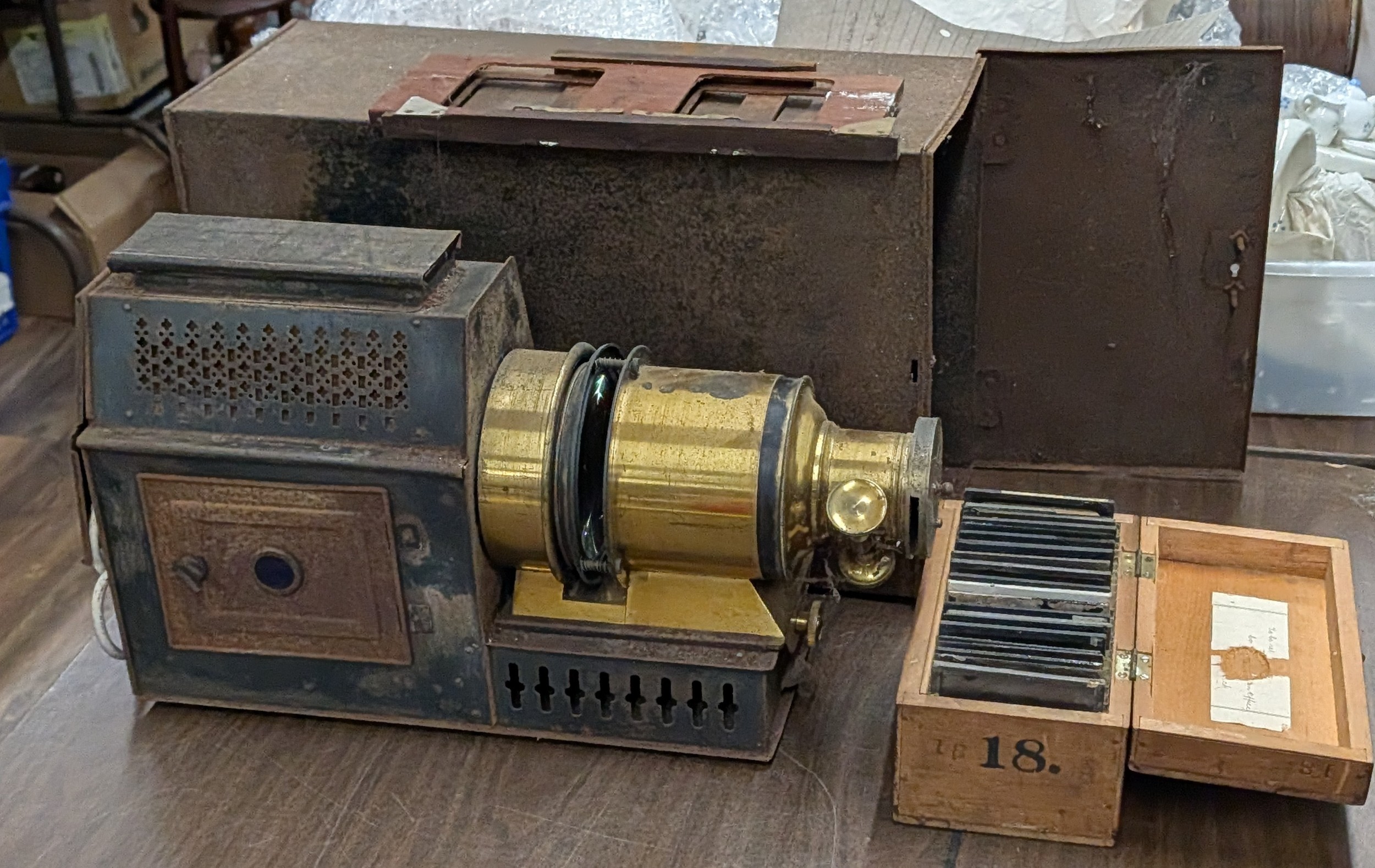 Working Antique Magic Lantern Projector with Metal Case and Collection of Glass Slides