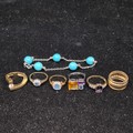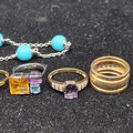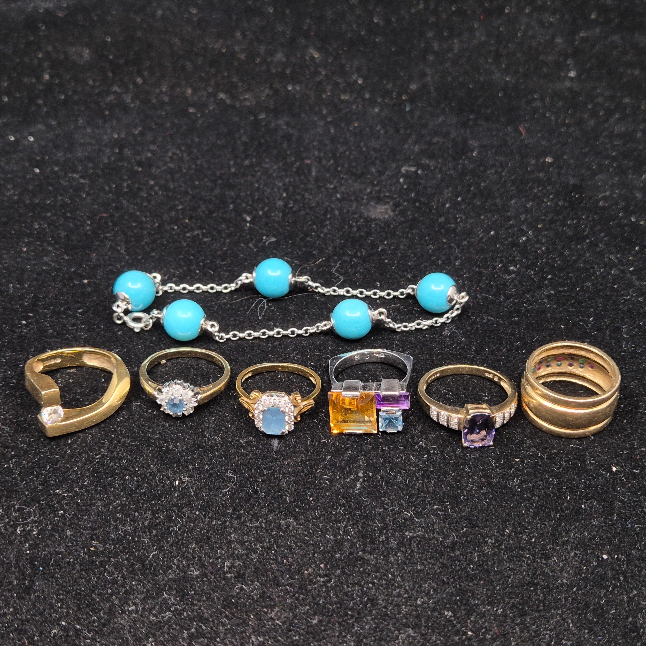 A Mixed Lot of Rings to include 18ct White Gold Citrine, Amethyst and Sapphire Ring Size L (8.92g), 18ct White Gold & Turquoise Bracelet (9.52g), 18t Gold Diamond, Ruby, Emerald and Sapphire Dress Ring (8.18g), 9ct Gold Dress Ring (3g), 2 Stone Set 18ct Gold rings (11.2g) etc