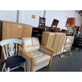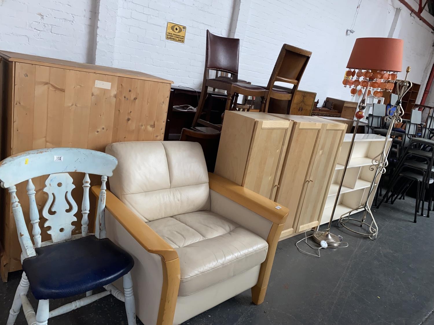 Two pine effect cabinets, a white bookcase, modern leather armchair and two lamps
